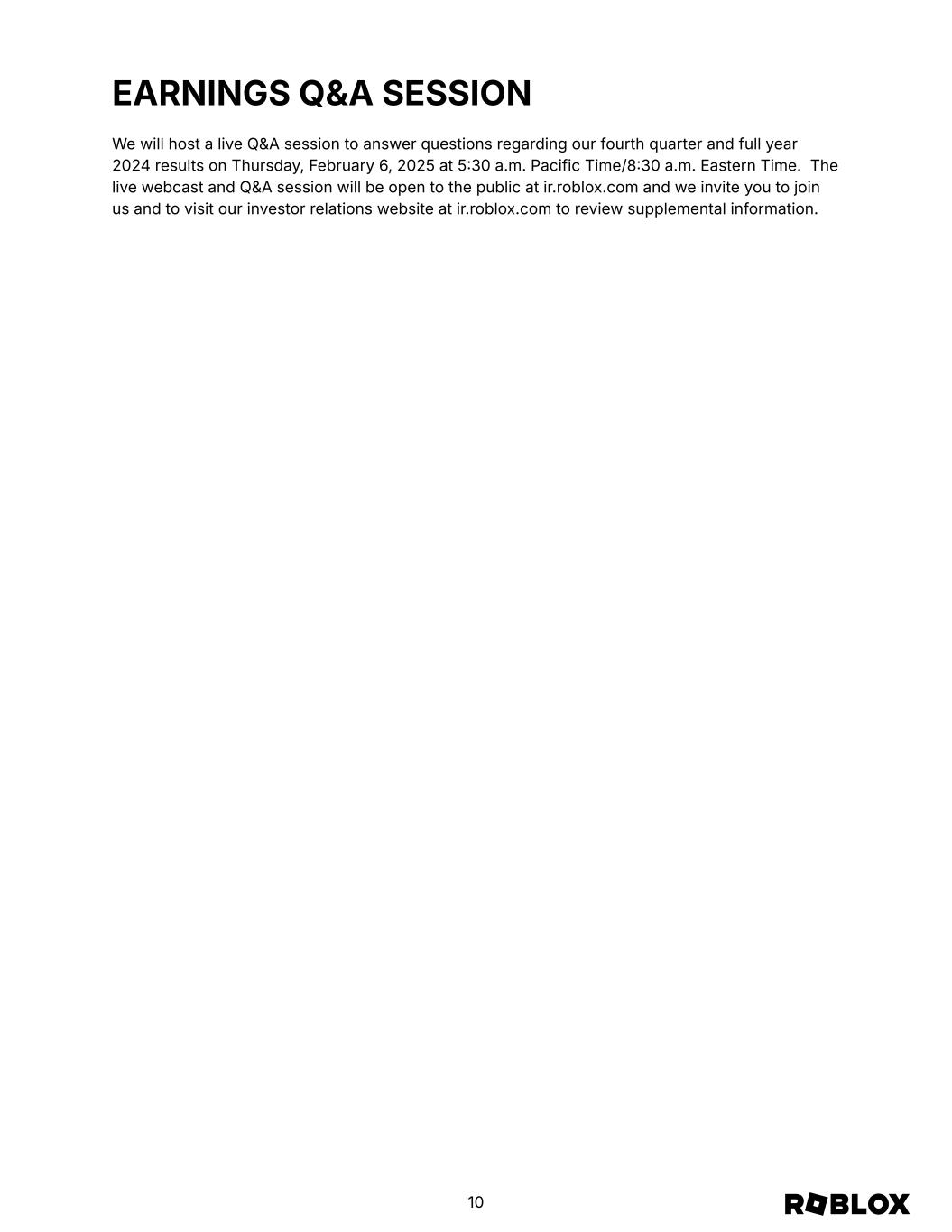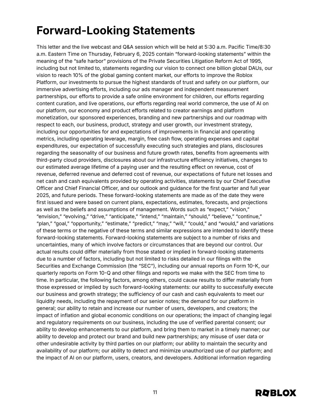 EARNINGS Q&A SESSION We will host a live Q&A session to answer questions regarding our fourth quarter and full year 2024 results on Thursday, February 6, 2025 at 530 a.m. Pacific Time/830 a.m. Eastern Time. The live webcast and Q&A session will be open to the public at ir.roblox.com and we invite you to join us and to visit our investor relations website at ir.roblox.com to review supplemental information. 10