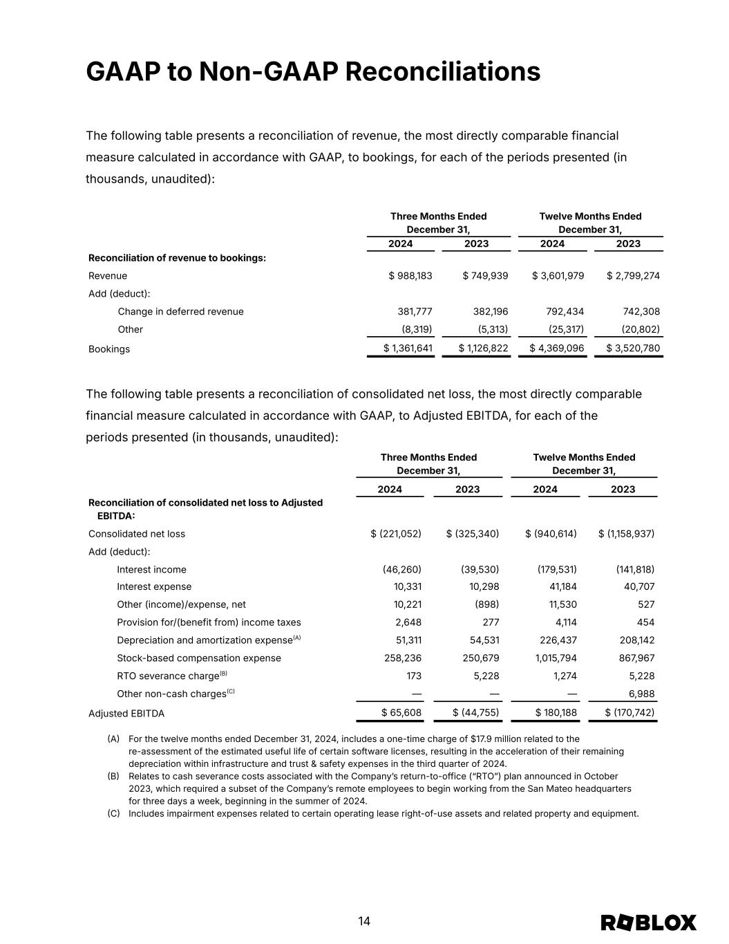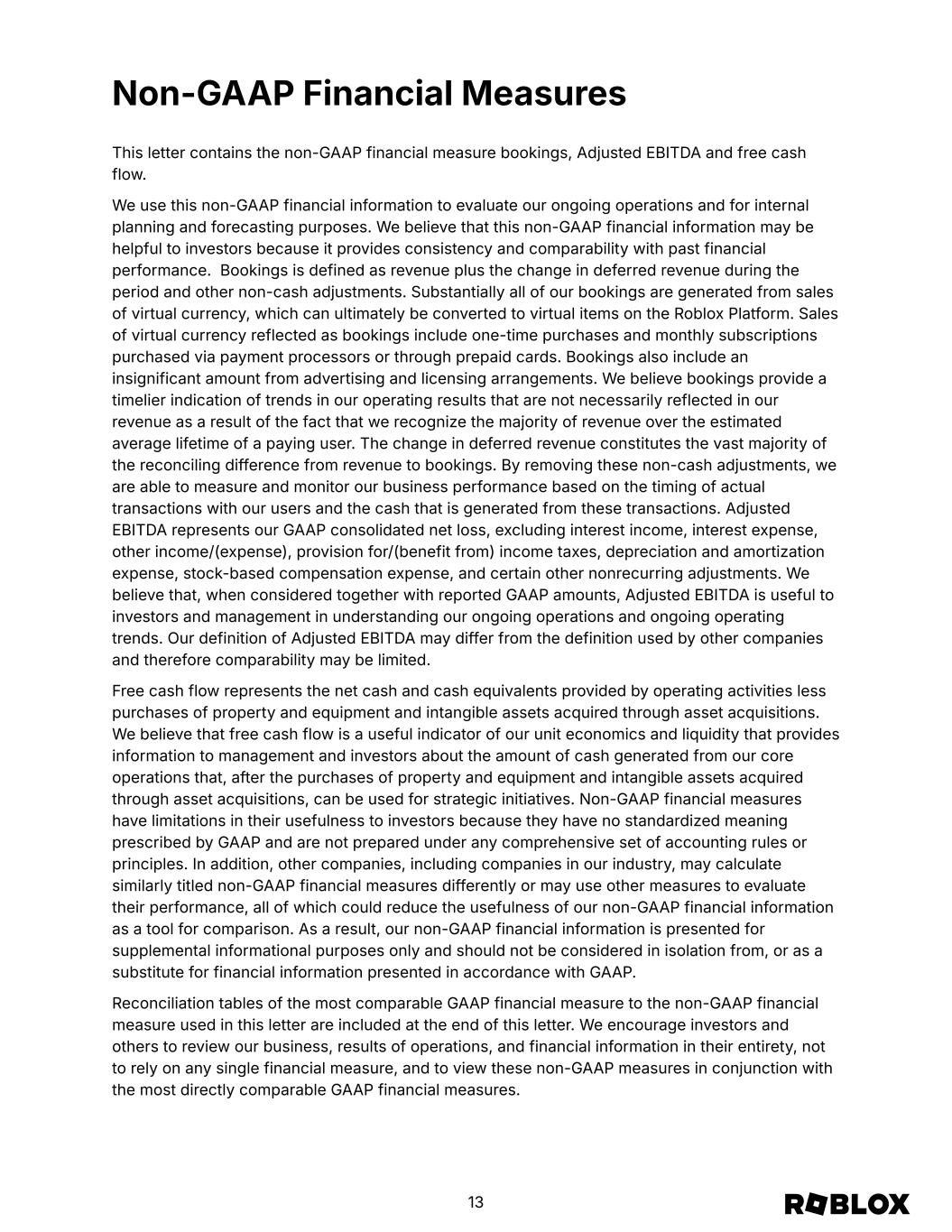 Non-GAAP Financial Measures This letter contains the non-GAAP financial measure bookings, Adjusted EBITDA and free cash flow. We use this non-GAAP financial information to evaluate our ongoing operations and for internal planning and forecasting purposes. We believe that this non-GAAP financial information may be helpful to investors because it provides consistency and comparability with past financial performance. Bookings is defined as revenue plus the change in deferred revenue during the period and other non-cash adjustments. Substantially all of our bookings are generated from sales of virtual currency, which can ultimately be converted to virtual items on the Roblox Platform. Sales of virtual currency reflected as bookings include one-time purchases and monthly subscriptions purchased via payment processors or through prepaid cards. Bookings also include an insignificant amount from advertising and licensing arrangements. We believe bookings provide a timelier indication of trends in our operating results that are not necessarily reflected in our revenue as a result of the fact that we recognize the majority of revenue over the estimated average lifetime of a paying user. The change in deferred revenue constitutes the vast majority of the reconciling difference from revenue to bookings. By removing these non-cash adjustments, we are able to measure and monitor our business performance based on the timing of actual transactions with our users and the cash that is generated from these transactions. Adjusted EBITDA represents our GAAP consolidated net loss, excluding interest income, interest expense, other income/(expense), provision for/(benefit from) income taxes, depreciation and amortization expense, stock-based compensation expense, and certain other nonrecurring adjustments. We believe that, when considered together with reported GAAP amounts, Adjusted EBITDA is useful to investors and management in understanding our ongoing operations and ongoing operating trends. Our definition of Adjusted EBITDA may differ from the definition used by other companies and therefore comparability may be limited. Free cash flow represents the net cash and cash equivalents provided by operating activities less purchases of property and equipment and intangible assets acquired through asset acquisitions. We believe that free cash flow is a useful indicator of our unit economics and liquidity that provides information to management and investors about the amount of cash generated from our core operations that, after the purchases of property and equipment and intangible assets acquired through asset acquisitions, can be used for strategic initiatives. Non-GAAP financial measures have limitations in their usefulness to investors because they have no standardized meaning prescribed by GAAP and are not prepared under any comprehensive set of accounting rules or principles. In addition, other companies, including companies in our industry, may calculate similarly titled non-GAAP financial measures differently or may use other measures to evaluate their performance, all of which could reduce the usefulness of our non-GAAP financial information as a tool for comparison. As a result, our non-GAAP financial information is presented for supplemental informational purposes only and should not be considered in isolation from, or as a substitute for financial information presented in accordance with GAAP. Reconciliation tables of the most comparable GAAP financial measure to the non-GAAP financial measure used in this letter are included at the end of this letter. We encourage investors and others to review our business, results of operations, and financial information in their entirety, not to rely on any single financial measure, and to view these non-GAAP measures in conjunction with the most directly comparable GAAP financial measures. 13