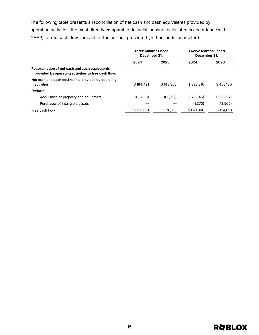 The following table presents a reconciliation of net cash and cash equivalents provided by operating activities, the most directly comparable financial measure calculated in accordance with GAAP, to free cash flow, for each of the periods presented (in thousands, unaudited): Three Months Ended December 31, Twelve Months Ended December 31, 2024 2023 2024 2023 Reconciliation of net cash and cash equivalents provided by operating activities to free cash flow: Net cash and cash equivalents provided by operating activities $ 184,491 $ 143,305 $ 822,316 $ 458,180 Deduct: Acquisition of property and equipment 63,860 65,197 179,646 320,667 Purchases of intangible assets — — 1,370 13,500 Free cash flow $ 120,631 $ 78,108 $ 641,300 $ 124,013 15