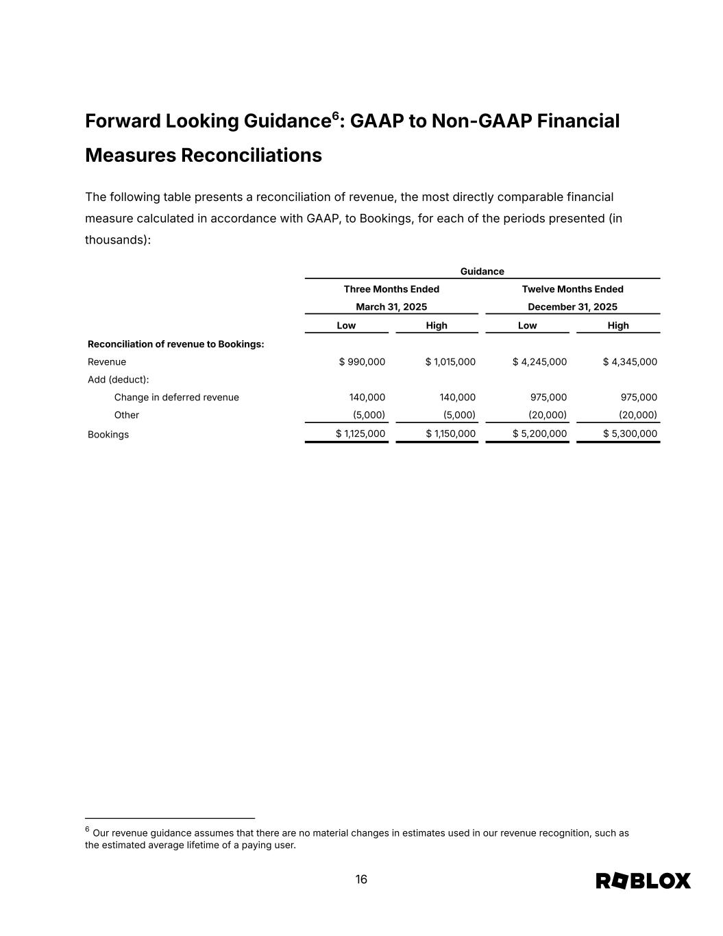Forward Looking Guidance6: GAAP to Non-GAAP Financial Measures Reconciliations The following table presents a reconciliation of revenue, the most directly comparable financial measure calculated in accordance with GAAP, to Bookings, for each of the periods presented (in thousands): Guidance Three Months Ended Twelve Months Ended March 31, 2025 December 31, 2025 Low High Low High Reconciliation of revenue to Bookings: Revenue $ 990,000 $ 1,015,000 $ 4,245,000 $ 4,345,000 Add (deduct): Change in deferred revenue 140,000 140,000 975,000 975,000 Other 5,000 5,000 20,000 20,000 Bookings $ 1,125,000 $ 1,150,000 $ 5,200,000 $ 5,300,000 6 Our revenue guidance assumes that there are no material changes in estimates used in our revenue recognition, such as the estimated average lifetime of a paying user. 16