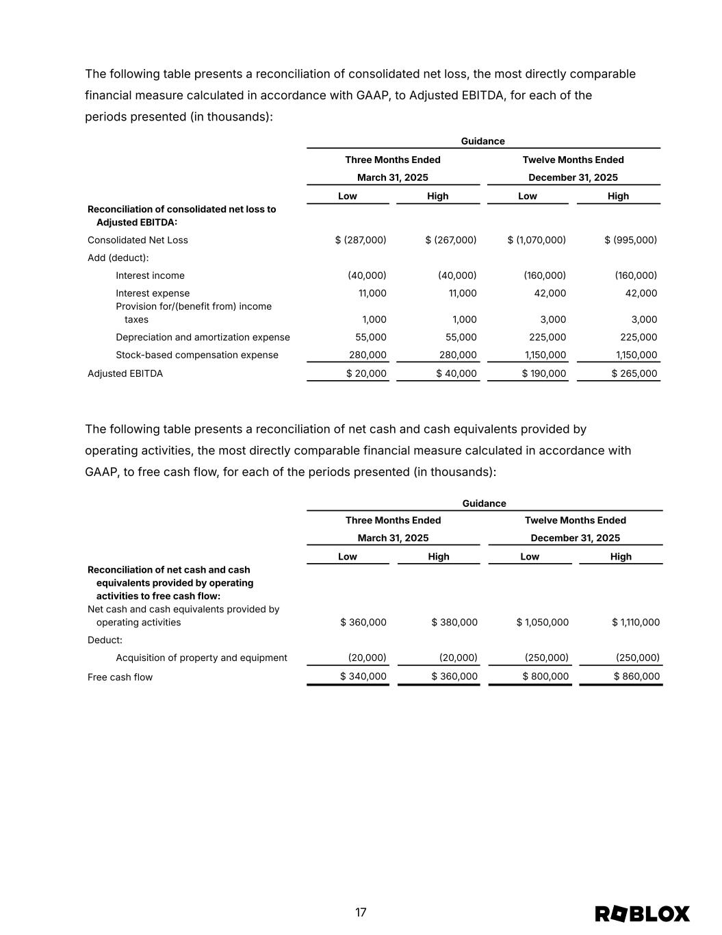 The following table presents a reconciliation of consolidated net loss, the most directly comparable financial measure calculated in accordance with GAAP, to Adjusted EBITDA, for each of the periods presented (in thousands): Guidance Three Months Ended Twelve Months Ended March 31, 2025 December 31, 2025 Low High Low High Reconciliation of consolidated net loss to Adjusted EBITDA Consolidated Net Loss $ 287,000 $ 267,000 $ 1,070,000 $ 995,000 Add (deduct): Interest income 40,000 40,000 160,000 160,000 Interest expense 11,000 11,000 42,000 42,000 Provision for/(benefit from) income taxes 1,000 1,000 3,000 3,000 Depreciation and amortization expense 55,000 55,000 225,000 225,000 Stock-based compensation expense 280,000 280,000 1,150,000 1,150,000 Adjusted EBITDA $ 20,000 $ 40,000 $ 190,000 $ 265,000 The following table presents a reconciliation of net cash and cash equivalents provided by operating activities, the most directly comparable financial measure calculated in accordance with GAAP, to free cash flow, for each of the periods presented (in thousands): Guidance Three Months Ended Twelve Months Ended March 31, 2025 December 31, 2025 Low High Low High Reconciliation of net cash and cash equivalents provided by operating activities to free cash flow: Net cash and cash equivalents provided by operating activities $ 360,000 $ 380,000 $ 1,050,000 $ 1,110,000 Deduct: Acquisition of property and equipment 20,000 20,000 250,000 250,000 Free cash flow $ 340,000 $ 360,000 $ 800,000 $ 860,000 17