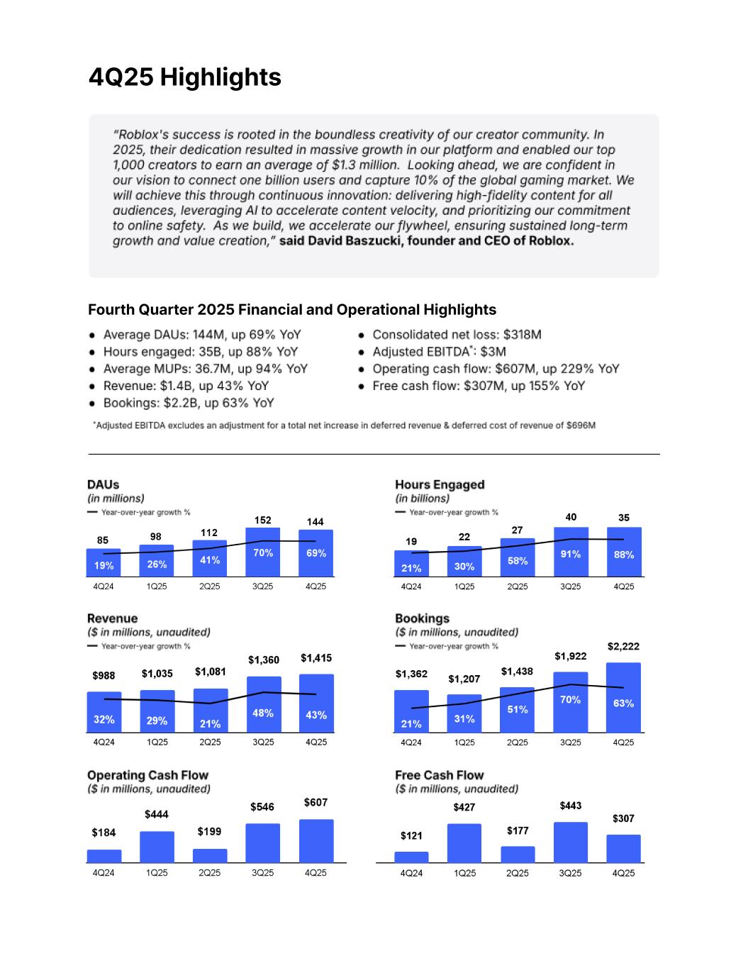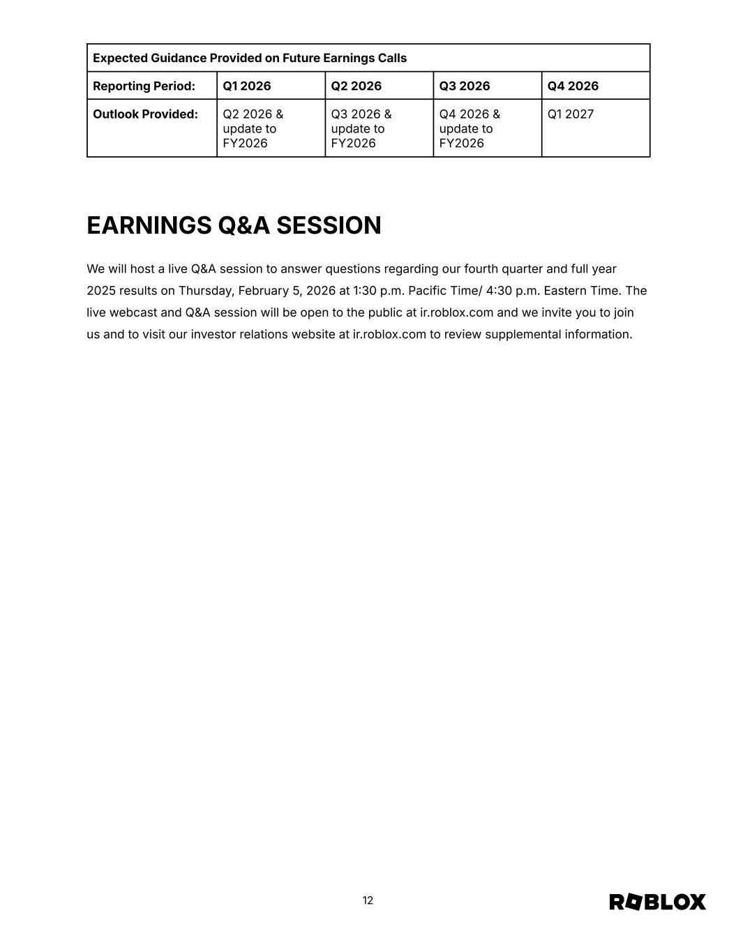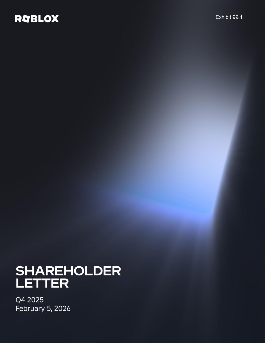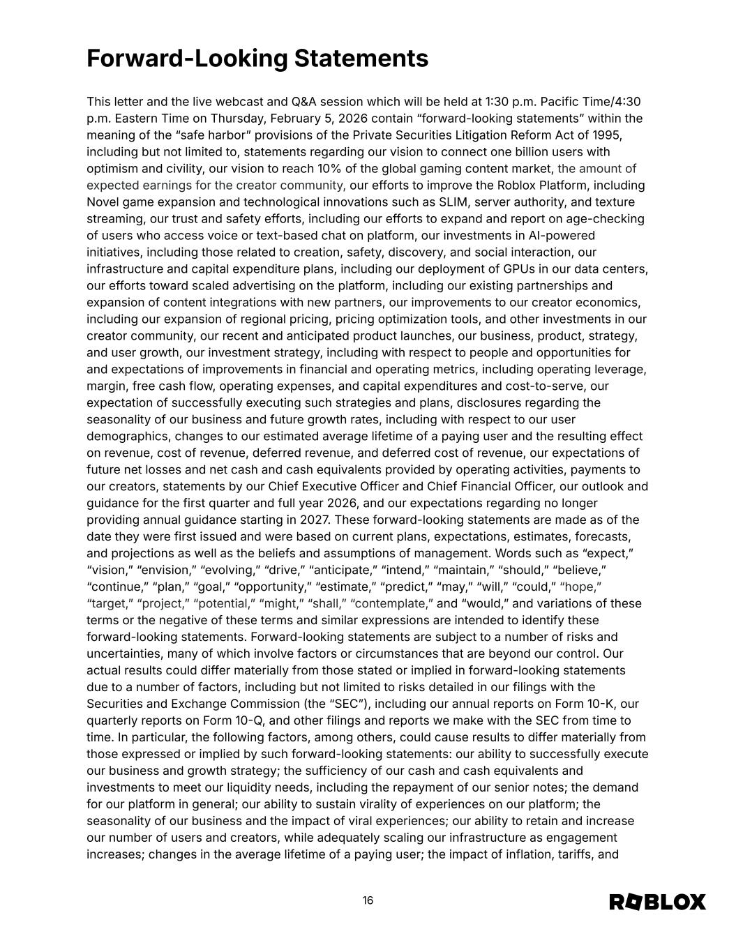 Forward-Looking Statements This letter and the live webcast and Q&A session which will be held at 1:30 p.m. Pacific Time/4:30 p.m. Eastern Time on Thursday, February 5, 2026 contain “forward-looking statements” within the meaning of the “safe harbor” provisions of the Private Securities Litigation Reform Act of 1995, including but not limited to, statements regarding our vision to connect one billion users with optimism and civility, our vision to reach 10% of the global gaming content market, the amount of expected earnings for the creator community, our efforts to improve the Roblox Platform, including Novel game expansion and technological innovations such as SLIM, server authority, and texture streaming, our trust and safety efforts, including our efforts to expand and report on age-checking of users who access voice or text-based chat on platform, our investments in AI-powered initiatives, including those related to creation, safety, discovery, and social interaction, our infrastructure and capital expenditure plans, including our deployment of GPUs in our data centers, our efforts toward scaled advertising on the platform, including our existing partnerships and expansion of content integrations with new partners, our improvements to our creator economics, including our expansion of regional pricing, pricing optimization tools, and other investments in our creator community, our recent and anticipated product launches, our business, product, strategy, and user growth, our investment strategy, including with respect to people and opportunities for and expectations of improvements in financial and operating metrics, including operating leverage, margin, free cash flow, operating expenses, and capital expenditures and cost-to-serve, our expectation of successfully executing such strategies and plans, disclosures regarding the seasonality of our business and future growth rates, including with respect to our user demographics, changes to our estimated average lifetime of a paying user and the resulting effect on revenue, cost of revenue, deferred revenue, and deferred cost of revenue, our expectations of future net losses and net cash and cash equivalents provided by operating activities, payments to our creators, statements by our Chief Executive Officer and Chief Financial Officer, our outlook and guidance for the first quarter and full year 2026, and our expectations regarding no longer providing annual guidance starting in 2027. These forward-looking statements are made as of the date they were first issued and were based on current plans, expectations, estimates, forecasts, and projections as well as the beliefs and assumptions of management. Words such as “expect,” “vision,” “envision,” “evolving,” “drive,” “anticipate,” “intend,” “maintain,” “should,” “believe,” “continue,” “plan,” “goal,” “opportunity,” “estimate,” “predict,” “may,” “will,” “could,” “hope,” “target,” “project,” “potential,” “might,” “shall,” “contemplate,” and “would,” and variations of these terms or the negative of these terms and similar expressions are intended to identify these forward-looking statements. Forward-looking statements are subject to a number of risks and uncertainties, many of which involve factors or circumstances that are beyond our control. Our actual results could differ materially from those stated or implied in forward-looking statements due to a number of factors, including but not limited to risks detailed in our filings with the Securities and Exchange Commission (the “SEC”), including our annual reports on Form 10-K, our quarterly reports on Form 10-Q, and other filings and reports we make with the SEC from time to time. In particular, the following factors, among others, could cause results to differ materially from those expressed or implied by such forward-looking statements: our ability to successfully execute our business and growth strategy; the sufficiency of our cash and cash equivalents and investments to meet our liquidity needs, including the repayment of our senior notes; the demand for our platform in general; our ability to sustain virality of experiences on our platform; the seasonality of our business and the impact of viral experiences; our ability to retain and increase our number of users and creators, while adequately scaling our infrastructure as engagement increases; changes in the average lifetime of a paying user; the impact of inflation, tariffs, and 16