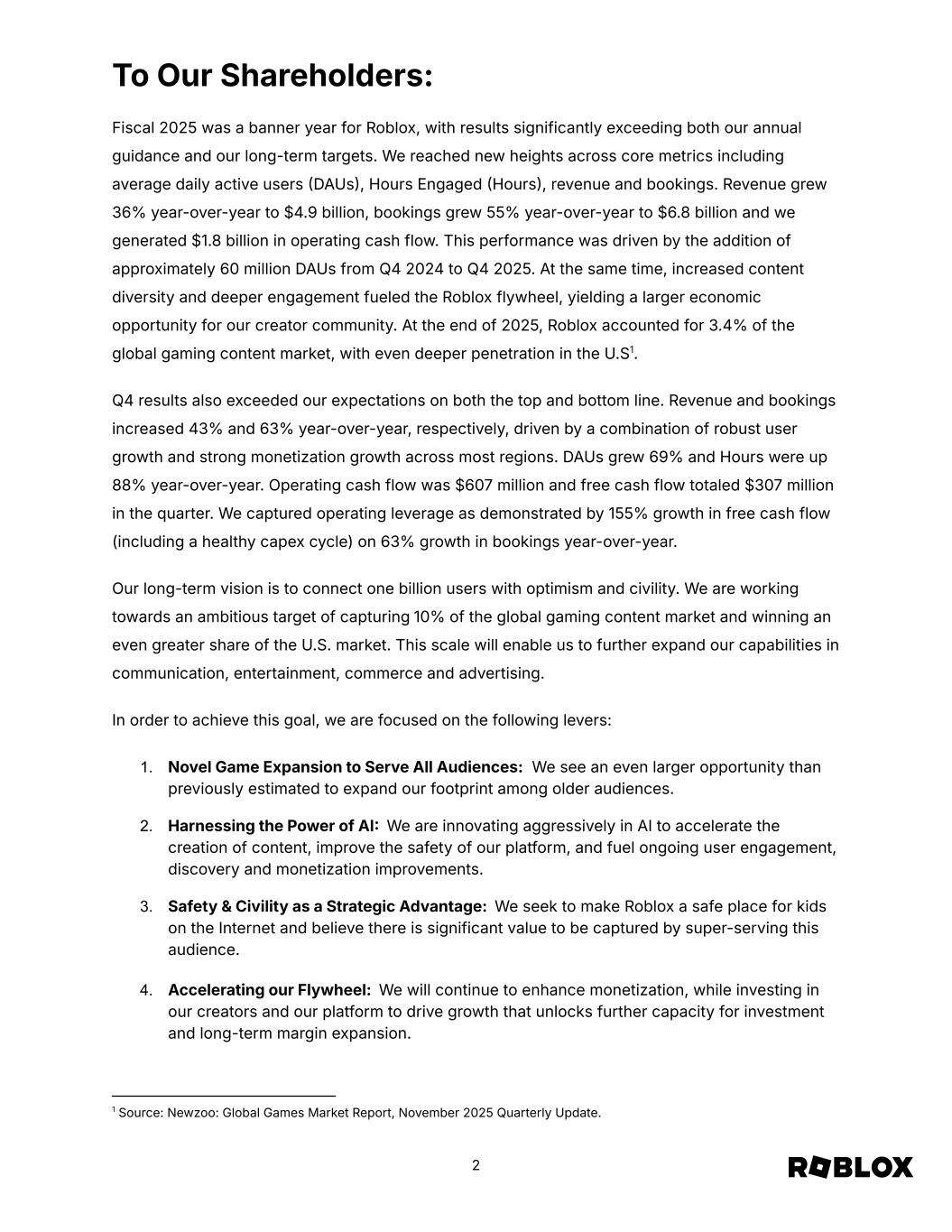 To Our Shareholders: Fiscal 2025 was a banner year for Roblox, with results significantly exceeding both our annual guidance and our long-term targets. We reached new heights across core metrics including average daily active users (DAUs), Hours Engaged (Hours), revenue and bookings. Revenue grew 36% year-over-year to $4.9 billion, bookings grew 55% year-over-year to $6.8 billion and we generated $1.8 billion in operating cash flow. This performance was driven by the addition of approximately 60 million DAUs from Q4 2024 to Q4 2025. At the same time, increased content diversity and deeper engagement fueled the Roblox flywheel, yielding a larger economic opportunity for our creator community. At the end of 2025, Roblox accounted for 3.4% of the global gaming content market, with even deeper penetration in the U.S1. Q4 results also exceeded our expectations on both the top and bottom line. Revenue and bookings increased 43% and 63% year-over-year, respectively, driven by a combination of robust user growth and strong monetization growth across most regions. DAUs grew 69% and Hours were up 88% year-over-year. Operating cash flow was $607 million and free cash flow totaled $307 million in the quarter. We captured operating leverage as demonstrated by 155% growth in free cash flow (including a healthy capex cycle) on 63% growth in bookings year-over-year. Our long-term vision is to connect one billion users with optimism and civility. We are working towards an ambitious target of capturing 10% of the global gaming content market and winning an even greater share of the U.S. market. This scale will enable us to further expand our capabilities in communication, entertainment, commerce and advertising. In order to achieve this goal, we are focused on the following levers: 1.​ Novel Game Expansion to Serve All Audiences: We see an even larger opportunity than previously estimated to expand our footprint among older audiences. 2.​ Harnessing the Power of AI: We are innovating aggressively in AI to accelerate the creation of content, improve the safety of our platform, and fuel ongoing user engagement, discovery and monetization improvements. 3.​ Safety & Civility as a Strategic Advantage: We seek to make Roblox a safe place for kids on the Internet and believe there is significant value to be captured by super-serving this audience. 4.​ Accelerating our Flywheel: We will continue to enhance monetization, while investing in our creators and our platform to drive growth that unlocks further capacity for investment and long-term margin expansion. 1 Source: Newzoo: Global Games Market Report, November 2025 Quarterly Update. 2