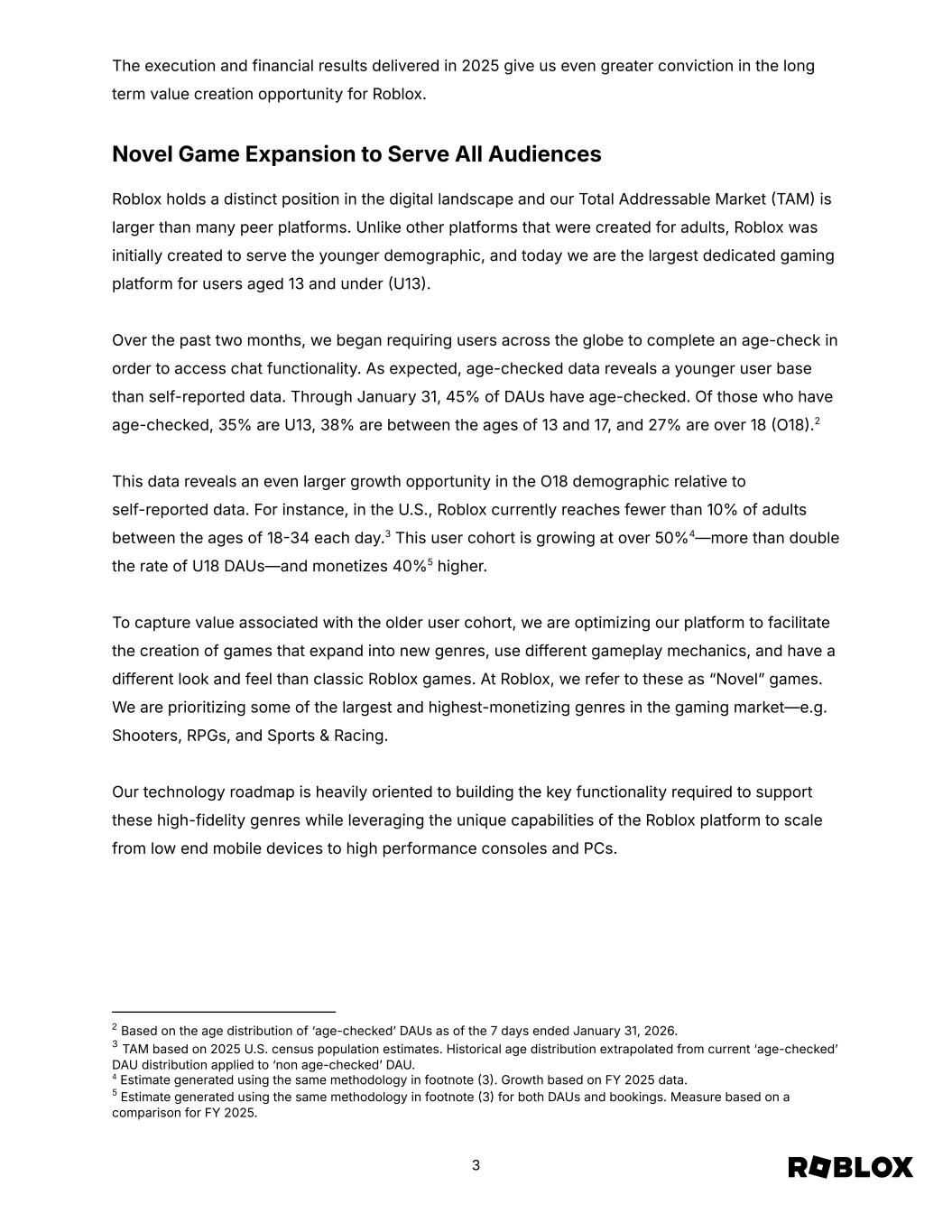 The execution and financial results delivered in 2025 give us even greater conviction in the long term value creation opportunity for Roblox. Novel Game Expansion to Serve All Audiences Roblox holds a distinct position in the digital landscape and our Total Addressable Market (TAM) is larger than many peer platforms. Unlike other platforms that were created for adults, Roblox was initially created to serve the younger demographic, and today we are the largest dedicated gaming platform for users aged 13 and under (U13). Over the past two months, we began requiring users across the globe to complete an age-check in order to access chat functionality. As expected, age-checked data reveals a younger user base than self-reported data. Through January 31, 45% of DAUs have age-checked. Of those who have age-checked, 35% are U13, 38% are between the ages of 13 and 17, and 27% are over 18 (O18).2 This data reveals an even larger growth opportunity in the O18 demographic relative to self-reported data. For instance, in the U.S., Roblox currently reaches fewer than 10% of adults between the ages of 18-34 each day.3 This user cohort is growing at over 50%4—more than double the rate of U18 DAUs—and monetizes 40%5 higher. To capture value associated with the older user cohort, we are optimizing our platform to facilitate the creation of games that expand into new genres, use different gameplay mechanics, and have a different look and feel than classic Roblox games. At Roblox, we refer to these as “Novel” games. We are prioritizing some of the largest and highest-monetizing genres in the gaming market—e.g. Shooters, RPGs, and Sports & Racing. Our technology roadmap is heavily oriented to building the key functionality required to support these high-fidelity genres while leveraging the unique capabilities of the Roblox platform to scale from low end mobile devices to high performance consoles and PCs. 5 Estimate generated using the same methodology in footnote (3) for both DAUs and bookings. Measure based on a comparison for FY 2025. 4 Estimate generated using the same methodology in footnote (3). Growth based on FY 2025 data. 3 TAM based on 2025 U.S. census population estimates. Historical age distribution extrapolated from current ‘age-checked’ DAU distribution applied to ‘non age-checked’ DAU. 2 Based on the age distribution of ‘age-checked’ DAUs as of the 7 days ended January 31, 2026. 3