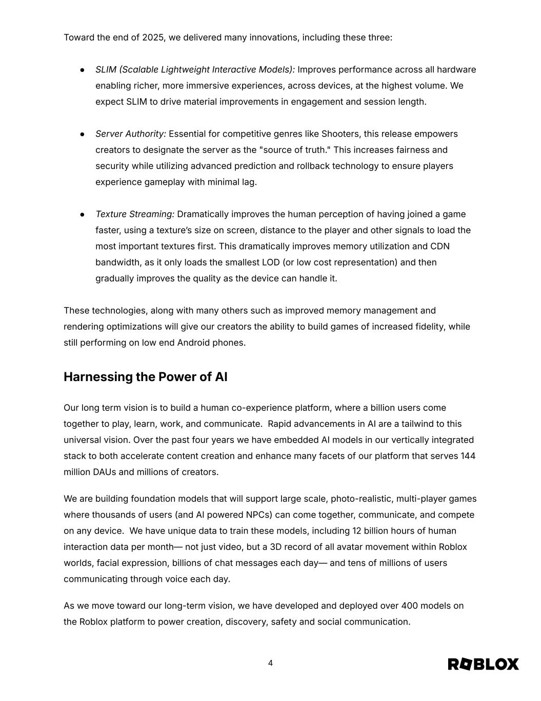 Toward the end of 2025, we delivered many innovations, including these three: ●​ SLIM (Scalable Lightweight Interactive Models): Improves performance across all hardware enabling richer, more immersive experiences, across devices, at the highest volume. We expect SLIM to drive material improvements in engagement and session length. ●​ Server Authority: Essential for competitive genres like Shooters, this release empowers creators to designate the server as the "source of truth." This increases fairness and security while utilizing advanced prediction and rollback technology to ensure players experience gameplay with minimal lag. ●​ Texture Streaming: Dramatically improves the human perception of having joined a game faster, using a texture’s size on screen, distance to the player and other signals to load the most important textures first. This dramatically improves memory utilization and CDN bandwidth, as it only loads the smallest LOD (or low cost representation) and then gradually improves the quality as the device can handle it. These technologies, along with many others such as improved memory management and rendering optimizations will give our creators the ability to build games of increased fidelity, while still performing on low end Android phones. Harnessing the Power of AI Our long term vision is to build a human co-experience platform, where a billion users come together to play, learn, work, and communicate. Rapid advancements in AI are a tailwind to this universal vision. Over the past four years we have embedded AI models in our vertically integrated stack to both accelerate content creation and enhance many facets of our platform that serves 144 million DAUs and millions of creators. We are building foundation models that will support large scale, photo-realistic, multi-player games where thousands of users (and AI powered NPCs) can come together, communicate, and compete on any device. We have unique data to train these models, including 12 billion hours of human interaction data per month— not just video, but a 3D record of all avatar movement within Roblox worlds, facial expression, billions of chat messages each day— and tens of millions of users communicating through voice each day. As we move toward our long-term vision, we have developed and deployed over 400 models on the Roblox platform to power creation, discovery, safety and social communication. 4