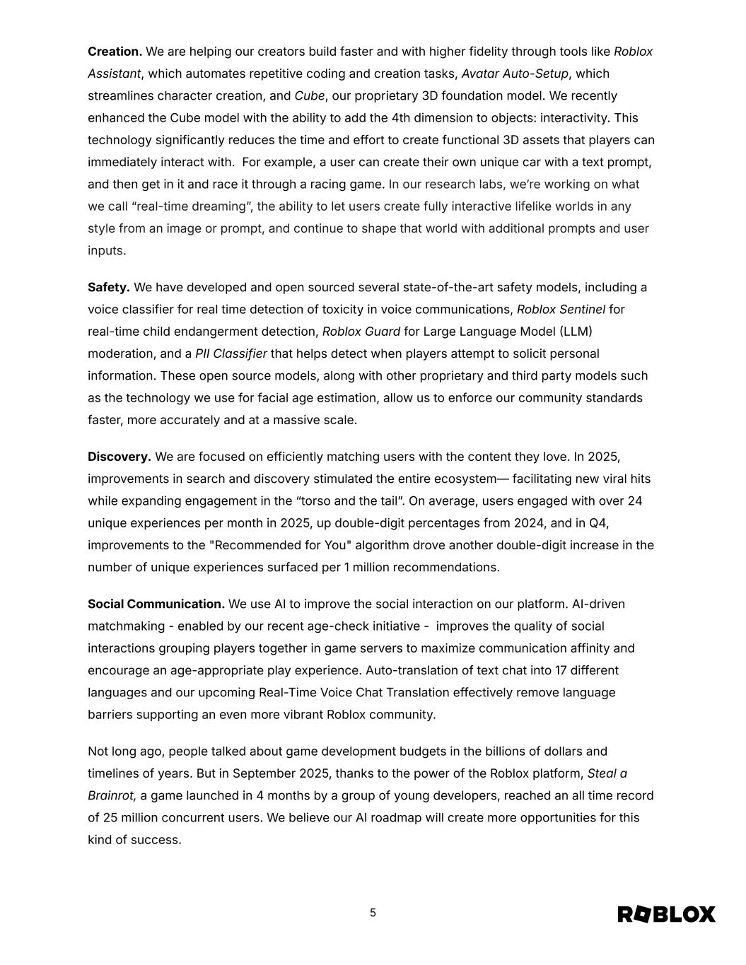 Creation. We are helping our creators build faster and with higher fidelity through tools like Roblox Assistant, which automates repetitive coding and creation tasks, Avatar Auto-Setup, which streamlines character creation, and Cube, our proprietary 3D foundation model. We recently enhanced the Cube model with the ability to add the 4th dimension to objects: interactivity. This technology significantly reduces the time and effort to create functional 3D assets that players can immediately interact with. For example, a user can create their own unique car with a text prompt, and then get in it and race it through a racing game. In our research labs, we’re working on what we call “real-time dreaming”, the ability to let users create fully interactive lifelike worlds in any style from an image or prompt, and continue to shape that world with additional prompts and user inputs. Safety. We have developed and open sourced several state-of-the-art safety models, including a voice classifier for real time detection of toxicity in voice communications, Roblox Sentinel for real-time child endangerment detection, Roblox Guard for Large Language Model (LLM) moderation, and a PII Classifier that helps detect when players attempt to solicit personal information. These open source models, along with other proprietary and third party models such as the technology we use for facial age estimation, allow us to enforce our community standards faster, more accurately and at a massive scale. Discovery. We are focused on efficiently matching users with the content they love. In 2025, improvements in search and discovery stimulated the entire ecosystem— facilitating new viral hits while expanding engagement in the “torso and the tail”. On average, users engaged with over 24 unique experiences per month in 2025, up double-digit percentages from 2024, and in Q4, improvements to the "Recommended for You" algorithm drove another double-digit increase in the number of unique experiences surfaced per 1 million recommendations. Social Communication. We use AI to improve the social interaction on our platform. AI-driven matchmaking - enabled by our recent age-check initiative - improves the quality of social interactions grouping players together in game servers to maximize communication affinity and encourage an age-appropriate play experience. Auto-translation of text chat into 17 different languages and our upcoming Real-Time Voice Chat Translation effectively remove language barriers supporting an even more vibrant Roblox community. Not long ago, people talked about game development budgets in the billions of dollars and timelines of years. But in September 2025, thanks to the power of the Roblox platform, Steal a Brainrot, a game launched in 4 months by a group of young developers, reached an all time record of 25 million concurrent users. We believe our AI roadmap will create more opportunities for this kind of success. 5