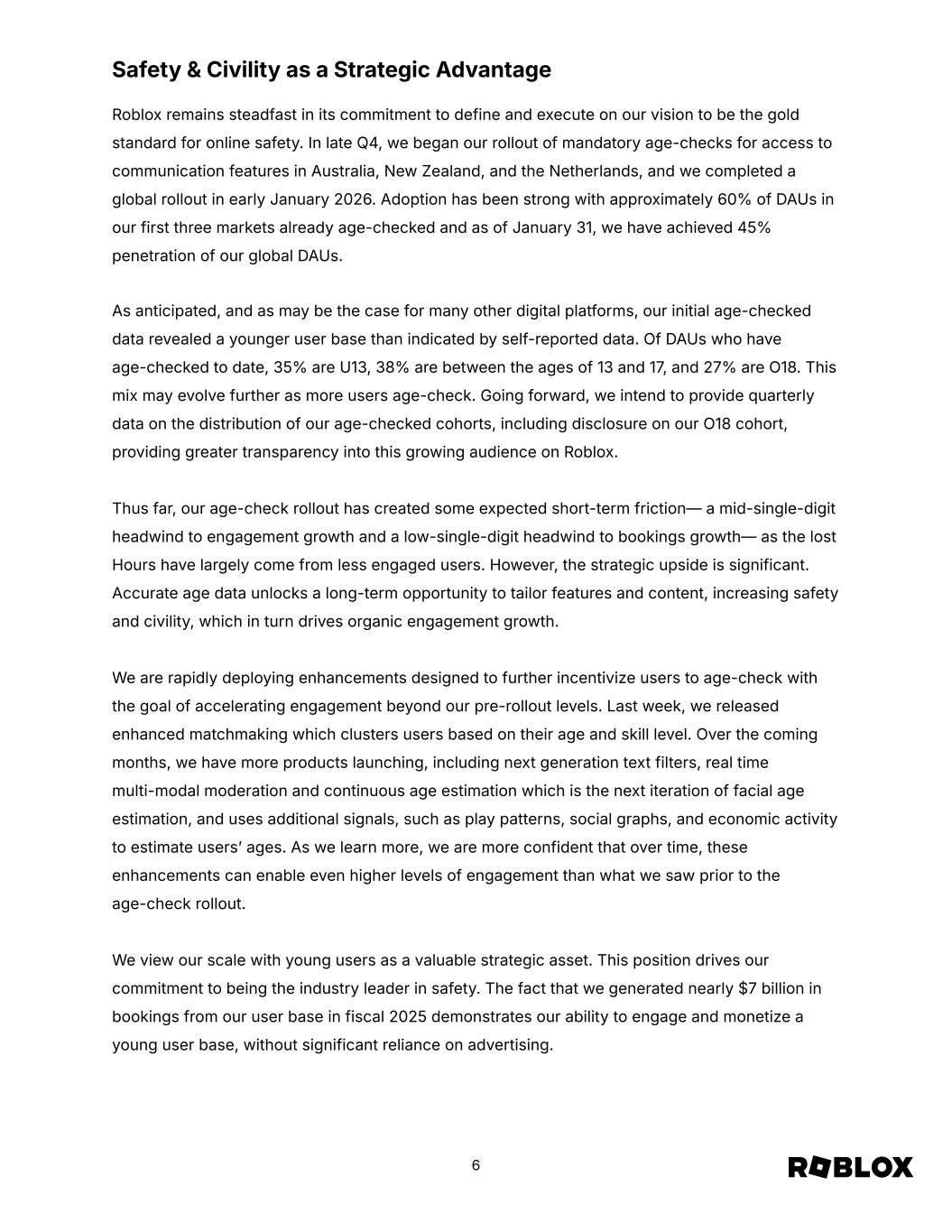 Safety & Civility as a Strategic Advantage Roblox remains steadfast in its commitment to define and execute on our vision to be the gold standard for online safety. In late Q4, we began our rollout of mandatory age-checks for access to communication features in Australia, New Zealand, and the Netherlands, and we completed a global rollout in early January 2026. Adoption has been strong with approximately 60% of DAUs in our first three markets already age-checked and as of January 31, we have achieved 45% penetration of our global DAUs. As anticipated, and as may be the case for many other digital platforms, our initial age-checked data revealed a younger user base than indicated by self-reported data. Of DAUs who have age-checked to date, 35% are U13, 38% are between the ages of 13 and 17, and 27% are O18. This mix may evolve further as more users age-check. Going forward, we intend to provide quarterly data on the distribution of our age-checked cohorts, including disclosure on our O18 cohort, providing greater transparency into this growing audience on Roblox. Thus far, our age-check rollout has created some expected short-term friction— a mid-single-digit headwind to engagement growth and a low-single-digit headwind to bookings growth— as the lost Hours have largely come from less engaged users. However, the strategic upside is significant. Accurate age data unlocks a long-term opportunity to tailor features and content, increasing safety and civility, which in turn drives organic engagement growth. We are rapidly deploying enhancements designed to further incentivize users to age-check with the goal of accelerating engagement beyond our pre-rollout levels. Last week, we released enhanced matchmaking which clusters users based on their age and skill level. Over the coming months, we have more products launching, including next generation text filters, real time multi-modal moderation and continuous age estimation which is the next iteration of facial age estimation, and uses additional signals, such as play patterns, social graphs, and economic activity to estimate users’ ages. As we learn more, we are more confident that over time, these enhancements can enable even higher levels of engagement than what we saw prior to the age-check rollout. We view our scale with young users as a valuable strategic asset. This position drives our commitment to being the industry leader in safety. The fact that we generated nearly $7 billion in bookings from our user base in fiscal 2025 demonstrates our ability to engage and monetize a young user base, without significant reliance on advertising. 6