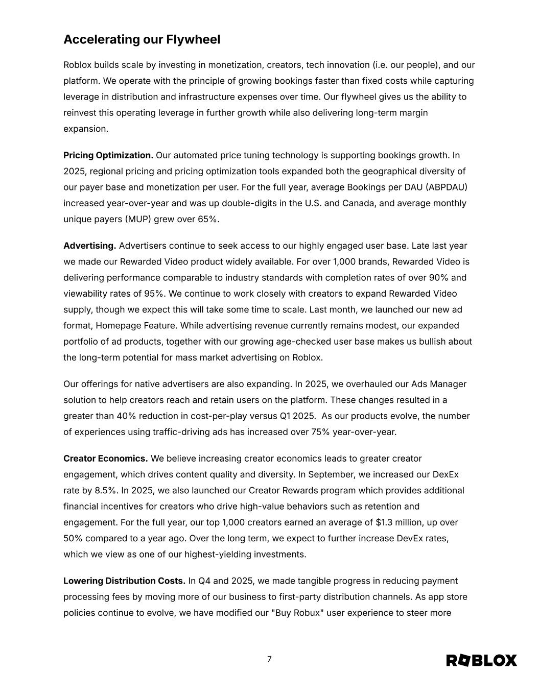 Accelerating our Flywheel Roblox builds scale by investing in monetization, creators, tech innovation (i.e. our people), and our platform. We operate with the principle of growing bookings faster than fixed costs while capturing leverage in distribution and infrastructure expenses over time. Our flywheel gives us the ability to reinvest this operating leverage in further growth while also delivering long-term margin expansion. Pricing Optimization. Our automated price tuning technology is supporting bookings growth. In 2025, regional pricing and pricing optimization tools expanded both the geographical diversity of our payer base and monetization per user. For the full year, average Bookings per DAU (ABPDAU) increased year-over-year and was up double-digits in the U.S. and Canada, and average monthly unique payers (MUP) grew over 65%. Advertising. Advertisers continue to seek access to our highly engaged user base. Late last year we made our Rewarded Video product widely available. For over 1,000 brands, Rewarded Video is delivering performance comparable to industry standards with completion rates of over 90% and viewability rates of 95%. We continue to work closely with creators to expand Rewarded Video supply, though we expect this will take some time to scale. Last month, we launched our new ad format, Homepage Feature. While advertising revenue currently remains modest, our expanded portfolio of ad products, together with our growing age-checked user base makes us bullish about the long-term potential for mass market advertising on Roblox. Our offerings for native advertisers are also expanding. In 2025, we overhauled our Ads Manager solution to help creators reach and retain users on the platform. These changes resulted in a greater than 40% reduction in cost-per-play versus Q1 2025. As our products evolve, the number of experiences using traffic-driving ads has increased over 75% year-over-year. Creator Economics. We believe increasing creator economics leads to greater creator engagement, which drives content quality and diversity. In September, we increased our DexEx rate by 8.5%. In 2025, we also launched our Creator Rewards program which provides additional financial incentives for creators who drive high-value behaviors such as retention and engagement. For the full year, our top 1,000 creators earned an average of $1.3 million, up over 50% compared to a year ago. Over the long term, we expect to further increase DevEx rates, which we view as one of our highest-yielding investments. Lowering Distribution Costs. In Q4 and 2025, we made tangible progress in reducing payment processing fees by moving more of our business to first-party distribution channels. As app store policies continue to evolve, we have modified our "Buy Robux" user experience to steer more 7