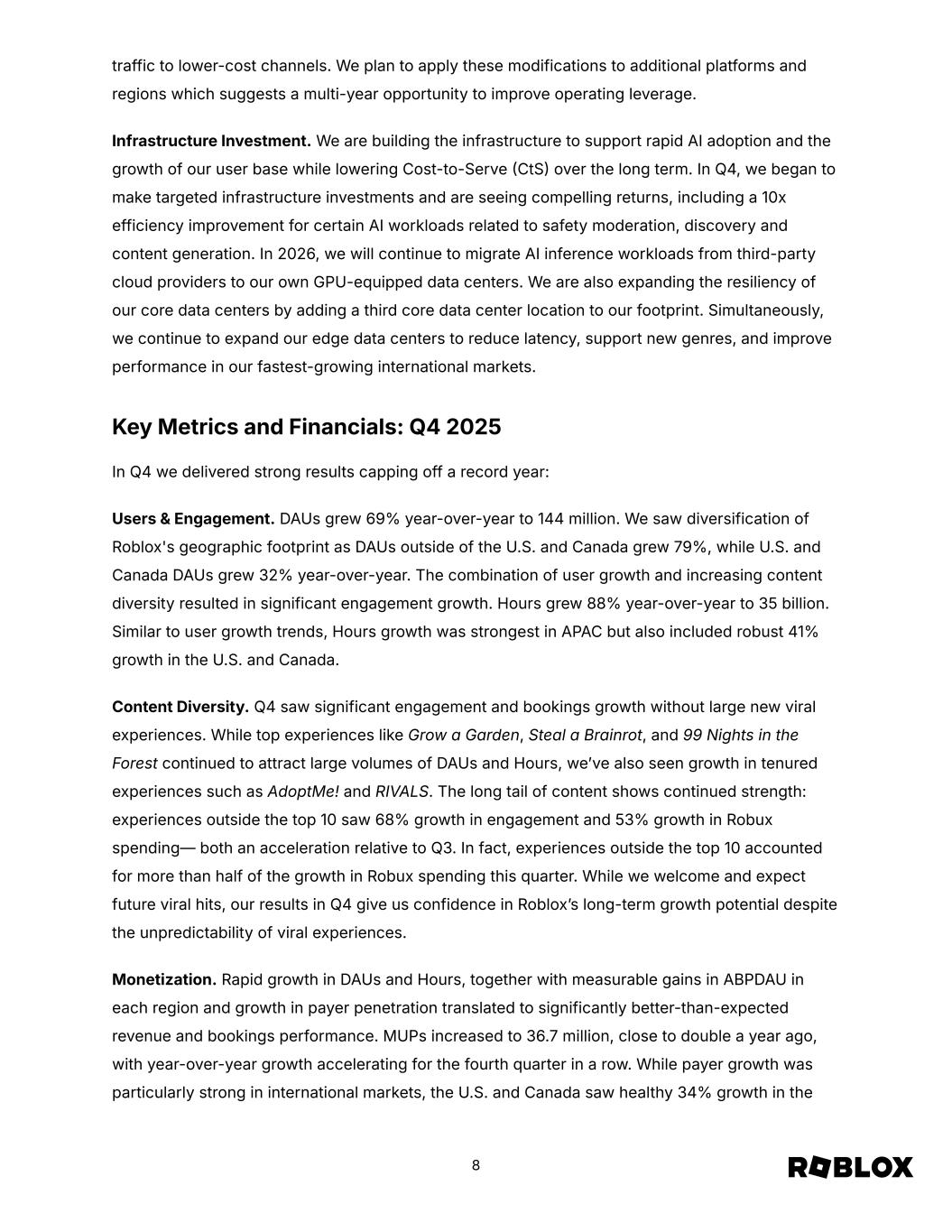 traffic to lower-cost channels. We plan to apply these modifications to additional platforms and regions which suggests a multi-year opportunity to improve operating leverage. Infrastructure Investment. We are building the infrastructure to support rapid AI adoption and the growth of our user base while lowering Cost-to-Serve (CtS) over the long term. In Q4, we began to make targeted infrastructure investments and are seeing compelling returns, including a 10x efficiency improvement for certain AI workloads related to safety moderation, discovery and content generation. In 2026, we will continue to migrate AI inference workloads from third-party cloud providers to our own GPU-equipped data centers. We are also expanding the resiliency of our core data centers by adding a third core data center location to our footprint. Simultaneously, we continue to expand our edge data centers to reduce latency, support new genres, and improve performance in our fastest-growing international markets. Key Metrics and Financials: Q4 2025 In Q4 we delivered strong results capping off a record year: Users & Engagement. DAUs grew 69% year-over-year to 144 million. We saw diversification of Roblox's geographic footprint as DAUs outside of the U.S. and Canada grew 79%, while U.S. and Canada DAUs grew 32% year-over-year. The combination of user growth and increasing content diversity resulted in significant engagement growth. Hours grew 88% year-over-year to 35 billion. Similar to user growth trends, Hours growth was strongest in APAC but also included robust 41% growth in the U.S. and Canada. Content Diversity. Q4 saw significant engagement and bookings growth without large new viral experiences. While top experiences like Grow a Garden, Steal a Brainrot, and 99 Nights in the Forest continued to attract large volumes of DAUs and Hours, we’ve also seen growth in tenured experiences such as AdoptMe! and RIVALS. The long tail of content shows continued strength: experiences outside the top 10 saw 68% growth in engagement and 53% growth in Robux spending— both an acceleration relative to Q3. In fact, experiences outside the top 10 accounted for more than half of the growth in Robux spending this quarter. While we welcome and expect future viral hits, our results in Q4 give us confidence in Roblox’s long-term growth potential despite the unpredictability of viral experiences. Monetization. Rapid growth in DAUs and Hours, together with measurable gains in ABPDAU in each region and growth in payer penetration translated to significantly better-than-expected revenue and bookings performance. MUPs increased to 36.7 million, close to double a year ago, with year-over-year growth accelerating for the fourth quarter in a row. While payer growth was particularly strong in international markets, the U.S. and Canada saw healthy 34% growth in the 8