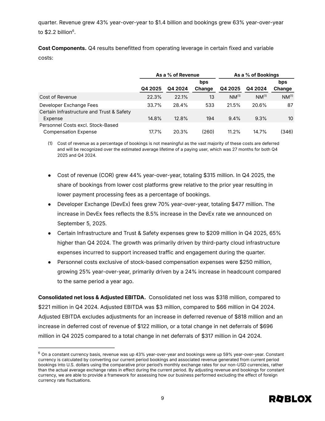 quarter. Revenue grew 43% year-over-year to $1.4 billion and bookings grew 63% year-over-year to $2.2 billion6. Cost Components. Q4 results benefitted from operating leverage in certain fixed and variable costs: As a % of Revenue As a % of Bookings Q4 2025 Q4 2024 bps Change Q4 2025 Q4 2024 bps Change Cost of Revenue 22.3% 22.1% 13 NM(1) NM(1) NM(1) Developer Exchange Fees 33.7% 28.4% 533 21.5% 20.6% 87 Certain Infrastructure and Trust & Safety Expense 14.8% 12.8% 194 9.4% 9.3% 10 Personnel Costs excl. Stock-Based Compensation Expense 17.7% 20.3% (260) 11.2% 14.7% (346) (1)​ Cost of revenue as a percentage of bookings is not meaningful as the vast majority of these costs are deferred and will be recognized over the estimated average lifetime of a paying user, which was 27 months for both Q4 2025 and Q4 2024. ●​ Cost of revenue (COR) grew 44% year-over-year, totaling $315 million. In Q4 2025, the share of bookings from lower cost platforms grew relative to the prior year resulting in lower payment processing fees as a percentage of bookings. ●​ Developer Exchange (DevEx) fees grew 70% year-over-year, totaling $477 million. The increase in DevEx fees reflects the 8.5% increase in the DevEx rate we announced on September 5, 2025. ●​ Certain Infrastructure and Trust & Safety expenses grew to $209 million in Q4 2025, 65% higher than Q4 2024. The growth was primarily driven by third-party cloud infrastructure expenses incurred to support increased traffic and engagement during the quarter. ●​ Personnel costs exclusive of stock-based compensation expenses were $250 million, growing 25% year-over-year, primarily driven by a 24% increase in headcount compared to the same period a year ago. Consolidated net loss & Adjusted EBITDA. Consolidated net loss was $318 million, compared to $221 million in Q4 2024. Adjusted EBITDA was $3 million, compared to $66 million in Q4 2024. Adjusted EBITDA excludes adjustments for an increase in deferred revenue of $818 million and an increase in deferred cost of revenue of $122 million, or a total change in net deferrals of $696 million in Q4 2025 compared to a total change in net deferrals of $317 million in Q4 2024. 6 On a constant currency basis, revenue was up 43% year-over-year and bookings were up 59% year-over-year. Constant currency is calculated by converting our current period bookings and associated revenue generated from current period bookings into U.S. dollars using the comparative prior period’s monthly exchange rates for our non-USD currencies, rather than the actual average exchange rates in effect during the current period. By adjusting revenue and bookings for constant currency, we are able to provide a framework for assessing how our business performed excluding the effect of foreign currency rate fluctuations. 9