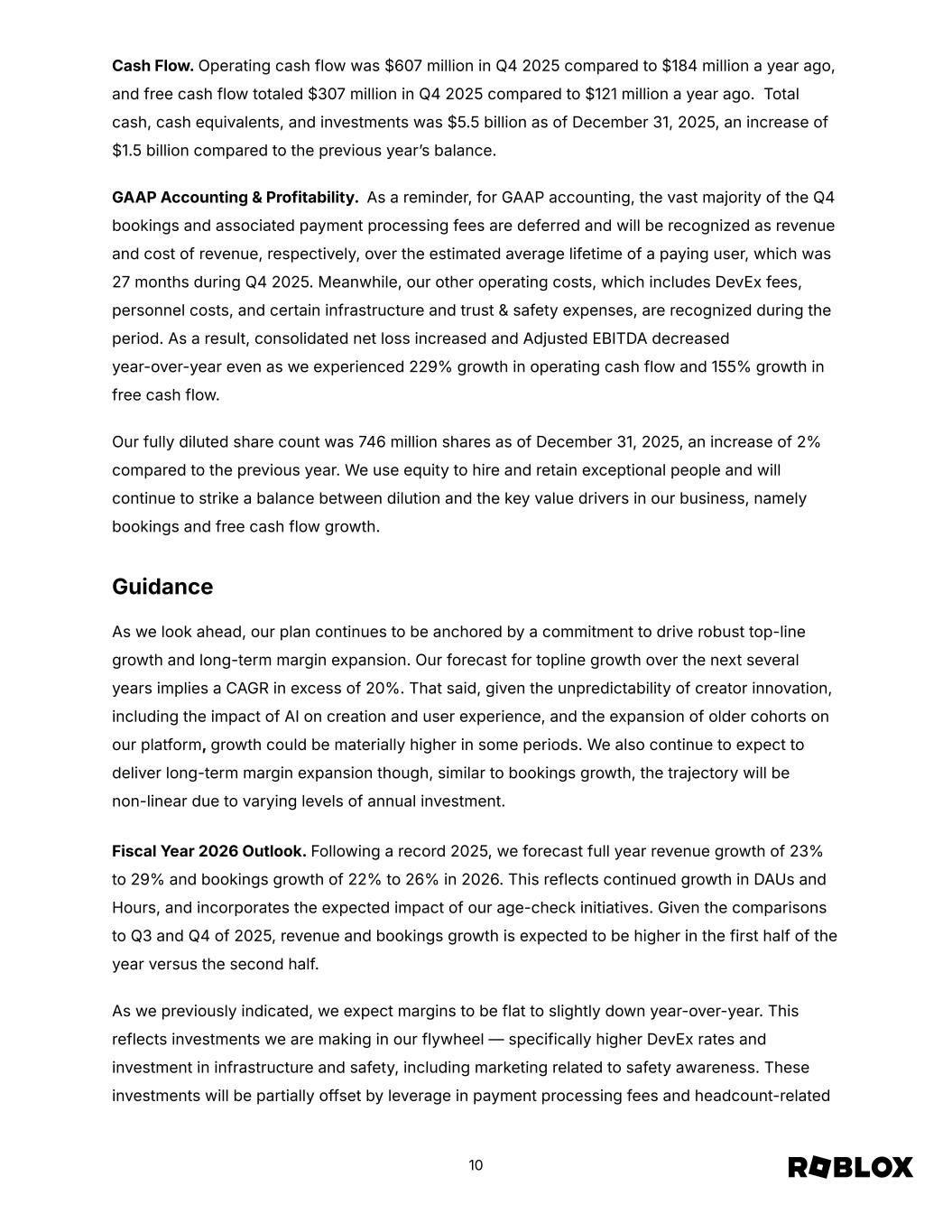 Cash Flow. Operating cash flow was $607 million in Q4 2025 compared to $184 million a year ago, and free cash flow totaled $307 million in Q4 2025 compared to $121 million a year ago. Total cash, cash equivalents, and investments was $5.5 billion as of December 31, 2025, an increase of $1.5 billion compared to the previous year’s balance. GAAP Accounting & Profitability. As a reminder, for GAAP accounting, the vast majority of the Q4 bookings and associated payment processing fees are deferred and will be recognized as revenue and cost of revenue, respectively, over the estimated average lifetime of a paying user, which was 27 months during Q4 2025. Meanwhile, our other operating costs, which includes DevEx fees, personnel costs, and certain infrastructure and trust & safety expenses, are recognized during the period. As a result, consolidated net loss increased and Adjusted EBITDA decreased year-over-year even as we experienced 229% growth in operating cash flow and 155% growth in free cash flow. Our fully diluted share count was 746 million shares as of December 31, 2025, an increase of 2% compared to the previous year. We use equity to hire and retain exceptional people and will continue to strike a balance between dilution and the key value drivers in our business, namely bookings and free cash flow growth. Guidance As we look ahead, our plan continues to be anchored by a commitment to drive robust top-line growth and long-term margin expansion. Our forecast for topline growth over the next several years implies a CAGR in excess of 20%. That said, given the unpredictability of creator innovation, including the impact of AI on creation and user experience, and the expansion of older cohorts on our platform, growth could be materially higher in some periods. We also continue to expect to deliver long-term margin expansion though, similar to bookings growth, the trajectory will be non-linear due to varying levels of annual investment. Fiscal Year 2026 Outlook. Following a record 2025, we forecast full year revenue growth of 23% to 29% and bookings growth of 22% to 26% in 2026. This reflects continued growth in DAUs and Hours, and incorporates the expected impact of our age-check initiatives. Given the comparisons to Q3 and Q4 of 2025, revenue and bookings growth is expected to be higher in the first half of the year versus the second half. As we previously indicated, we expect margins to be flat to slightly down year-over-year. This reflects investments we are making in our flywheel — specifically higher DevEx rates and investment in infrastructure and safety, including marketing related to safety awareness. These investments will be partially offset by leverage in payment processing fees and headcount-related 10