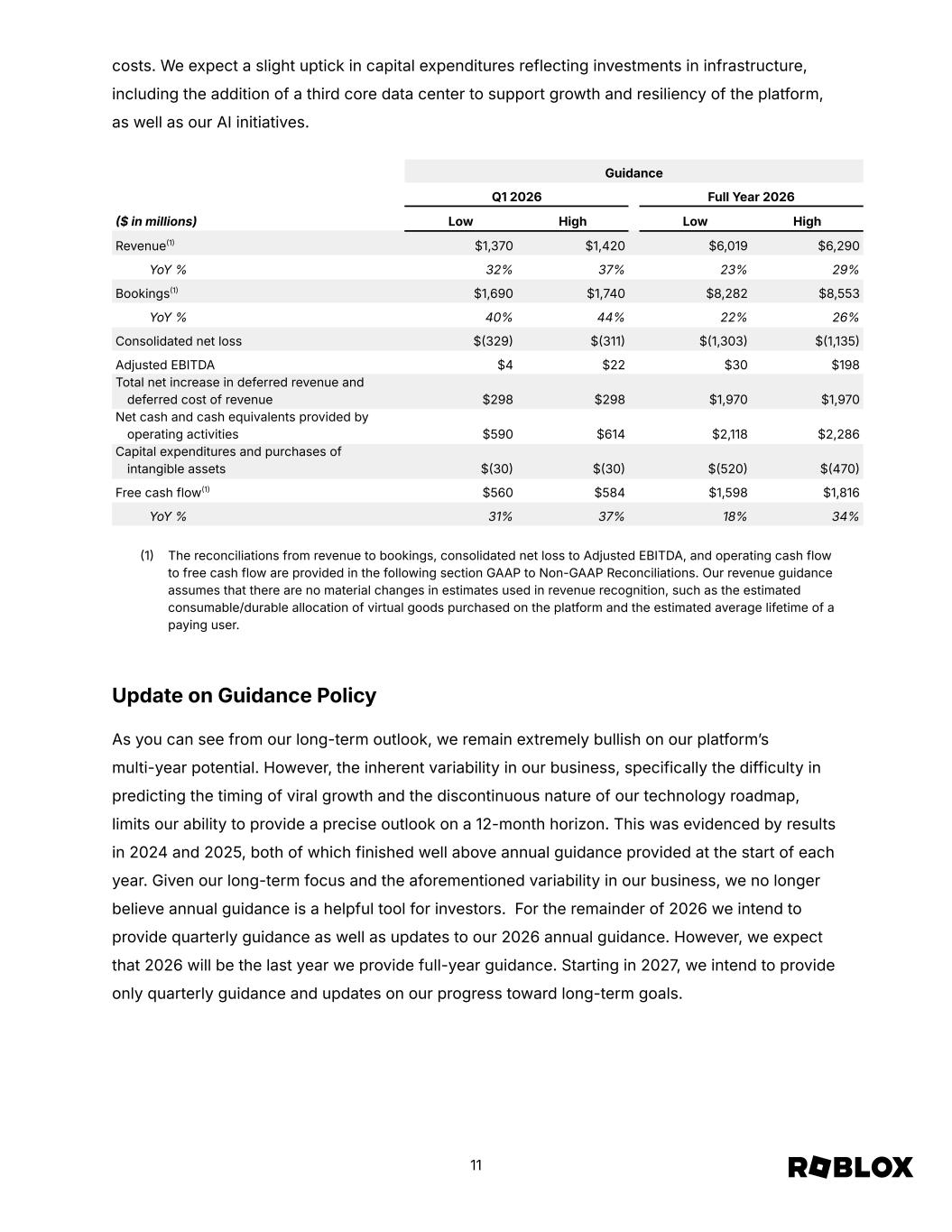costs. We expect a slight uptick in capital expenditures reflecting investments in infrastructure, including the addition of a third core data center to support growth and resiliency of the platform, as well as our AI initiatives. Guidance Q1 2026 Full Year 2026 ($ in millions) Low High Low High Revenue(1) $1,370 $1,420 $6,019 $6,290 YoY % 32% 37% 23% 29% Bookings(1) $1,690 $1,740 $8,282 $8,553 YoY % 40% 44% 22% 26% Consolidated net loss $(329) $(311) $(1,303) $(1,135) Adjusted EBITDA $4 $22 $30 $198 Total net increase in deferred revenue and deferred cost of revenue $298 $298 $1,970 $1,970 Net cash and cash equivalents provided by operating activities $590 $614 $2,118 $2,286 Capital expenditures and purchases of intangible assets $(30) $(30) $(520) $(470) Free cash flow(1) $560 $584 $1,598 $1,816 YoY % 31% 37% 18% 34% (1)​ The reconciliations from revenue to bookings, consolidated net loss to Adjusted EBITDA, and operating cash flow to free cash flow are provided in the following section GAAP to Non-GAAP Reconciliations. Our revenue guidance assumes that there are no material changes in estimates used in revenue recognition, such as the estimated consumable/durable allocation of virtual goods purchased on the platform and the estimated average lifetime of a paying user. Update on Guidance Policy As you can see from our long-term outlook, we remain extremely bullish on our platform’s multi-year potential. However, the inherent variability in our business, specifically the difficulty in predicting the timing of viral growth and the discontinuous nature of our technology roadmap, limits our ability to provide a precise outlook on a 12-month horizon. This was evidenced by results in 2024 and 2025, both of which finished well above annual guidance provided at the start of each year. Given our long-term focus and the aforementioned variability in our business, we no longer believe annual guidance is a helpful tool for investors. For the remainder of 2026 we intend to provide quarterly guidance as well as updates to our 2026 annual guidance. However, we expect that 2026 will be the last year we provide full-year guidance. Starting in 2027, we intend to provide only quarterly guidance and updates on our progress toward long-term goals. 11