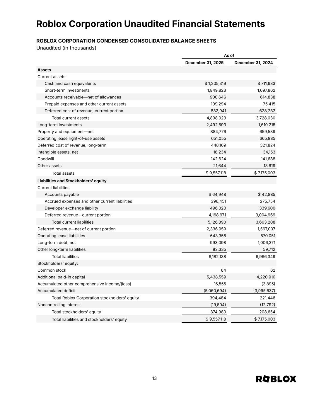 Roblox Corporation Unaudited Financial Statements ROBLOX CORPORATION CONDENSED CONSOLIDATED BALANCE SHEETS Unaudited (in thousands) As of December 31, 2025 December 31, 2024 Assets Current assets: Cash and cash equivalents $ 1,205,319 $ 711,683 Short-term investments 1,849,823 1,697,862 Accounts receivable—net of allowances 900,646 614,838 Prepaid expenses and other current assets 109,294 75,415 Deferred cost of revenue, current portion 832,941 628,232 Total current assets 4,898,023 3,728,030 Long-term investments 2,492,593 1,610,215 Property and equipment—net 884,776 659,589 Operating lease right-of-use assets 651,055 665,885 Deferred cost of revenue, long-term 448,169 321,824 Intangible assets, net 18,234 34,153 Goodwill 142,624 141,688 Other assets 21,644 13,619 Total assets $ 9,557,118 $ 7,175,003 Liabilities and Stockholders’ equity Current liabilities: Accounts payable $ 64,948 $ 42,885 Accrued expenses and other current liabilities 396,451 275,754 Developer exchange liability 496,020 339,600 Deferred revenue—current portion 4,168,971 3,004,969 Total current liabilities 5,126,390 3,663,208 Deferred revenue—net of current portion 2,336,959 1,567,007 Operating lease liabilities 643,356 670,051 Long-term debt, net 993,098 1,006,371 Other long-term liabilities 82,335 59,712 Total liabilities 9,182,138 6,966,349 Stockholders' equity: Common stock 64 62 Additional paid-in capital 5,438,559 4,220,916 Accumulated other comprehensive income/(loss) 16,555 (3,895) Accumulated deficit (5,060,694) (3,995,637) Total Roblox Corporation stockholders' equity 394,484 221,446 Noncontrolling interest (19,504) (12,792) Total stockholders' equity 374,980 208,654 Total liabilities and stockholders' equity $ 9,557,118 $ 7,175,003 13