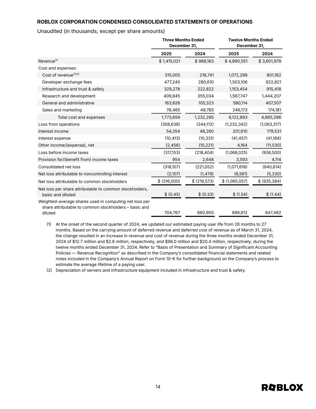ROBLOX CORPORATION CONDENSED CONSOLIDATED STATEMENTS OF OPERATIONS Unaudited (in thousands, except per share amounts) Three Months Ended December 31, Twelve Months Ended December 31, 2025 2024 2025 2024 Revenue(1) $ 1,415,021 $ 988,183 $ 4,890,551 $ 3,601,979 Cost and expenses: Cost of revenue(1)(2) 315,005 218,741 1,072,299 801,162 Developer exchange fees 477,240 280,610 1,503,106 922,821 Infrastructure and trust & safety 329,278 222,822 1,153,454 915,418 Research and development 409,845 355,034 1,567,747 1,444,207 General and administrative 163,826 105,323 580,114 407,507 Sales and marketing 78,465 49,765 246,173 174,181 Total cost and expenses 1,773,659 1,232,295 6,122,893 4,665,296 Loss from operations (358,638) (244,112) (1,232,342) (1,063,317) Interest income 54,354 46,260 201,610 179,531 Interest expense (10,413) (10,331) (41,457) (41,184) Other income/(expense), net (2,456) (10,221) 4,164 (11,530) Loss before income taxes (317,153) (218,404) (1,068,025) (936,500) Provision for/(benefit from) income taxes 954 2,648 3,593 4,114 Consolidated net loss (318,107) (221,052) (1,071,618) (940,614) Net loss attributable to noncontrolling interest (2,107) (1,479) (6,561) (5,230) Net loss attributable to common stockholders $ (316,000) $ (219,573) $ (1,065,057) $ (935,384) Net loss per share attributable to common stockholders, basic and diluted $ (0.45) $ (0.33) $ (1.54) $ (1.44) Weighted-average shares used in computing net loss per share attributable to common stockholders – basic and diluted 704,767 660,900 689,612 647,482 (1)​ At the onset of the second quarter of 2024, we updated our estimated paying user life from 28 months to 27 months. Based on the carrying amount of deferred revenue and deferred cost of revenue as of March 31, 2024, the change resulted in an increase in revenue and cost of revenue during the three months ended December 31, 2024 of $12.7 million and $2.6 million, respectively, and $98.0 million and $20.4 million, respectively, during the twelve months ended December 31, 2024. Refer to “Basis of Presentation and Summary of Significant Accounting Policies — Revenue Recognition” as described in the Company’s consolidated financial statements and related notes included in the Company’s Annual Report on Form 10-K for further background on the Company’s process to estimate the average lifetime of a paying user. (2)​ Depreciation of servers and infrastructure equipment included in infrastructure and trust & safety. 14