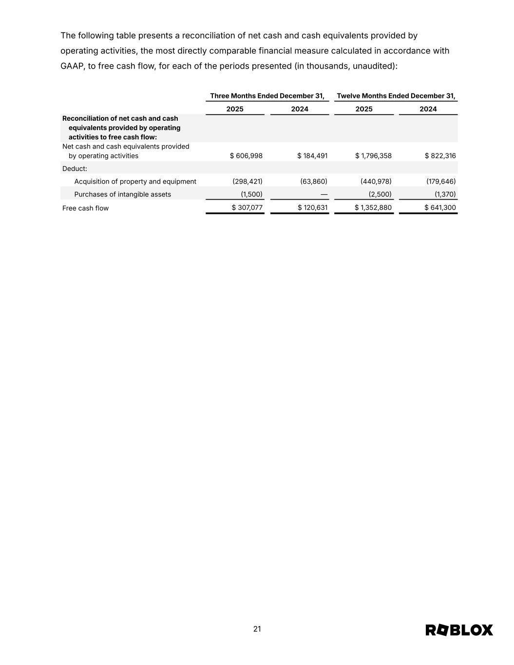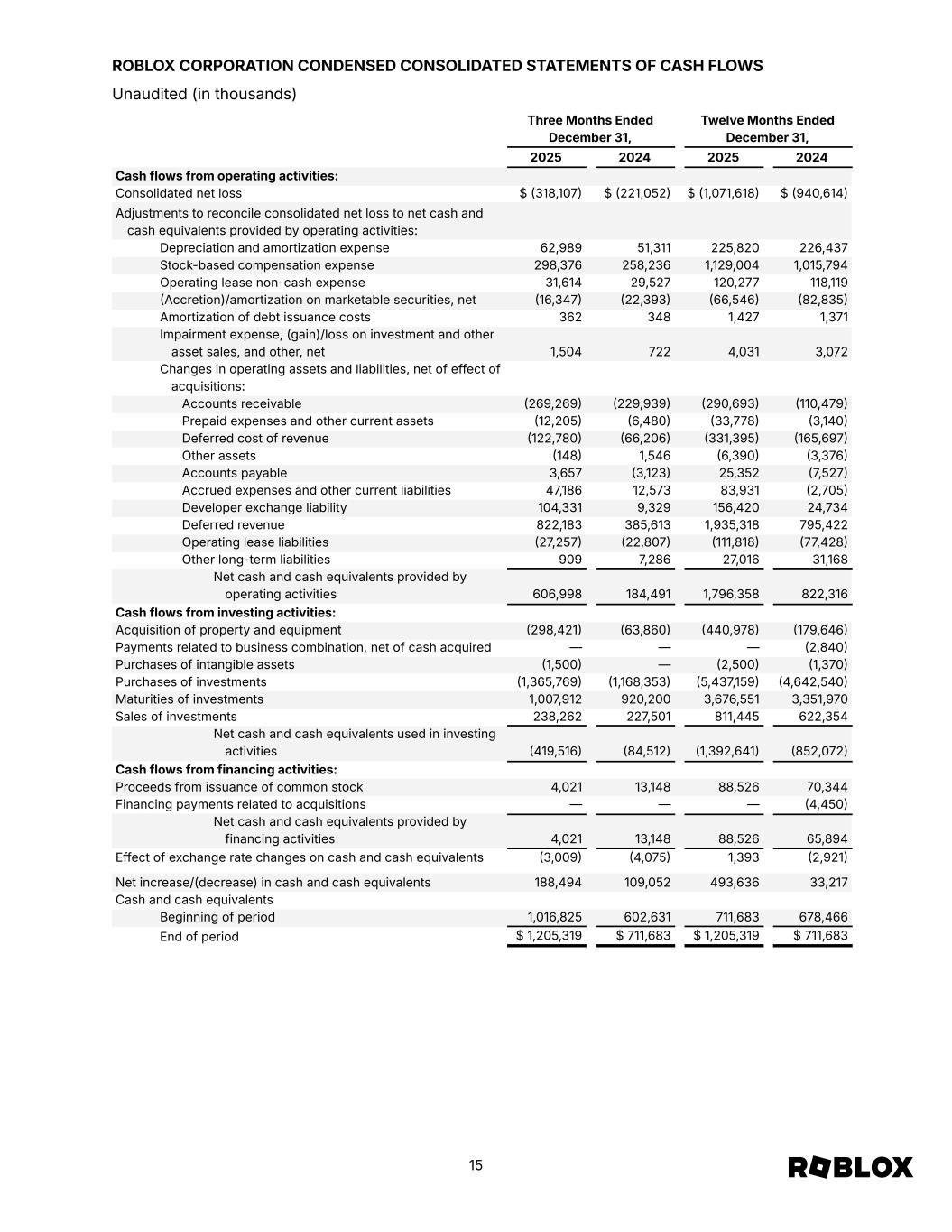 ROBLOX CORPORATION CONDENSED CONSOLIDATED STATEMENTS OF CASH FLOWS Unaudited (in thousands) Three Months Ended December 31, Twelve Months Ended December 31, 2025 2024 2025 2024 Cash flows from operating activities: Consolidated net loss $ (318,107) $ (221,052) $ (1,071,618) $ (940,614) Adjustments to reconcile consolidated net loss to net cash and cash equivalents provided by operating activities: Depreciation and amortization expense 62,989 51,311 225,820 226,437 Stock-based compensation expense 298,376 258,236 1,129,004 1,015,794 Operating lease non-cash expense 31,614 29,527 120,277 118,119 (Accretion)/amortization on marketable securities, net (16,347) (22,393) (66,546) (82,835) Amortization of debt issuance costs 362 348 1,427 1,371 Impairment expense, (gain)/loss on investment and other asset sales, and other, net 1,504 722 4,031 3,072 Changes in operating assets and liabilities, net of effect of acquisitions: Accounts receivable (269,269) (229,939) (290,693) (110,479) Prepaid expenses and other current assets (12,205) (6,480) (33,778) (3,140) Deferred cost of revenue (122,780) (66,206) (331,395) (165,697) Other assets (148) 1,546 (6,390) (3,376) Accounts payable 3,657 (3,123) 25,352 (7,527) Accrued expenses and other current liabilities 47,186 12,573 83,931 (2,705) Developer exchange liability 104,331 9,329 156,420 24,734 Deferred revenue 822,183 385,613 1,935,318 795,422 Operating lease liabilities (27,257) (22,807) (111,818) (77,428) Other long-term liabilities 909 7,286 27,016 31,168 Net cash and cash equivalents provided by operating activities 606,998 184,491 1,796,358 822,316 Cash flows from investing activities: Acquisition of property and equipment (298,421) (63,860) (440,978) (179,646) Payments related to business combination, net of cash acquired — — — (2,840) Purchases of intangible assets (1,500) — (2,500) (1,370) Purchases of investments (1,365,769) (1,168,353) (5,437,159) (4,642,540) Maturities of investments 1,007,912 920,200 3,676,551 3,351,970 Sales of investments 238,262 227,501 811,445 622,354 Net cash and cash equivalents used in investing activities (419,516) (84,512) (1,392,641) (852,072) Cash flows from financing activities: Proceeds from issuance of common stock 4,021 13,148 88,526 70,344 Financing payments related to acquisitions — — — (4,450) Net cash and cash equivalents provided by financing activities 4,021 13,148 88,526 65,894 Effect of exchange rate changes on cash and cash equivalents (3,009) (4,075) 1,393 (2,921) Net increase/(decrease) in cash and cash equivalents 188,494 109,052 493,636 33,217 Cash and cash equivalents Beginning of period 1,016,825 602,631 711,683 678,466 End of period $ 1,205,319 $ 711,683 $ 1,205,319 $ 711,683 15