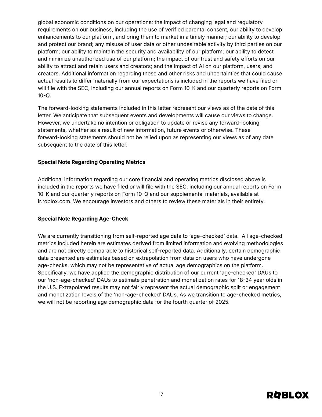 global economic conditions on our operations; the impact of changing legal and regulatory requirements on our business, including the use of verified parental consent; our ability to develop enhancements to our platform, and bring them to market in a timely manner; our ability to develop and protect our brand; any misuse of user data or other undesirable activity by third parties on our platform; our ability to maintain the security and availability of our platform; our ability to detect and minimize unauthorized use of our platform; the impact of our trust and safety efforts on our ability to attract and retain users and creators; and the impact of AI on our platform, users, and creators. Additional information regarding these and other risks and uncertainties that could cause actual results to differ materially from our expectations is included in the reports we have filed or will file with the SEC, including our annual reports on Form 10-K and our quarterly reports on Form 10-Q. The forward-looking statements included in this letter represent our views as of the date of this letter. We anticipate that subsequent events and developments will cause our views to change. However, we undertake no intention or obligation to update or revise any forward-looking statements, whether as a result of new information, future events or otherwise. These forward-looking statements should not be relied upon as representing our views as of any date subsequent to the date of this letter. Special Note Regarding Operating Metrics Additional information regarding our core financial and operating metrics disclosed above is included in the reports we have filed or will file with the SEC, including our annual reports on Form 10-K and our quarterly reports on Form 10-Q and our supplemental materials, available at ir.roblox.com. We encourage investors and others to review these materials in their entirety. Special Note Regarding Age-Check We are currently transitioning from self-reported age data to ‘age-checked’ data. All age-checked metrics included herein are estimates derived from limited information and evolving methodologies and are not directly comparable to historical self-reported data. Additionally, certain demographic data presented are estimates based on extrapolation from data on users who have undergone age-checks, which may not be representative of actual age demographics on the platform. Specifically, we have applied the demographic distribution of our current 'age-checked' DAUs to our 'non-age-checked' DAUs to estimate penetration and monetization rates for 18-34 year olds in the U.S. Extrapolated results may not fairly represent the actual demographic split or engagement and monetization levels of the ‘non-age-checked’ DAUs. As we transition to age-checked metrics, we will not be reporting age demographic data for the fourth quarter of 2025. 17