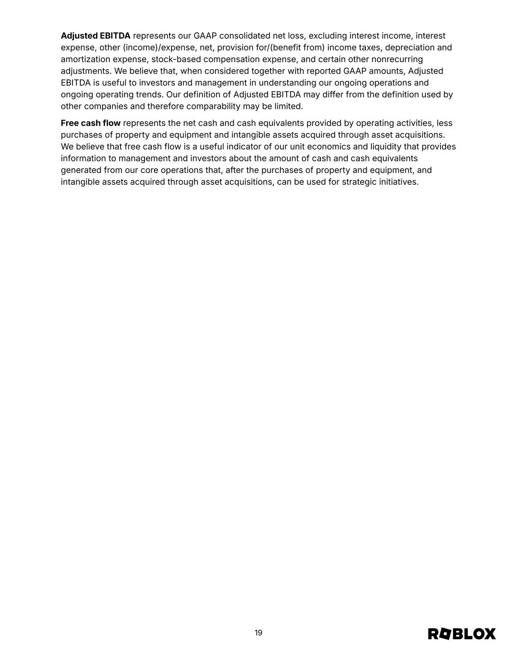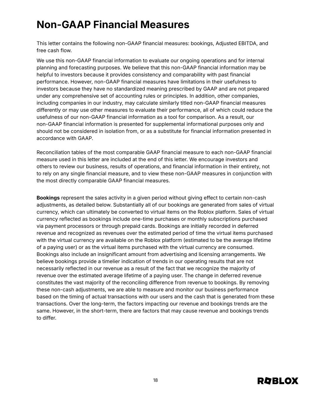 Non-GAAP Financial Measures This letter contains the following non-GAAP financial measures: bookings, Adjusted EBITDA, and free cash flow. We use this non-GAAP financial information to evaluate our ongoing operations and for internal planning and forecasting purposes. We believe that this non-GAAP financial information may be helpful to investors because it provides consistency and comparability with past financial performance. However, non-GAAP financial measures have limitations in their usefulness to investors because they have no standardized meaning prescribed by GAAP and are not prepared under any comprehensive set of accounting rules or principles. In addition, other companies, including companies in our industry, may calculate similarly titled non-GAAP financial measures differently or may use other measures to evaluate their performance, all of which could reduce the usefulness of our non-GAAP financial information as a tool for comparison. As a result, our non-GAAP financial information is presented for supplemental informational purposes only and should not be considered in isolation from, or as a substitute for financial information presented in accordance with GAAP.​ ​ Reconciliation tables of the most comparable GAAP financial measure to each non-GAAP financial measure used in this letter are included at the end of this letter. We encourage investors and others to review our business, results of operations, and financial information in their entirety, not to rely on any single financial measure, and to view these non-GAAP measures in conjunction with the most directly comparable GAAP financial measures.​ Bookings represent the sales activity in a given period without giving effect to certain non-cash adjustments, as detailed below. Substantially all of our bookings are generated from sales of virtual currency, which can ultimately be converted to virtual items on the Roblox platform. Sales of virtual currency reflected as bookings include one-time purchases or monthly subscriptions purchased via payment processors or through prepaid cards. Bookings are initially recorded in deferred revenue and recognized as revenues over the estimated period of time the virtual items purchased with the virtual currency are available on the Roblox platform (estimated to be the average lifetime of a paying user) or as the virtual items purchased with the virtual currency are consumed. Bookings also include an insignificant amount from advertising and licensing arrangements. We believe bookings provide a timelier indication of trends in our operating results that are not necessarily reflected in our revenue as a result of the fact that we recognize the majority of revenue over the estimated average lifetime of a paying user. The change in deferred revenue constitutes the vast majority of the reconciling difference from revenue to bookings. By removing these non-cash adjustments, we are able to measure and monitor our business performance based on the timing of actual transactions with our users and the cash that is generated from these transactions. Over the long-term, the factors impacting our revenue and bookings trends are the same. However, in the short-term, there are factors that may cause revenue and bookings trends to differ. 18