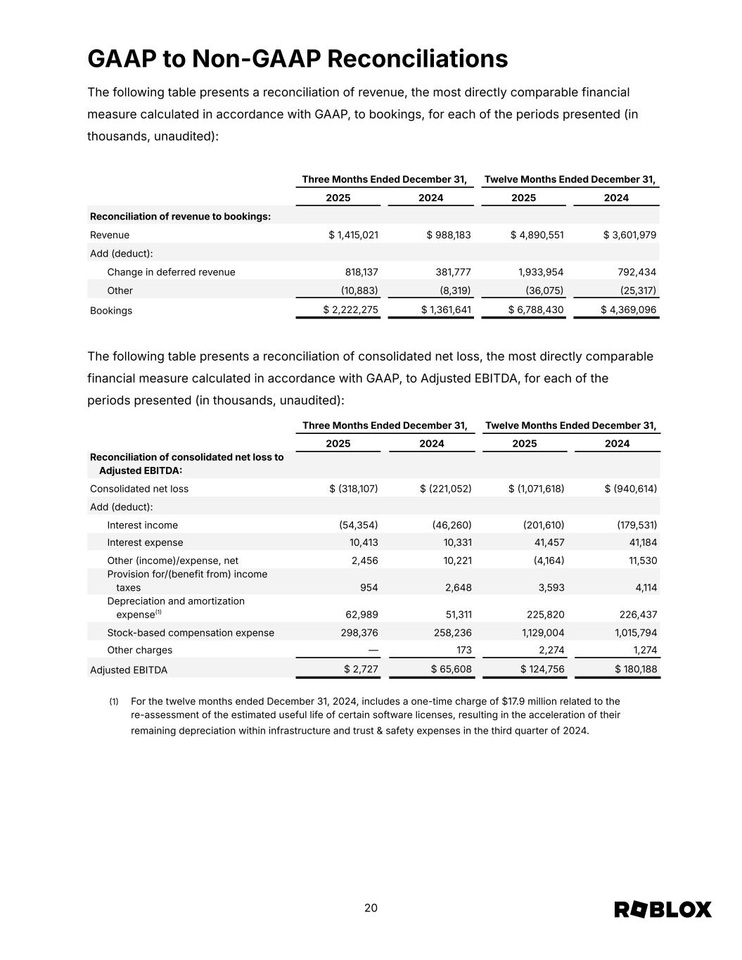 GAAP to Non-GAAP Reconciliations The following table presents a reconciliation of revenue, the most directly comparable financial measure calculated in accordance with GAAP, to bookings, for each of the periods presented (in thousands, unaudited): Three Months Ended December 31, Twelve Months Ended December 31, 2025 2024 2025 2024 Reconciliation of revenue to bookings: Revenue $ 1,415,021 $ 988,183 $ 4,890,551 $ 3,601,979 Add (deduct): Change in deferred revenue 818,137 381,777 1,933,954 792,434 Other (10,883) (8,319) (36,075) (25,317) Bookings $ 2,222,275 $ 1,361,641 $ 6,788,430 $ 4,369,096 The following table presents a reconciliation of consolidated net loss, the most directly comparable financial measure calculated in accordance with GAAP, to Adjusted EBITDA, for each of the periods presented (in thousands, unaudited): Three Months Ended December 31, Twelve Months Ended December 31, 2025 2024 2025 2024 Reconciliation of consolidated net loss to Adjusted EBITDA: Consolidated net loss $ (318,107) $ (221,052) $ (1,071,618) $ (940,614) Add (deduct): Interest income (54,354) (46,260) (201,610) (179,531) Interest expense 10,413 10,331 41,457 41,184 Other (income)/expense, net 2,456 10,221 (4,164) 11,530 Provision for/(benefit from) income taxes 954 2,648 3,593 4,114 Depreciation and amortization expense(1) 62,989 51,311 225,820 226,437 Stock-based compensation expense 298,376 258,236 1,129,004 1,015,794 Other charges — 173 2,274 1,274 Adjusted EBITDA $ 2,727 $ 65,608 $ 124,756 $ 180,188 (1)​ For the twelve months ended December 31, 2024, includes a one-time charge of $17.9 million related to the re-assessment of the estimated useful life of certain software licenses, resulting in the acceleration of their remaining depreciation within infrastructure and trust & safety expenses in the third quarter of 2024. 20