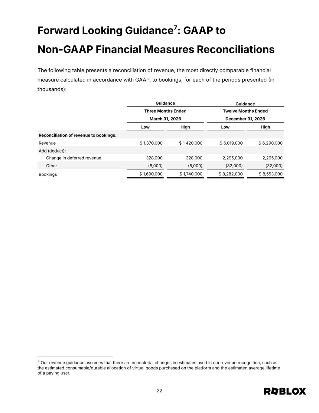 Forward Looking Guidance7: GAAP to Non-GAAP Financial Measures Reconciliations The following table presents a reconciliation of revenue, the most directly comparable financial measure calculated in accordance with GAAP, to bookings, for each of the periods presented (in thousands): Guidance Guidance Three Months Ended Twelve Months Ended March 31, 2026 December 31, 2026 Low High Low High Reconciliation of revenue to bookings: Revenue $ 1,370,000 $ 1,420,000 $ 6,019,000 $ 6,290,000 Add (deduct): Change in deferred revenue 328,000 328,000 2,295,000 2,295,000 Other (8,000) (8,000) (32,000) (32,000) Bookings $ 1,690,000 $ 1,740,000 $ 8,282,000 $ 8,553,000 7 Our revenue guidance assumes that there are no material changes in estimates used in our revenue recognition, such as the estimated consumable/durable allocation of virtual goods purchased on the platform and the estimated average lifetime of a paying user. 22