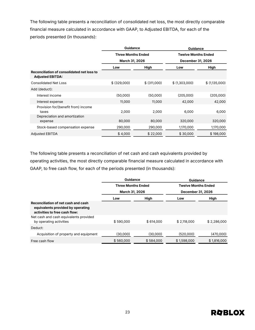 The following table presents a reconciliation of consolidated net loss, the most directly comparable financial measure calculated in accordance with GAAP, to Adjusted EBITDA, for each of the periods presented (in thousands): Guidance Guidance Three Months Ended Twelve Months Ended March 31, 2026 December 31, 2026 Low High Low High Reconciliation of consolidated net loss to Adjusted EBITDA: Consolidated Net Loss $ (329,000) $ (311,000) $ (1,303,000) $ (1,135,000) Add (deduct): Interest income (50,000) (50,000) (205,000) (205,000) Interest expense 11,000 11,000 42,000 42,000 Provision for/(benefit from) income taxes 2,000 2,000 6,000 6,000 Depreciation and amortization expense 80,000 80,000 320,000 320,000 Stock-based compensation expense 290,000 290,000 1,170,000 1,170,000 Adjusted EBITDA $ 4,000 $ 22,000 $ 30,000 $ 198,000 The following table presents a reconciliation of net cash and cash equivalents provided by operating activities, the most directly comparable financial measure calculated in accordance with GAAP, to free cash flow, for each of the periods presented (in thousands): Guidance Guidance Three Months Ended Twelve Months Ended March 31, 2026 December 31, 2026 Low High Low High Reconciliation of net cash and cash equivalents provided by operating activities to free cash flow: Net cash and cash equivalents provided by operating activities $ 590,000 $ 614,000 $ 2,118,000 $ 2,286,000 Deduct: Acquisition of property and equipment (30,000) (30,000) (520,000) (470,000) Free cash flow $ 560,000 $ 584,000 $ 1,598,000 $ 1,816,000 23