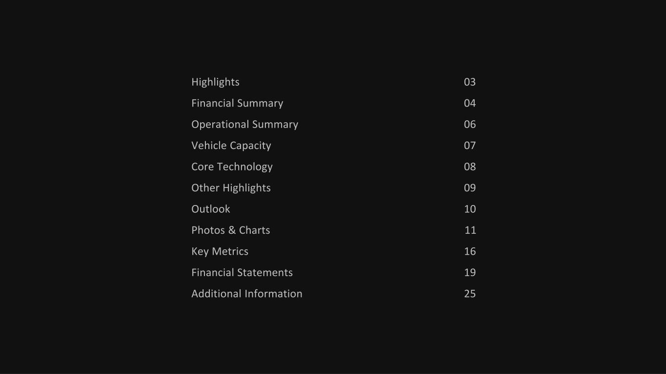Highlights 03 Financial Summary 04 Operational Summary 06 Vehicle Capacity 07 Core Technology 08 Other Highlights 09 Outlook 10 Photos & Charts 11 Key Metrics 16 Financial Statements 19 Additional Information 25