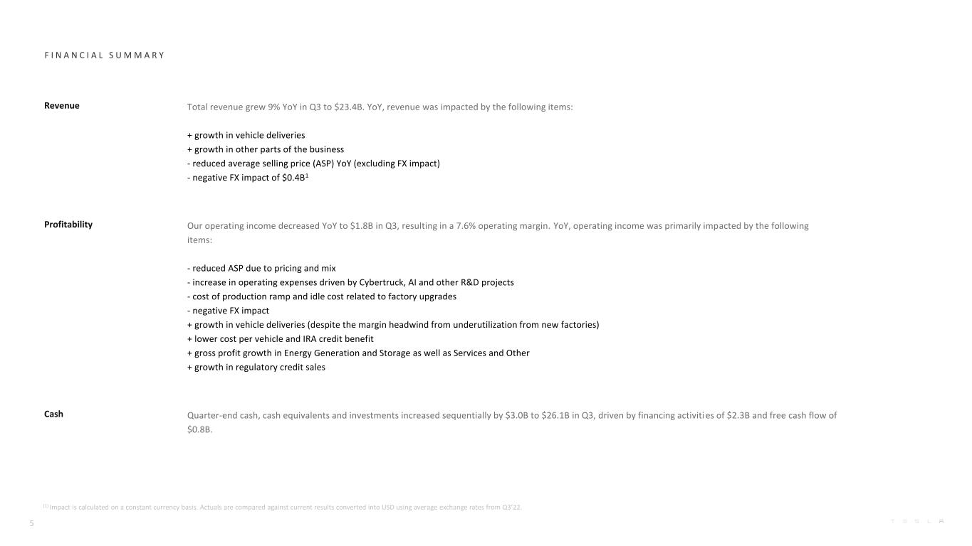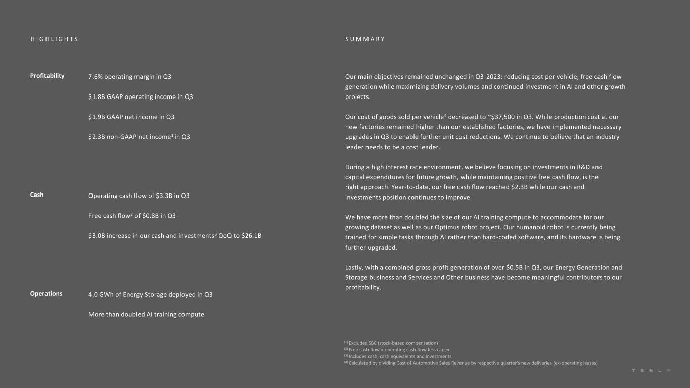 S U M M A R YH I G H L I G H T S (1) Excludes SBC (stock-based compensation) (2) Free cash flow = operating cash flow less capex (3) Includes cash, cash equivalents and investments (4) Calculated by dividing Cost of Automotive Sales Revenue by respective quarter’s new deliveries (ex-operating leases) Profitability 7.6% operating margin in Q3 $1.8B GAAP operating income in Q3 $1.9B GAAP net income in Q3 $2.3B non-GAAP net income1 in Q3 Our main objectives remained unchanged in Q3-2023: reducing cost per vehicle, free cash flow generation while maximizing delivery volumes and continued investment in AI and other growth projects. Our cost of goods sold per vehicle4 decreased to ~$37,500 in Q3. While production cost at our new factories remained higher than our established factories, we have implemented necessary upgrades in Q3 to enable further unit cost reductions. We continue to believe that an industry leader needs to be a cost leader. During a high interest rate environment, we believe focusing on investments in R&D and capital expenditures for future growth, while maintaining positive free cash flow, is the right approach. Year-to-date, our free cash flow reached $2.3B while our cash and investments position continues to improve. We have more than doubled the size of our AI training compute to accommodate for our growing dataset as well as our Optimus robot project. Our humanoid robot is currently being trained for simple tasks through AI rather than hard-coded software, and its hardware is being further upgraded. Lastly, with a combined gross profit generation of over $0.5B in Q3, our Energy Generation and Storage business and Services and Other business have become meaningful contributors to our profitability. Cash Operating cash flow of $3.3B in Q3 Free cash flow2 of $0.8B in Q3 $3.0B increase in our cash and investments3 QoQ to $26.1B Operations 4.0 GWh of Energy Storage deployed in Q3 More than doubled AI training compute
