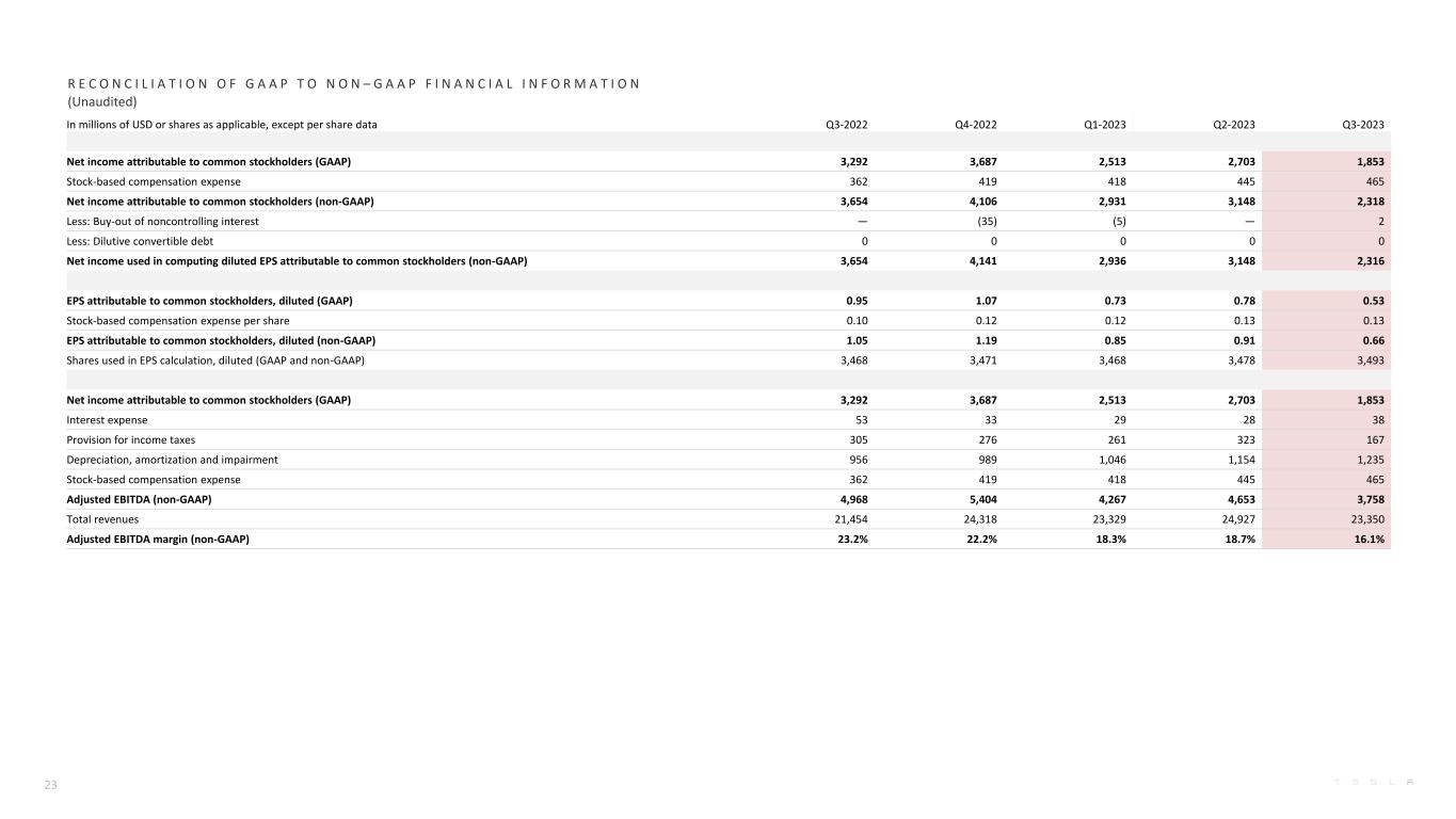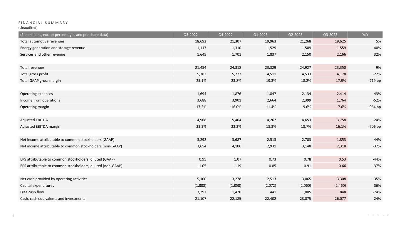 F I N A N C I A L S U M M A R Y (Unaudited) ($ in millions, except percentages and per share data) Q3-2022 Q4-2022 Q1-2023 Q2-2023 Q3-2023 YoY Total automotive revenues 18,692 21,307 19,963 21,268 19,625 5% Energy generation and storage revenue 1,117 1,310 1,529 1,509 1,559 40% Services and other revenue 1,645 1,701 1,837 2,150 2,166 32% Total revenues 21,454 24,318 23,329 24,927 23,350 9% Total gross profit 5,382 5,777 4,511 4,533 4,178 -22% Total GAAP gross margin 25.1% 23.8% 19.3% 18.2% 17.9% -719 bp Operating expenses 1,694 1,876 1,847 2,134 2,414 43% Income from operations 3,688 3,901 2,664 2,399 1,764 -52% Operating margin 17.2% 16.0% 11.4% 9.6% 7.6% -964 bp Adjusted EBITDA 4,968 5,404 4,267 4,653 3,758 -24% Adjusted EBITDA margin 23.2% 22.2% 18.3% 18.7% 16.1% -706 bp Net income attributable to common stockholders (GAAP) 3,292 3,687 2,513 2,703 1,853 -44% Net income attributable to common stockholders (non-GAAP) 3,654 4,106 2,931 3,148 2,318 -37% EPS attributable to common stockholders, diluted (GAAP) 0.95 1.07 0.73 0.78 0.53 -44% EPS attributable to common stockholders, diluted (non-GAAP) 1.05 1.19 0.85 0.91 0.66 -37% Net cash provided by operating activities 5,100 3,278 2,513 3,065 3,308 -35% Capital expenditures (1,803) (1,858) (2,072) (2,060) (2,460) 36% Free cash flow 3,297 1,420 441 1,005 848 -74% Cash, cash equivalents and investments 21,107 22,185 22,402 23,075 26,077 24% 4