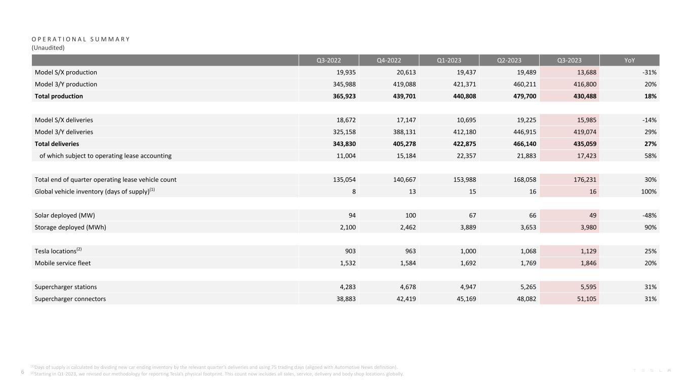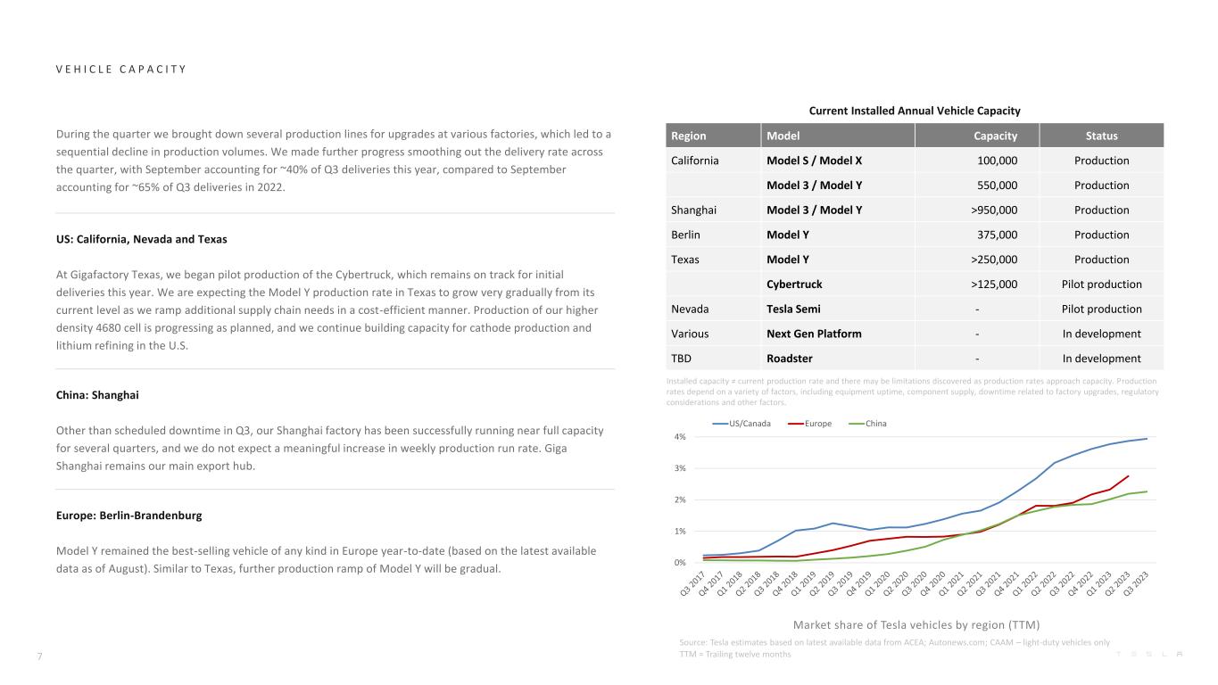 Q3-2022 Q4-2022 Q1-2023 Q2-2023 Q3-2023 YoY Model S/X production 19,935 20,613 19,437 19,489 13,688 -31% Model 3/Y production 345,988 419,088 421,371 460,211 416,800 20% Total production 365,923 439,701 440,808 479,700 430,488 18% Model S/X deliveries 18,672 17,147 10,695 19,225 15,985 -14% Model 3/Y deliveries 325,158 388,131 412,180 446,915 419,074 29% Total deliveries 343,830 405,278 422,875 466,140 435,059 27% of which subject to operating lease accounting 11,004 15,184 22,357 21,883 17,423 58% Total end of quarter operating lease vehicle count 135,054 140,667 153,988 168,058 176,231 30% Global vehicle inventory (days of supply)(1) 8 13 15 16 16 100% Solar deployed (MW) 94 100 67 66 49 -48% Storage deployed (MWh) 2,100 2,462 3,889 3,653 3,980 90% Tesla locations(2) 903 963 1,000 1,068 1,129 25% Mobile service fleet 1,532 1,584 1,692 1,769 1,846 20% Supercharger stations 4,283 4,678 4,947 5,265 5,595 31% Supercharger connectors 38,883 42,419 45,169 48,082 51,105 31% (1)Days of supply is calculated by dividing new car ending inventory by the relevant quarter’s deliveries and using 75 trading days (aligned with Automotive News definition). (2)Starting in Q1-2023, we revised our methodology for reporting Tesla’s physical footprint. This count now includes all sales, service, delivery and body shop locations globally. O P E R A T I O N A L S U M M A R Y (Unaudited) 6