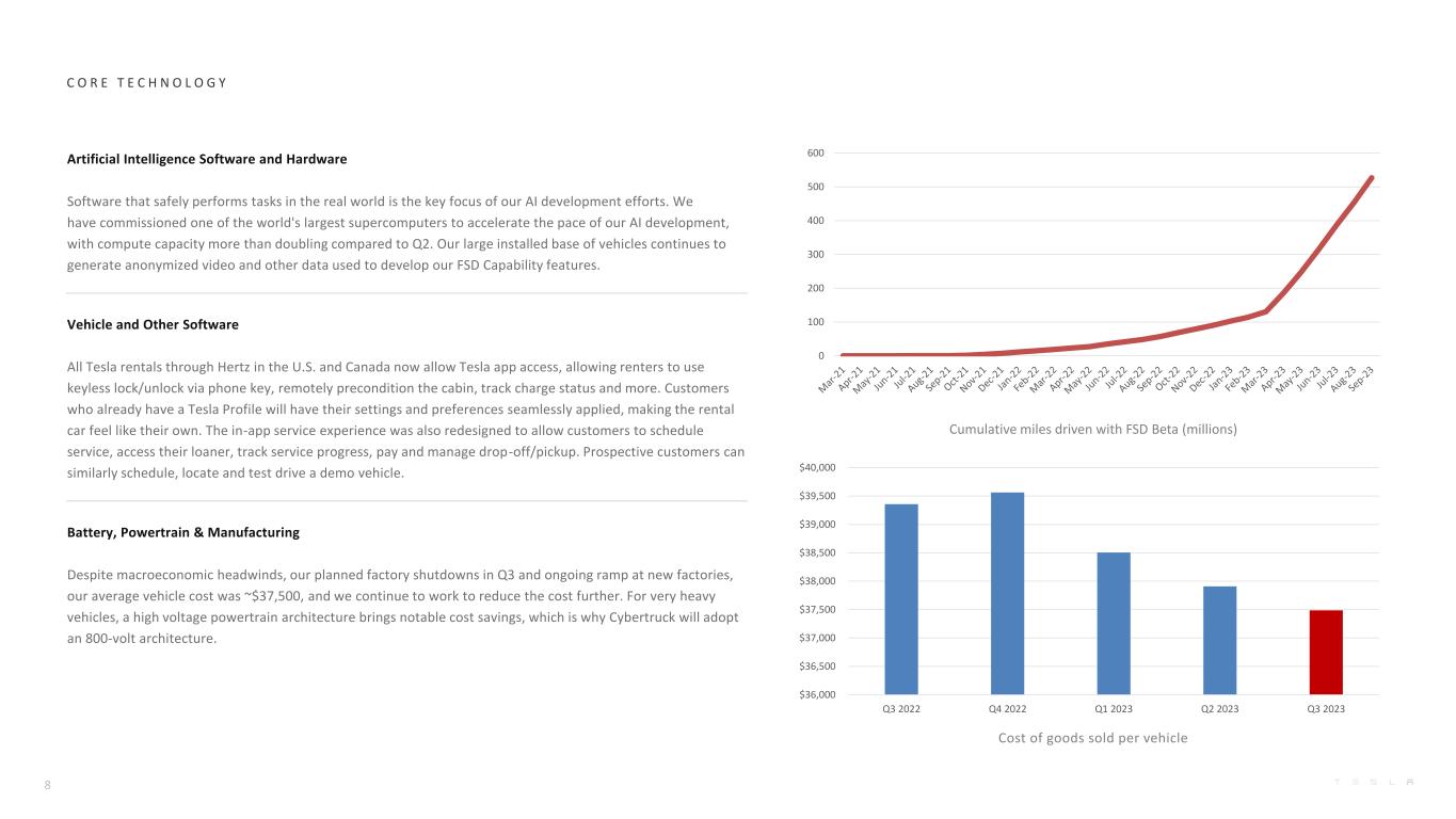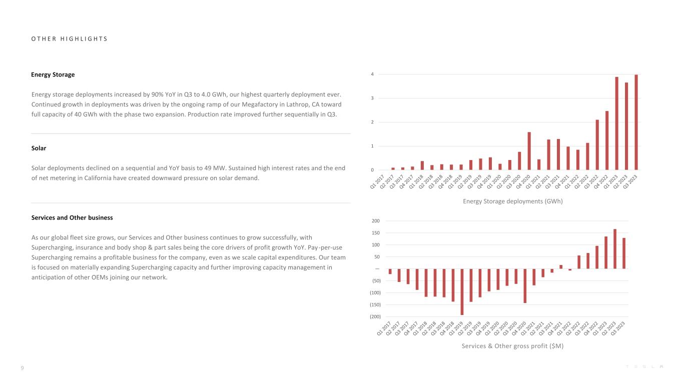 Cost of goods sold per vehicle C O R E T E C H N O L O G Y Cumulative miles driven with FSD Beta (millions) 8 Artificial Intelligence Software and Hardware Software that safely performs tasks in the real world is the key focus of our AI development efforts. We have commissioned one of the world's largest supercomputers to accelerate the pace of our AI development, with compute capacity more than doubling compared to Q2. Our large installed base of vehicles continues to generate anonymized video and other data used to develop our FSD Capability features. Vehicle and Other Software All Tesla rentals through Hertz in the U.S. and Canada now allow Tesla app access, allowing renters to use keyless lock/unlock via phone key, remotely precondition the cabin, track charge status and more. Customers who already have a Tesla Profile will have their settings and preferences seamlessly applied, making the rental car feel like their own. The in-app service experience was also redesigned to allow customers to schedule service, access their loaner, track service progress, pay and manage drop-off/pickup. Prospective customers can similarly schedule, locate and test drive a demo vehicle. Battery, Powertrain & Manufacturing Despite macroeconomic headwinds, our planned factory shutdowns in Q3 and ongoing ramp at new factories, our average vehicle cost was ~$37,500, and we continue to work to reduce the cost further. For very heavy vehicles, a high voltage powertrain architecture brings notable cost savings, which is why Cybertruck will adopt an 800-volt architecture. 0 100 200 300 400 500 600 $36,000 $36,500 $37,000 $37,500 $38,000 $38,500 $39,000 $39,500 $40,000 Q3 2022 Q4 2022 Q1 2023 Q2 2023 Q3 2023
