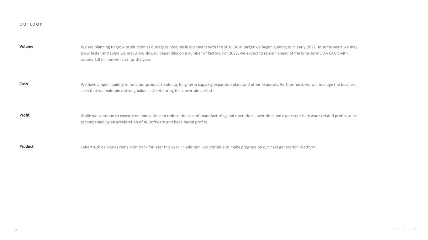O U T L O O K 10 Volume We are planning to grow production as quickly as possible in alignment with the 50% CAGR target we began guiding to in early 2021. In some years we may grow faster and some we may grow slower, depending on a number of factors. For 2023, we expect to remain ahead of the long -term 50% CAGR with around 1.8 million vehicles for the year. Cash We have ample liquidity to fund our product roadmap, long-term capacity expansion plans and other expenses. Furthermore, we will manage the business such that we maintain a strong balance sheet during this uncertain period. Profit While we continue to execute on innovations to reduce the cost of manufacturing and operations, over time, we expect our hardware-related profits to be accompanied by an acceleration of AI, software and fleet-based profits. Product Cybertruck deliveries remain on track for later this year. In addition, we continue to make progress on our next generation p latform.