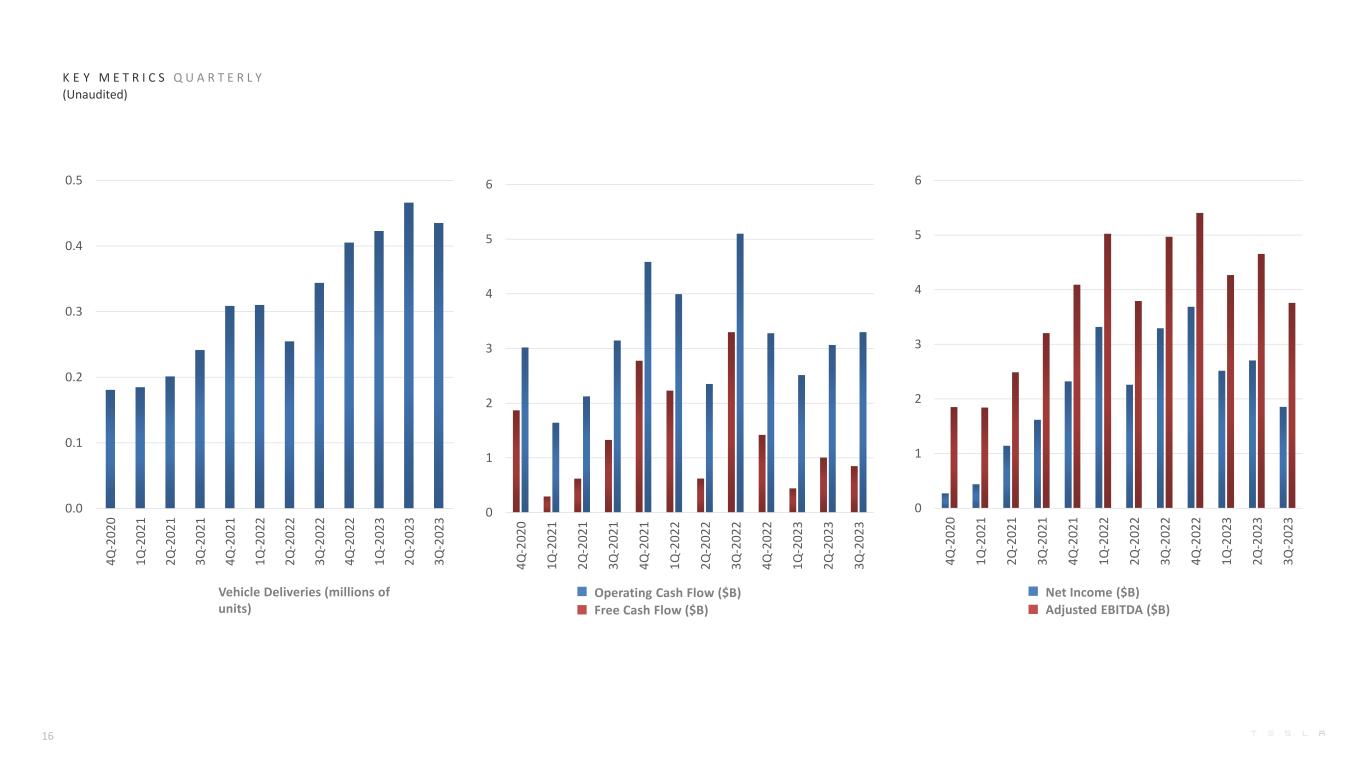 Vehicle Deliveries (millions of units) K E Y M E T R I C S Q U A R T E R L Y (Unaudited) Operating Cash Flow ($B) Free Cash Flow ($B) Net Income ($B) Adjusted EBITDA ($B) 16 0.0 0.1 0.2 0.3 0.4 0.5 4 Q -2 0 2 0 1 Q -2 0 2 1 2 Q -2 0 2 1 3 Q -2 0 2 1 4 Q -2 0 2 1 1 Q -2 0 2 2 2 Q -2 0 2 2 3 Q -2 0 2 2 4 Q -2 0 2 2 1 Q -2 0 2 3 2 Q -2 0 2 3 3 Q -2 0 2 3 0 1 2 3 4 5 6 4 Q -2 0 2 0 1 Q -2 0 2 1 2 Q -2 0 2 1 3 Q -2 0 2 1 4 Q -2 0 2 1 1 Q -2 0 2 2 2 Q -2 0 2 2 3 Q -2 0 2 2 4 Q -2 0 2 2 1 Q -2 0 2 3 2 Q -2 0 2 3 3 Q -2 0 2 3 0 1 2 3 4 5 6 4 Q -2 0 2 0 1 Q -2 0 2 1 2 Q -2 0 2 1 3 Q -2 0 2 1 4 Q -2 0 2 1 1 Q -2 0 2 2 2 Q -2 0 2 2 3 Q -2 0 2 2 4 Q -2 0 2 2 1 Q -2 0 2 3 2 Q -2 0 2 3 3 Q -2 0 2 3