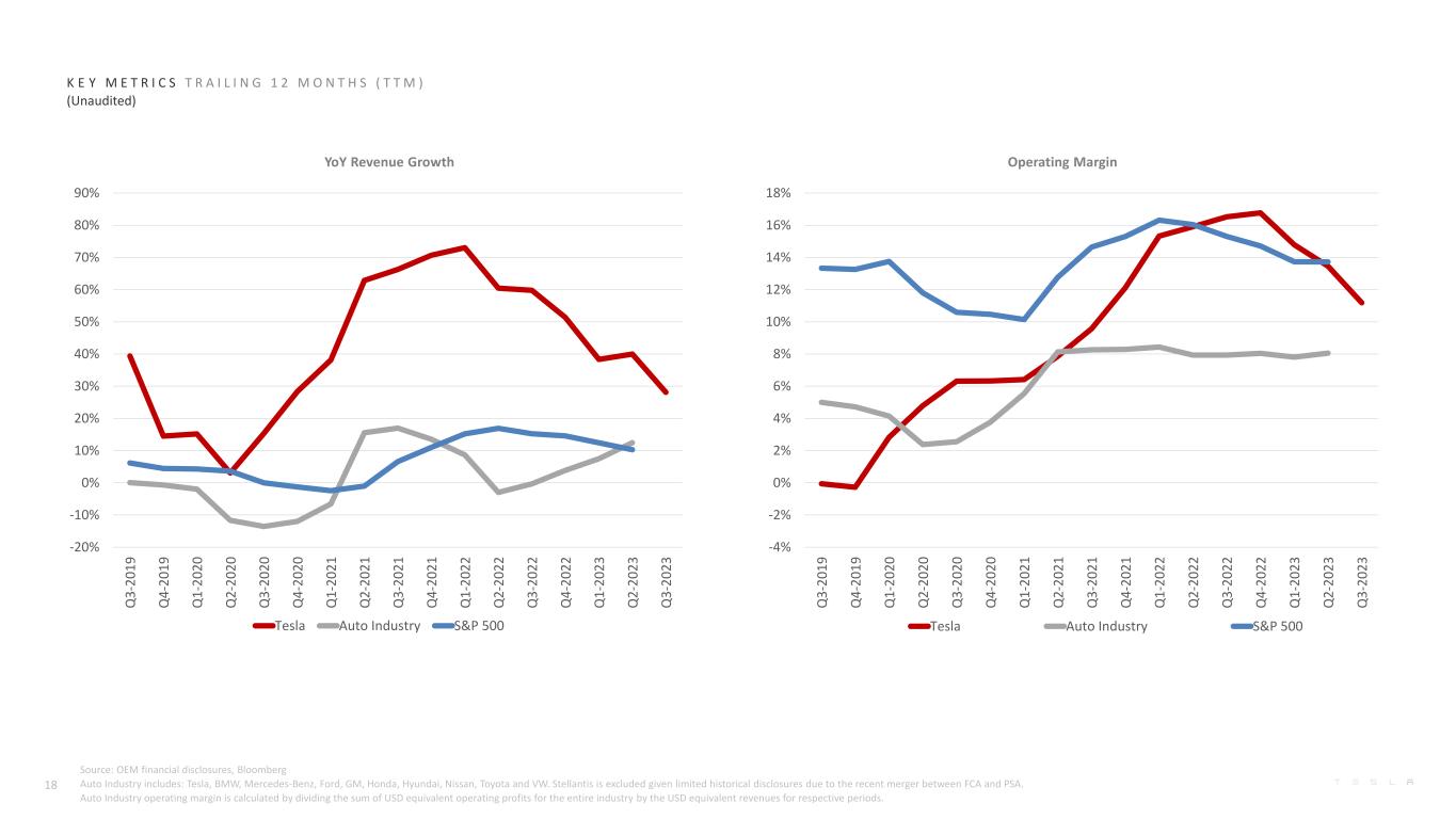 K E Y M E T R I C S T R A I L I N G 1 2 M O N T H S ( T T M ) (Unaudited) 18 YoY Revenue Growth Operating Margin Source: OEM financial disclosures, Bloomberg Auto Industry includes: Tesla, BMW, Mercedes-Benz, Ford, GM, Honda, Hyundai, Nissan, Toyota and VW. Stellantis is excluded given limited historical disclosures due to the recent merger between FCA and PSA. Auto Industry operating margin is calculated by dividing the sum of USD equivalent operating profits for the entire industry by the USD equivalent revenues for respective periods. -20% -10% 0% 10% 20% 30% 40% 50% 60% 70% 80% 90% Q 3 -2 0 1 9 Q 4 -2 0 1 9 Q 1 -2 0 2 0 Q 2 -2 0 2 0 Q 3 -2 0 2 0 Q 4 -2 0 2 0 Q 1 -2 0 2 1 Q 2 -2 0 2 1 Q 3 -2 0 2 1 Q 4 -2 0 2 1 Q 1 -2 0 2 2 Q 2 -2 0 2 2 Q 3 -2 0 2 2 Q 4 -2 0 2 2 Q 1 -2 0 2 3 Q 2 -2 0 2 3 Q 3 -2 0 2 3 Tesla Auto Industry S&P 500 -4% -2% 0% 2% 4% 6% 8% 10% 12% 14% 16% 18% Q 3 -2 0 1 9 Q 4 -2 0 1 9 Q 1 -2 0 2 0 Q 2 -2 0 2 0 Q 3 -2 0 2 0 Q 4 -2 0 2 0 Q 1 -2 0 2 1 Q 2 -2 0 2 1 Q 3 -2 0 2 1 Q 4 -2 0 2 1 Q 1 -2 0 2 2 Q 2 -2 0 2 2 Q 3 -2 0 2 2 Q 4 -2 0 2 2 Q 1 -2 0 2 3 Q 2 -2 0 2 3 Q 3 -2 0 2 3 Tesla Auto Industry S&P 500