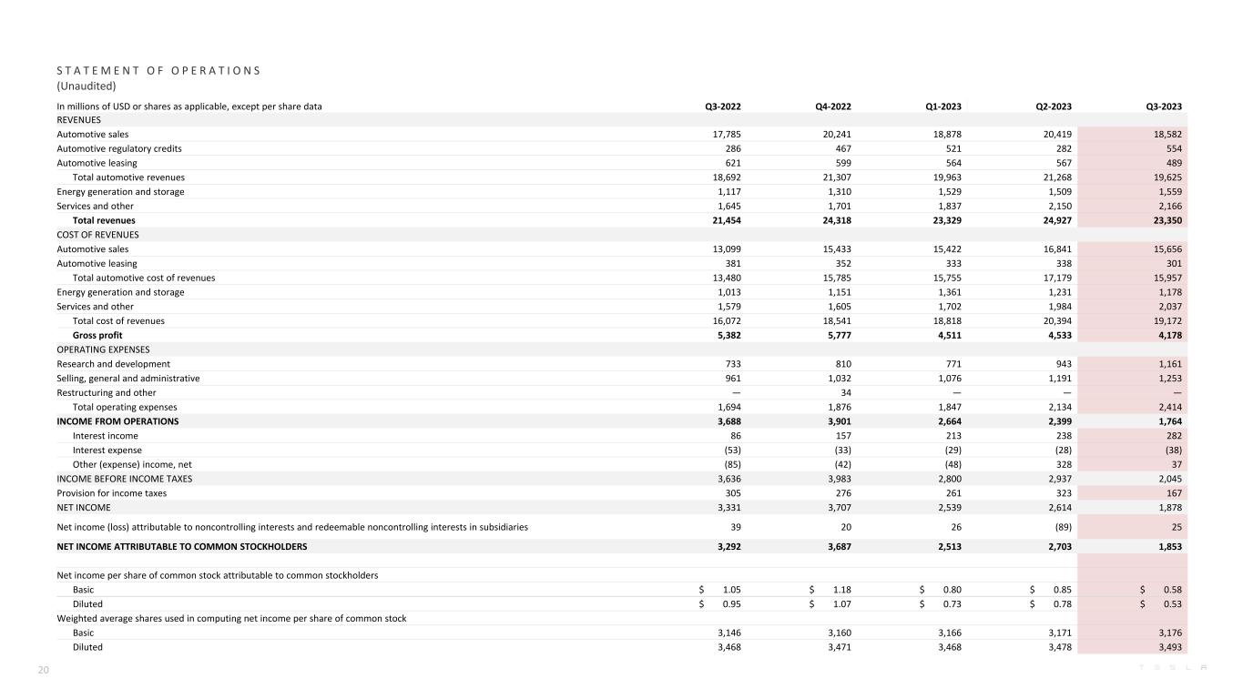 In millions of USD or shares as applicable, except per share data Q3-2022 Q4-2022 Q1-2023 Q2-2023 Q3-2023 REVENUES Automotive sales 17,785 20,241 18,878 20,419 18,582 Automotive regulatory credits 286 467 521 282 554 Automotive leasing 621 599 564 567 489 Total automotive revenues 18,692 21,307 19,963 21,268 19,625 Energy generation and storage 1,117 1,310 1,529 1,509 1,559 Services and other 1,645 1,701 1,837 2,150 2,166 Total revenues 21,454 24,318 23,329 24,927 23,350 COST OF REVENUES Automotive sales 13,099 15,433 15,422 16,841 15,656 Automotive leasing 381 352 333 338 301 Total automotive cost of revenues 13,480 15,785 15,755 17,179 15,957 Energy generation and storage 1,013 1,151 1,361 1,231 1,178 Services and other 1,579 1,605 1,702 1,984 2,037 Total cost of revenues 16,072 18,541 18,818 20,394 19,172 Gross profit 5,382 5,777 4,511 4,533 4,178 OPERATING EXPENSES Research and development 733 810 771 943 1,161 Selling, general and administrative 961 1,032 1,076 1,191 1,253 Restructuring and other — 34 — — — Total operating expenses 1,694 1,876 1,847 2,134 2,414 INCOME FROM OPERATIONS 3,688 3,901 2,664 2,399 1,764 Interest income 86 157 213 238 282 Interest expense (53) (33) (29) (28) (38) Other (expense) income, net (85) (42) (48) 328 37 INCOME BEFORE INCOME TAXES 3,636 3,983 2,800 2,937 2,045 Provision for income taxes 305 276 261 323 167 NET INCOME 3,331 3,707 2,539 2,614 1,878 Net income (loss) attributable to noncontrolling interests and redeemable noncontrolling interests in subsidiaries 39 20 26 (89) 25 NET INCOME ATTRIBUTABLE TO COMMON STOCKHOLDERS 3,292 3,687 2,513 2,703 1,853 Net income per share of common stock attributable to common stockholders Basic $ 1.05 $ 1.18 $ 0.80 $ 0.85 $ 0.58 Diluted $ 0.95 $ 1.07 $ 0.73 $ 0.78 $ 0.53 Weighted average shares used in computing net income per share of common stock Basic 3,146 3,160 3,166 3,171 3,176 Diluted 3,468 3,471 3,468 3,478 3,493 S T A T E M E N T O F O P E R A T I O N S (Unaudited) 20