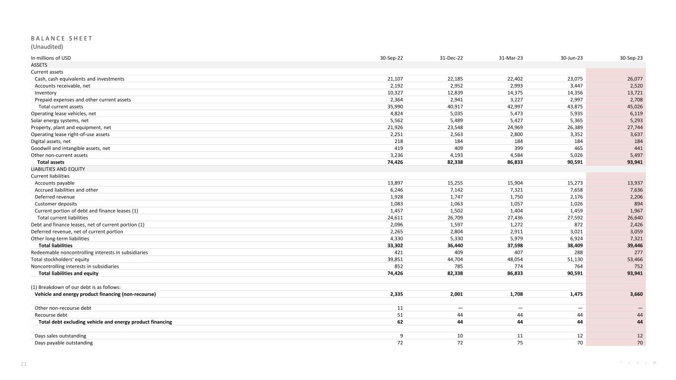B A L A N C E S H E E T (Unaudited) In millions of USD 30-Sep-22 31-Dec-22 31-Mar-23 30-Jun-23 30-Sep-23 ASSETS Current assets Cash, cash equivalents and investments 21,107 22,185 22,402 23,075 26,077 Accounts receivable, net 2,192 2,952 2,993 3,447 2,520 Inventory 10,327 12,839 14,375 14,356 13,721 Prepaid expenses and other current assets 2,364 2,941 3,227 2,997 2,708 Total current assets 35,990 40,917 42,997 43,875 45,026 Operating lease vehicles, net 4,824 5,035 5,473 5,935 6,119 Solar energy systems, net 5,562 5,489 5,427 5,365 5,293 Property, plant and equipment, net 21,926 23,548 24,969 26,389 27,744 Operating lease right-of-use assets 2,251 2,563 2,800 3,352 3,637 Digital assets, net 218 184 184 184 184 Goodwill and intangible assets, net 419 409 399 465 441 Other non-current assets 3,236 4,193 4,584 5,026 5,497 Total assets 74,426 82,338 86,833 90,591 93,941 LIABILITIES AND EQUITY Current liabilities Accounts payable 13,897 15,255 15,904 15,273 13,937 Accrued liabilities and other 6,246 7,142 7,321 7,658 7,636 Deferred revenue 1,928 1,747 1,750 2,176 2,206 Customer deposits 1,083 1,063 1,057 1,026 894 Current portion of debt and finance leases (1) 1,457 1,502 1,404 1,459 1,967 Total current liabilities 24,611 26,709 27,436 27,592 26,640 Debt and finance leases, net of current portion (1) 2,096 1,597 1,272 872 2,426 Deferred revenue, net of current portion 2,265 2,804 2,911 3,021 3,059 Other long-term liabilities 4,330 5,330 5,979 6,924 7,321 Total liabilities 33,302 36,440 37,598 38,409 39,446 Redeemable noncontrolling interests in subsidiaries 421 409 407 288 277 Total stockholders' equity 39,851 44,704 48,054 51,130 53,466 Noncontrolling interests in subsidiaries 852 785 774 764 752 Total liabilities and equity 74,426 82,338 86,833 90,591 93,941 (1) Breakdown of our debt is as follows: Vehicle and energy product financing (non-recourse) 2,335 2,001 1,708 1,475 3,660 Other non-recourse debt 11 — — — — Recourse debt 51 44 44 44 44 Total debt excluding vehicle and energy product financing 62 44 44 44 44 Days sales outstanding 9 10 11 12 12 Days payable outstanding 72 72 75 70 70 21