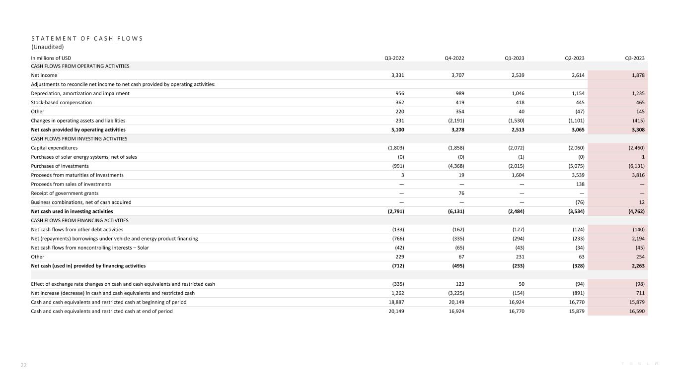 In millions of USD Q3-2022 Q4-2022 Q1-2023 Q2-2023 Q3-2023 CASH FLOWS FROM OPERATING ACTIVITIES Net income 3,331 3,707 2,539 2,614 1,878 Adjustments to reconcile net income to net cash provided by operating activities: Depreciation, amortization and impairment 956 989 1,046 1,154 1,235 Stock-based compensation 362 419 418 445 465 Other 220 354 40 (47) 145 Changes in operating assets and liabilities 231 (2,191) (1,530) (1,101) (415) Net cash provided by operating activities 5,100 3,278 2,513 3,065 3,308 CASH FLOWS FROM INVESTING ACTIVITIES Capital expenditures (1,803) (1,858) (2,072) (2,060) (2,460) Purchases of solar energy systems, net of sales (0) (0) (1) (0) 1 Purchases of investments (991) (4,368) (2,015) (5,075) (6,131) Proceeds from maturities of investments 3 19 1,604 3,539 3,816 Proceeds from sales of investments — — — 138 — Receipt of government grants — 76 — — — Business combinations, net of cash acquired — — — (76) 12 Net cash used in investing activities (2,791) (6,131) (2,484) (3,534) (4,762) CASH FLOWS FROM FINANCING ACTIVITIES Net cash flows from other debt activities (133) (162) (127) (124) (140) Net (repayments) borrowings under vehicle and energy product financing (766) (335) (294) (233) 2,194 Net cash flows from noncontrolling interests – Solar (42) (65) (43) (34) (45) Other 229 67 231 63 254 Net cash (used in) provided by financing activities (712) (495) (233) (328) 2,263 Effect of exchange rate changes on cash and cash equivalents and restricted cash (335) 123 50 (94) (98) Net increase (decrease) in cash and cash equivalents and restricted cash 1,262 (3,225) (154) (891) 711 Cash and cash equivalents and restricted cash at beginning of period 18,887 20,149 16,924 16,770 15,879 Cash and cash equivalents and restricted cash at end of period 20,149 16,924 16,770 15,879 16,590 S T A T E M E N T O F C A S H F L O W S (Unaudited) 22