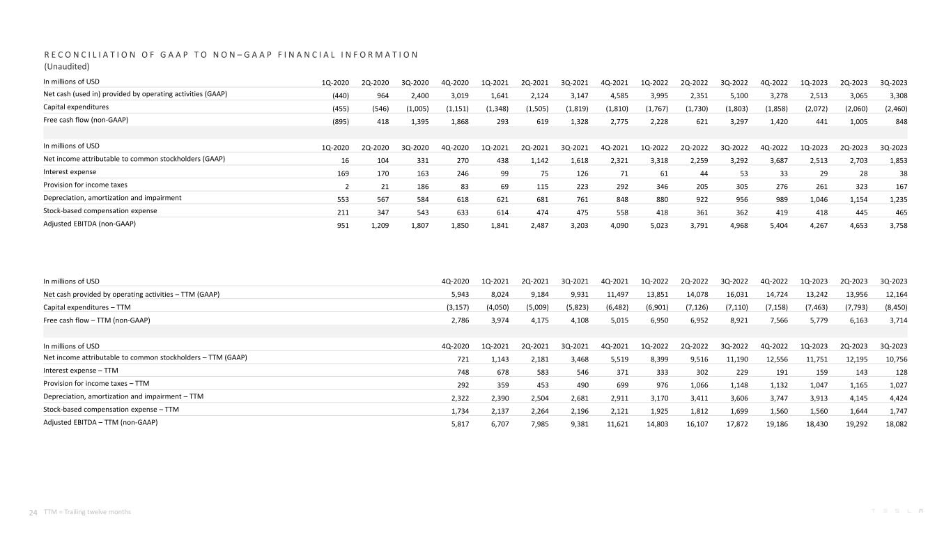 R E C O N C I L I A T I O N O F G A A P T O N O N – G A A P F I N A N C I A L I N F O R M A T I O N (Unaudited) In millions of USD 4Q-2020 1Q-2021 2Q-2021 3Q-2021 4Q-2021 1Q-2022 2Q-2022 3Q-2022 4Q-2022 1Q-2023 2Q-2023 3Q-2023 Net cash provided by operating activities – TTM (GAAP) 5,943 8,024 9,184 9,931 11,497 13,851 14,078 16,031 14,724 13,242 13,956 12,164 Capital expenditures – TTM (3,157) (4,050) (5,009) (5,823) (6,482) (6,901) (7,126) (7,110) (7,158) (7,463) (7,793) (8,450) Free cash flow – TTM (non-GAAP) 2,786 3,974 4,175 4,108 5,015 6,950 6,952 8,921 7,566 5,779 6,163 3,714 In millions of USD 4Q-2020 1Q-2021 2Q-2021 3Q-2021 4Q-2021 1Q-2022 2Q-2022 3Q-2022 4Q-2022 1Q-2023 2Q-2023 3Q-2023 Net income attributable to common stockholders – TTM (GAAP) 721 1,143 2,181 3,468 5,519 8,399 9,516 11,190 12,556 11,751 12,195 10,756 Interest expense – TTM 748 678 583 546 371 333 302 229 191 159 143 128 Provision for income taxes – TTM 292 359 453 490 699 976 1,066 1,148 1,132 1,047 1,165 1,027 Depreciation, amortization and impairment – TTM 2,322 2,390 2,504 2,681 2,911 3,170 3,411 3,606 3,747 3,913 4,145 4,424 Stock-based compensation expense – TTM 1,734 2,137 2,264 2,196 2,121 1,925 1,812 1,699 1,560 1,560 1,644 1,747 Adjusted EBITDA – TTM (non-GAAP) 5,817 6,707 7,985 9,381 11,621 14,803 16,107 17,872 19,186 18,430 19,292 18,082 TTM = Trailing twelve months In millions of USD 1Q-2020 2Q-2020 3Q-2020 4Q-2020 1Q-2021 2Q-2021 3Q-2021 4Q-2021 1Q-2022 2Q-2022 3Q-2022 4Q-2022 1Q-2023 2Q-2023 3Q-2023 Net cash (used in) provided by operating activities (GAAP) (440) 964 2,400 3,019 1,641 2,124 3,147 4,585 3,995 2,351 5,100 3,278 2,513 3,065 3,308 Capital expenditures (455) (546) (1,005) (1,151) (1,348) (1,505) (1,819) (1,810) (1,767) (1,730) (1,803) (1,858) (2,072) (2,060) (2,460) Free cash flow (non-GAAP) (895) 418 1,395 1,868 293 619 1,328 2,775 2,228 621 3,297 1,420 441 1,005 848 In millions of USD 1Q-2020 2Q-2020 3Q-2020 4Q-2020 1Q-2021 2Q-2021 3Q-2021 4Q-2021 1Q-2022 2Q-2022 3Q-2022 4Q-2022 1Q-2023 2Q-2023 3Q-2023 Net income attributable to common stockholders (GAAP) 16 104 331 270 438 1,142 1,618 2,321 3,318 2,259 3,292 3,687 2,513 2,703 1,853 Interest expense 169 170 163 246 99 75 126 71 61 44 53 33 29 28 38 Provision for income taxes 2 21 186 83 69 115 223 292 346 205 305 276 261 323 167 Depreciation, amortization and impairment 553 567 584 618 621 681 761 848 880 922 956 989 1,046 1,154 1,235 Stock-based compensation expense 211 347 543 633 614 474 475 558 418 361 362 419 418 445 465 Adjusted EBITDA (non-GAAP) 951 1,209 1,807 1,850 1,841 2,487 3,203 4,090 5,023 3,791 4,968 5,404 4,267 4,653 3,758 24