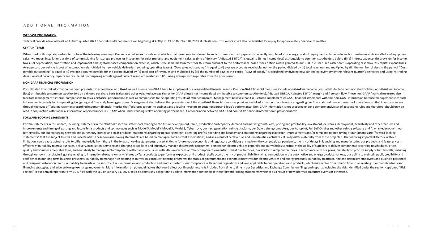 A D D I T I O N A L I N F O R M A T I O N WEBCAST INFORMATION Tesla will provide a live webcast of its third quarter 2023 financial results conference call beginning at 4:30 p.m. CT on October 18, 2023 at ir.tesla.com. This webcast will also be available for replay for approximately one year thereafter. CERTAIN TERMS When used in this update, certain terms have the following meanings. Our vehicle deliveries include only vehicles that have been transferred to end customers with all paperwork correctly completed. Our energy product deployment volume includes both customer units installed and equipment sales; we report installations at time of commissioning for storage projects or inspection for solar projects, and equipment sales at time of delivery. "Adjusted EBITDA" is equal to (i) net income (loss) attributable to common stockholders before (ii)(a) interest expense, (b) provision for income taxes, (c) depreciation, amortization and impairment and (d) stock-based compensation expense, which is the same measurement for this term pursuant to the performance-based stock option award granted to our CEO in 2018. "Free cash flow" is operating cash flow less capital expenditures. Average cost per vehicle is cost of automotive sales divided by new vehicle deliveries (excluding operating leases). “Days sales outstanding” is equal to (i) average accounts receivable, net for the period divided by (ii) total revenues and multiplied by (iii) the number of days in the period. “Days payable outstanding” is equal to (i) average accounts payable for the period divided by (ii) total cost of revenues and multiplied by (iii) the number of days in the period. “Days of supply” is calculated by dividing new car ending inventory by the relevant quarter’s deliveries and using 75 trading days. Constant currency impacts are calculated by comparing actuals against current results converted into USD using average exchange rates from the prior period. NON-GAAP FINANCIAL INFORMATION Consolidated financial information has been presented in accordance with GAAP as well as on a non-GAAP basis to supplement our consolidated financial results. Our non-GAAP financial measures include non-GAAP net income (loss) attributable to common stockholders, non-GAAP net income (loss) attributable to common stockholders on a diluted per share basis (calculated using weighted average shares for GAAP diluted net income (loss) attributable to common stockholders), Adjusted EBITDA, Adjusted EBITDA margin and free cash flow. These non-GAAP financial measures also facilitate management’s internal comparisons to Tesla’s historical performance as well as comparisons to the operating results of other companies. Management believes that it is useful to supplement its GAAP financial statements with this non-GAAP information because management uses such information internally for its operating, budgeting and financial planning purposes. Management also believes that presentation of the non-GAAP financial measures provides useful information to our investors regarding our financial condition and results of operations, so that investors can see through the eyes of Tesla management regarding important financial metrics that Tesla uses to run the business and allowing investors to better understand Tesla’s performance. Non-GAAP information is not prepared under a comprehensive set of accounting rules and therefore, should only be read in conjunction with financial information reported under U.S. GAAP when understanding Tesla’s operating performance. A reconciliation between GAAP and non-GAAP financial information is provided above. FORWARD-LOOKING STATEMENTS Certain statements in this update, including statements in the “Outlook” section; statements relating to the future development, ramp, production and capacity, demand and market growth, cost, pricing and profitability, investment, deliveries, deployment, availability and other features and improvements and timing of existing and future Tesla products and technologies such as Model 3, Model Y, Model X, Model S, Cybertruck, our next generation vehicle platform, our Dojo training computers, our Autopilot, Full Self-Driving and other vehicle software and AI enabled products, our battery cells, our Supercharging network and our energy storage and solar products; statements regarding operating margin, operating profits, spending and liquidity; and statements regarding expansion, improvements and/or ramp and related timing at our factories are “forward-looking statements” that are subject to risks and uncertainties. These forward-looking statements are based on management’s current expectations, and as a result of certain risks and uncertainties, actual results may differ materially from those projected. The following important factors, without limitation, could cause actual results to differ materially from those in the forward-looking statements: uncertainties in future macroeconomic and regulatory conditions arising from the current global pandemic; the risk of delays in launching and manufacturing our products and features cost- effectively; our ability to grow our sales, delivery, installation, servicing and charging capabilities and effectively manage this growth; consumers’ demand for electric vehicles generally and our vehicles specifically; the ability of suppliers to deliver components according to schedules, prices, quality and volumes acceptable to us, and our ability to manage such components effectively; any issues with lithium-ion cells or other components manufactured at our factories; our ability to ramp our factories in accordance with our plans; our ability to procure supply of battery cells, including through our own manufacturing; risks relating to international expansion; any failures by Tesla products to perform as expected or if product recalls occur; the risk of product liability claims; competition in the automotive and energy product markets; o