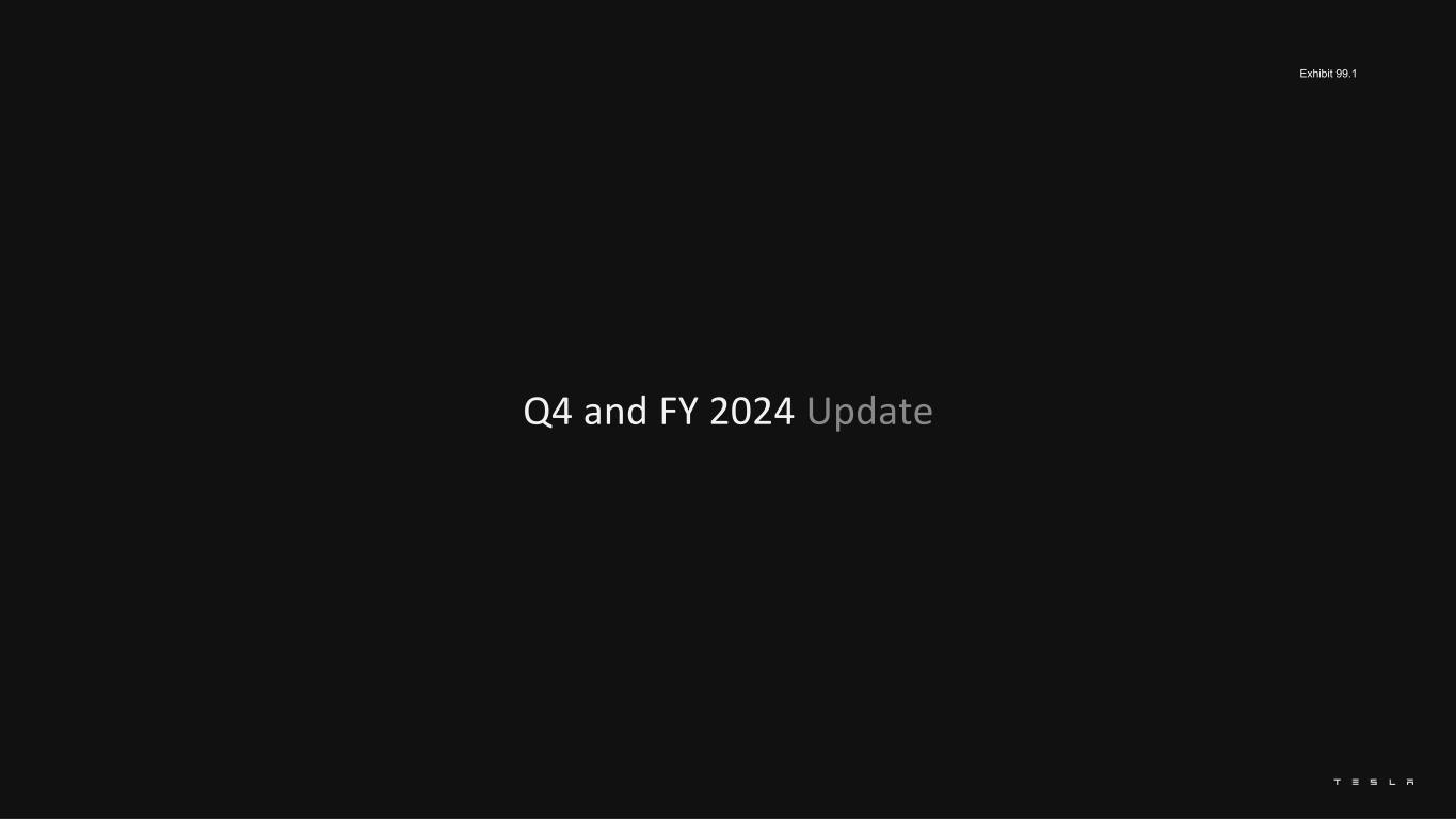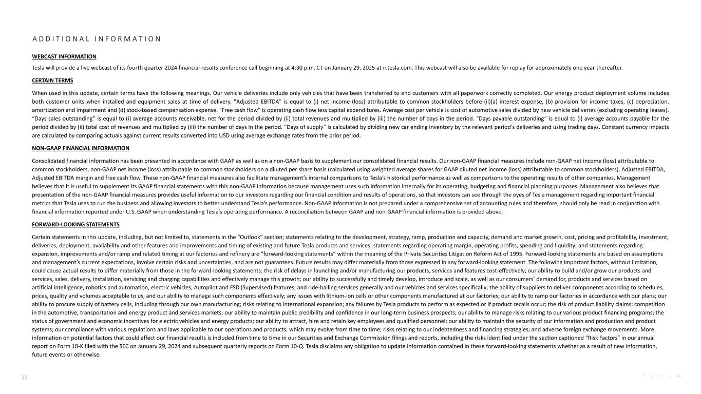 A D D I T I O N A L I N F O R M A T I O N WEBCAST INFORMATION Tesla will provide a live webcast of its fourth quarter 2024 financial results conference call beginning at 4:30 p.m. CT on January 29, 2025 at ir.tesla.com. This webcast will also be available for replay for approximately one year thereafter. CERTAIN TERMS When used in this update, certain terms have the following meanings. Our vehicle deliveries include only vehicles that have been transferred to end customers with all paperwork correctly completed. Our energy product deployment volume includes both customer units when installed and equipment sales at time of delivery. "Adjusted EBITDA" is equal to (i) net income (loss) attributable to common stockholders before (ii)(a) interest expense, (b) provision for income taxes, (c) depreciation, amortization and impairment and (d) stock-based compensation expense. "Free cash flow" is operating cash flow less capital expenditures. Average cost per vehicle is cost of automotive sales divided by new vehicle deliveries (excluding operating leases). “Days sales outstanding” is equal to (i) average accounts receivable, net for the period divided by (ii) total revenues and multiplied by (iii) the number of days in the period. “Days payable outstanding” is equal to (i) average accounts payable for the period divided by (ii) total cost of revenues and multiplied by (iii) the number of days in the period. “Days of supply” is calculated by dividing new car ending inventory by the relevant period's deliveries and using trading days. Constant currency impacts are calculated by comparing actuals against current results converted into USD using average exchange rates from the prior period. NON-GAAP FINANCIAL INFORMATION Consolidated financial information has been presented in accordance with GAAP as well as on a non-GAAP basis to supplement our consolidated financial results. Our non-GAAP financial measures include non-GAAP net income (loss) attributable to common stockholders, non-GAAP net income (loss) attributable to common stockholders on a diluted per share basis (calculated using weighted average shares for GAAP diluted net income (loss) attributable to common stockholders), Adjusted EBITDA, Adjusted EBITDA margin and free cash flow. These non-GAAP financial measures also facilitate management’s internal comparisons to Tesla’s historical performance as well as comparisons to the operating results of other companies. Management believes that it is useful to supplement its GAAP financial statements with this non-GAAP information because management uses such information internally for its operating, budgeting and financial planning purposes. Management also believes that presentation of the non-GAAP financial measures provides useful information to our investors regarding our financial condition and results of operations, so that investors can see through the eyes of Tesla management regarding important financial metrics that Tesla uses to run the business and allowing investors to better understand Tesla’s performance. Non-GAAP information is not prepared under a comprehensive set of accounting rules and therefore, should only be read in conjunction with financial information reported under U.S. GAAP when understanding Tesla’s operating performance. A reconciliation between GAAP and non-GAAP financial information is provided above. FORWARD-LOOKING STATEMENTS Certain statements in this update, including, but not limited to, statements in the “Outlook” section; statements relating to the development, strategy, ramp, production and capacity, demand and market growth, cost, pricing and profitability, investment, deliveries, deployment, availability and other features and improvements and timing of existing and future Tesla products and services; statements regarding operating margin, operating profits, spending and liquidity; and statements regarding expansion, improvements and/or ramp and related timing at our factories and refinery are “forward-looking statements” within the meaning of the Private Securities Litigation Reform Act of 1995. Forward-looking statements are based on assumptions and management’s current expectations, involve certain risks and uncertainties, and are not guarantees. Future results may differ materially from those expressed in any forward-looking statement. The following important factors, without limitation, could cause actual results to differ materially from those in the forward-looking statements: the risk of delays in launching and/or manufacturing our products, services and features cost-effectively; our ability to build and/or grow our products and services, sales, delivery, installation, servicing and charging capabilities and effectively manage this growth; our ability to successfully and timely develop, introduce and scale, as well as our consumers’ demand for, products and services based on artificial intelligence, robotics and automation, electric vehicles, Autopilot and FSD (Supervised) features, and ride-hailing services generally and our vehicles and services specifically; the ability of suppliers to deliver components according to schedules, prices, quality and volumes acceptable to us, and our ability to manage such components effectively; any issues with lithium-ion cells or other components manufactured at our factories; our ability to ramp our factories in accordance with our plans; our ability to procure supply of battery cells, including through our own manufacturing; risks relating to international expansion; any failures by Tesla products to perform as expected or if product recalls occur; the risk of product liability claims; competition in the automotive, transportation and energy product and services markets; our ability to maintain public credibility and confidence in our long-term business prospects; our ability to manage risks relating to our various product financing programs; the status of government and econ