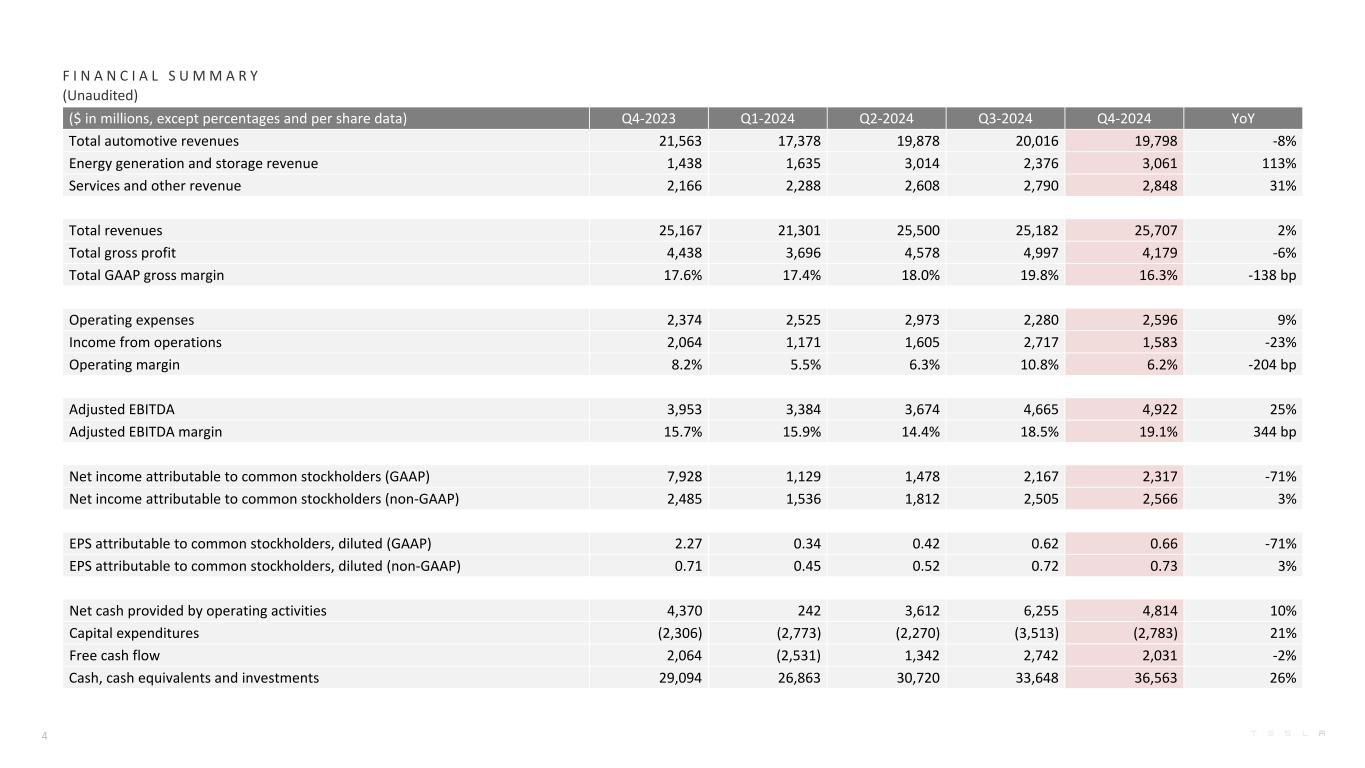 F I N A N C I A L S U M M A R Y (Unaudited) ($ in millions, except percentages and per share data) Q4-2023 Q1-2024 Q2-2024 Q3-2024 Q4-2024 YoY Total automotive revenues 21,563 17,378 19,878 20,016 19,798 -8% Energy generation and storage revenue 1,438 1,635 3,014 2,376 3,061 113% Services and other revenue 2,166 2,288 2,608 2,790 2,848 31% Total revenues 25,167 21,301 25,500 25,182 25,707 2% Total gross profit 4,438 3,696 4,578 4,997 4,179 -6% Total GAAP gross margin 17.6% 17.4% 18.0% 19.8% 16.3% -138 bp Operating expenses 2,374 2,525 2,973 2,280 2,596 9% Income from operations 2,064 1,171 1,605 2,717 1,583 -23% Operating margin 8.2% 5.5% 6.3% 10.8% 6.2% -204 bp Adjusted EBITDA 3,953 3,384 3,674 4,665 4,922 25% Adjusted EBITDA margin 15.7% 15.9% 14.4% 18.5% 19.1% 344 bp Net income attributable to common stockholders (GAAP) 7,928 1,129 1,478 2,167 2,317 -71% Net income attributable to common stockholders (non-GAAP) 2,485 1,536 1,812 2,505 2,566 3% EPS attributable to common stockholders, diluted (GAAP) 2.27 0.34 0.42 0.62 0.66 -71% EPS attributable to common stockholders, diluted (non-GAAP) 0.71 0.45 0.52 0.72 0.73 3% Net cash provided by operating activities 4,370 242 3,612 6,255 4,814 10% Capital expenditures (2,306) (2,773) (2,270) (3,513) (2,783) 21% Free cash flow 2,064 (2,531) 1,342 2,742 2,031 -2% Cash, cash equivalents and investments 29,094 26,863 30,720 33,648 36,563 26% 4