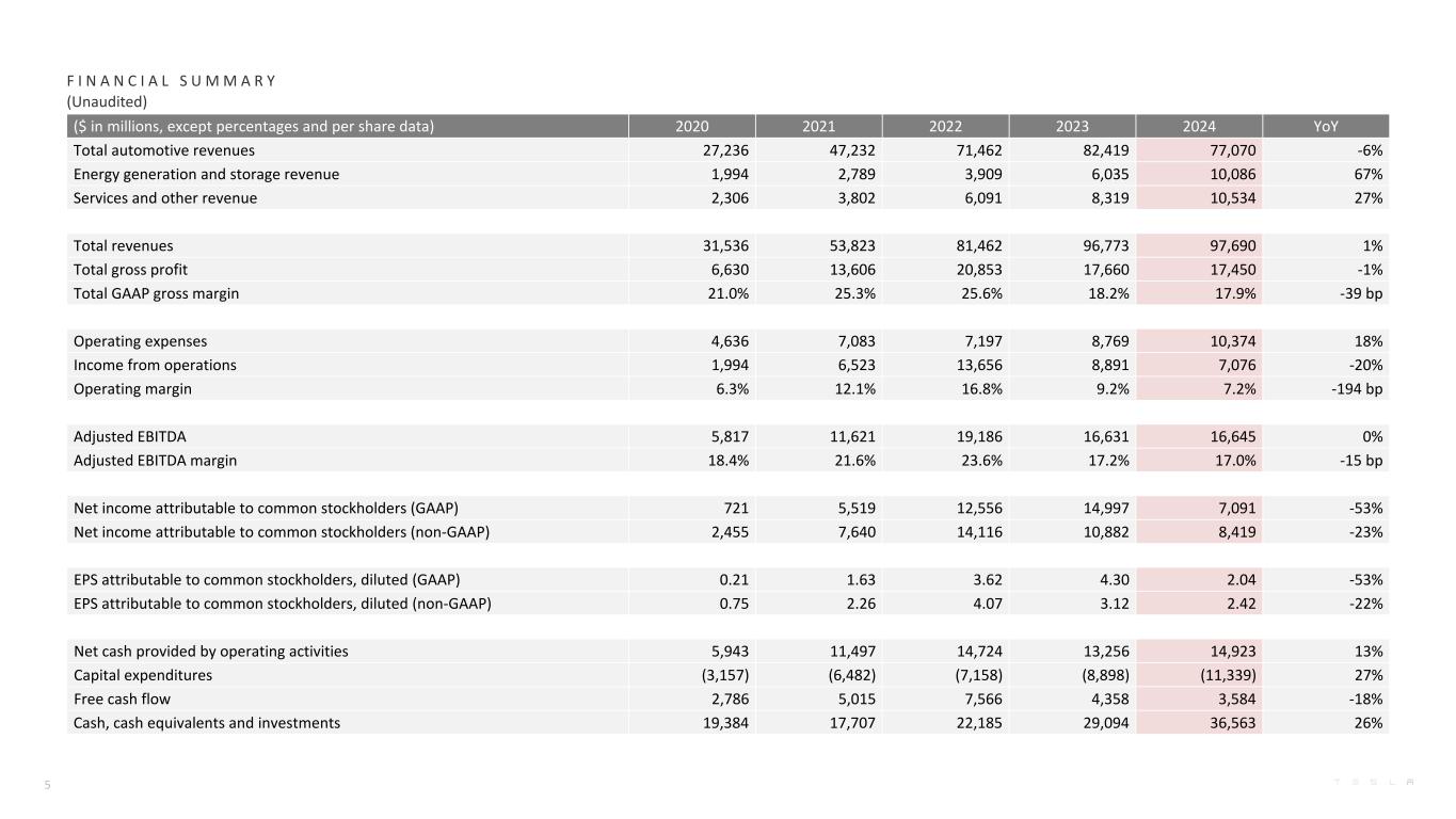 F I N A N C I A L S U M M A R Y (Unaudited) ($ in millions, except percentages and per share data) 2020 2021 2022 2023 2024 YoY Total automotive revenues 27,236 47,232 71,462 82,419 77,070 -6% Energy generation and storage revenue 1,994 2,789 3,909 6,035 10,086 67% Services and other revenue 2,306 3,802 6,091 8,319 10,534 27% Total revenues 31,536 53,823 81,462 96,773 97,690 1% Total gross profit 6,630 13,606 20,853 17,660 17,450 -1% Total GAAP gross margin 21.0% 25.3% 25.6% 18.2% 17.9% -39 bp Operating expenses 4,636 7,083 7,197 8,769 10,374 18% Income from operations 1,994 6,523 13,656 8,891 7,076 -20% Operating margin 6.3% 12.1% 16.8% 9.2% 7.2% -194 bp Adjusted EBITDA 5,817 11,621 19,186 16,631 16,645 0% Adjusted EBITDA margin 18.4% 21.6% 23.6% 17.2% 17.0% -15 bp Net income attributable to common stockholders (GAAP) 721 5,519 12,556 14,997 7,091 -53% Net income attributable to common stockholders (non-GAAP) 2,455 7,640 14,116 10,882 8,419 -23% EPS attributable to common stockholders, diluted (GAAP) 0.21 1.63 3.62 4.30 2.04 -53% EPS attributable to common stockholders, diluted (non-GAAP) 0.75 2.26 4.07 3.12 2.42 -22% Net cash provided by operating activities 5,943 11,497 14,724 13,256 14,923 13% Capital expenditures (3,157) (6,482) (7,158) (8,898) (11,339) 27% Free cash flow 2,786 5,015 7,566 4,358 3,584 -18% Cash, cash equivalents and investments 19,384 17,707 22,185 29,094 36,563 26% 5