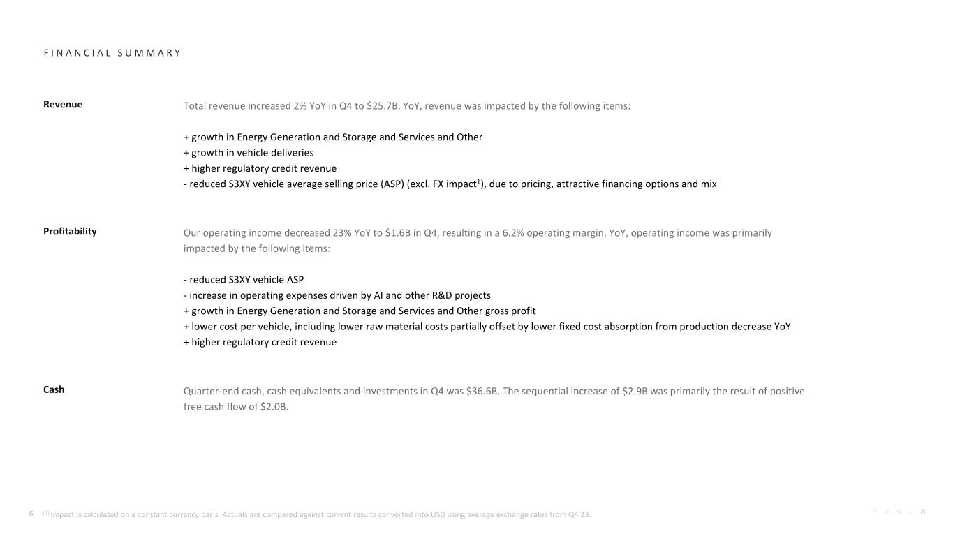 F I N A N C I A L S U M M A R Y Revenue Total revenue increased 2% YoY in Q4 to $25.7B. YoY, revenue was impacted by the following items: + growth in Energy Generation and Storage and Services and Other + growth in vehicle deliveries + higher regulatory credit revenue - reduced S3XY vehicle average selling price (ASP) (excl. FX impact1), due to pricing, attractive financing options and mix Profitability Our operating income decreased 23% YoY to $1.6B in Q4, resulting in a 6.2% operating margin. YoY, operating income was primarily impacted by the following items: - reduced S3XY vehicle ASP - increase in operating expenses driven by AI and other R&D projects + growth in Energy Generation and Storage and Services and Other gross profit + lower cost per vehicle, including lower raw material costs partially offset by lower fixed cost absorption from production decrease YoY + higher regulatory credit revenue Cash Quarter-end cash, cash equivalents and investments in Q4 was $36.6B. The sequential increase of $2.9B was primarily the result of positive free cash flow of $2.0B. 6 (1) Impact is calculated on a constant currency basis. Actuals are compared against current results converted into USD using average exchange rates from Q4’23.