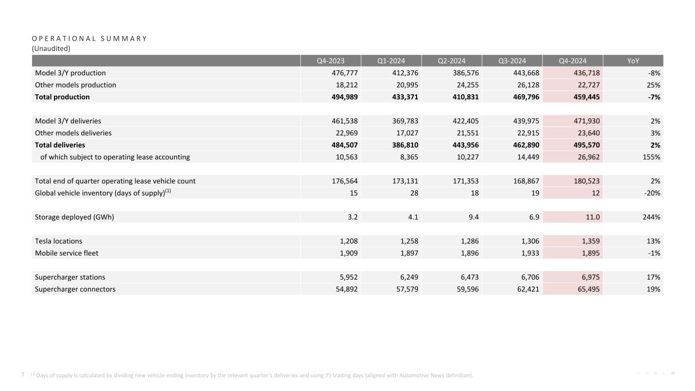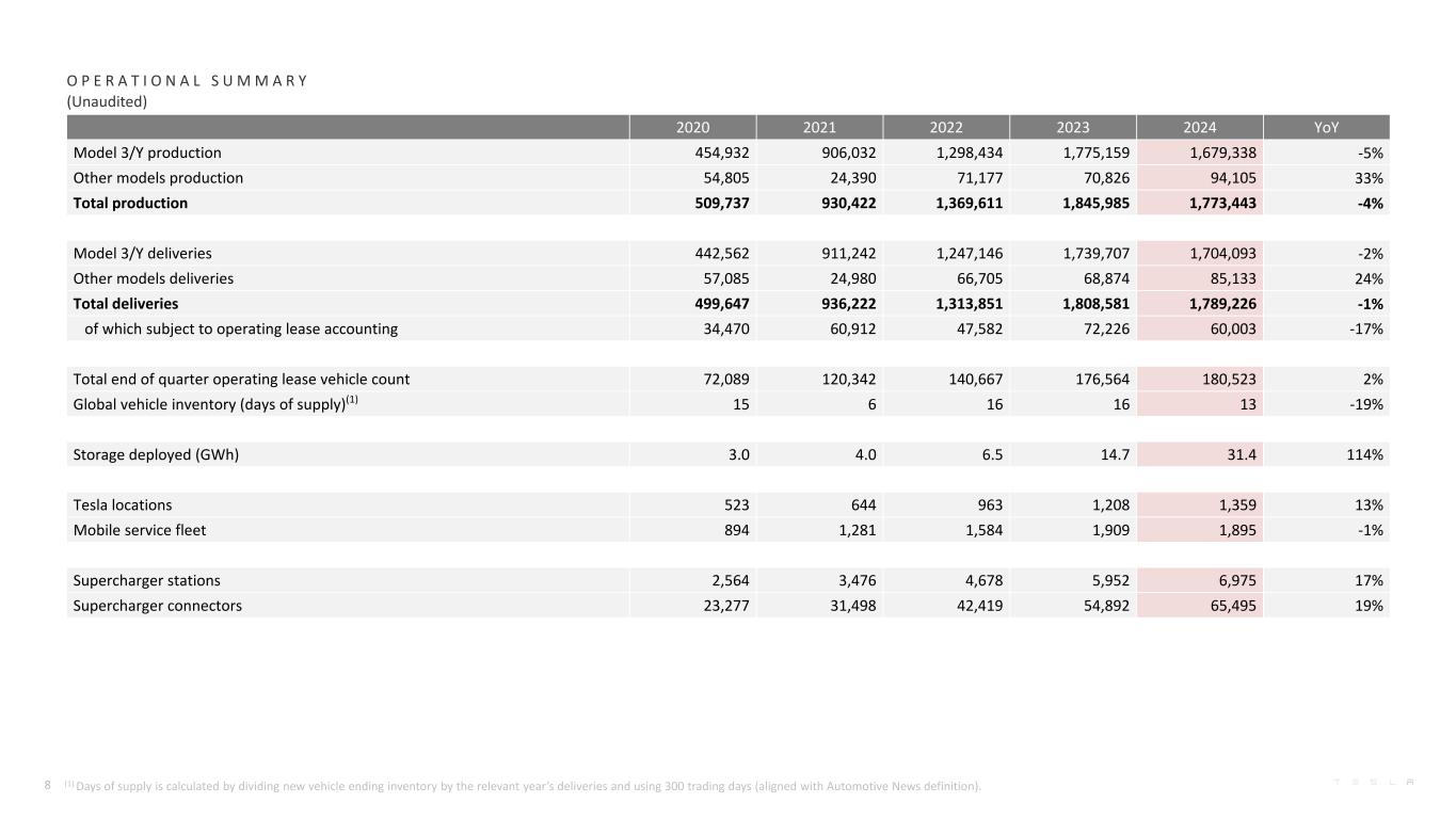 Q4-2023 Q1-2024 Q2-2024 Q3-2024 Q4-2024 YoY Model 3/Y production 476,777 412,376 386,576 443,668 436,718 -8% Other models production 18,212 20,995 24,255 26,128 22,727 25% Total production 494,989 433,371 410,831 469,796 459,445 -7% Model 3/Y deliveries 461,538 369,783 422,405 439,975 471,930 2% Other models deliveries 22,969 17,027 21,551 22,915 23,640 3% Total deliveries 484,507 386,810 443,956 462,890 495,570 2% of which subject to operating lease accounting 10,563 8,365 10,227 14,449 26,962 155% Total end of quarter operating lease vehicle count 176,564 173,131 171,353 168,867 180,523 2% Global vehicle inventory (days of supply)(1) 15 28 18 19 12 -20% Storage deployed (GWh) 3.2 4.1 9.4 6.9 11.0 244% Tesla locations 1,208 1,258 1,286 1,306 1,359 13% Mobile service fleet 1,909 1,897 1,896 1,933 1,895 -1% Supercharger stations 5,952 6,249 6,473 6,706 6,975 17% Supercharger connectors 54,892 57,579 59,596 62,421 65,495 19% (1) Days of supply is calculated by dividing new vehicle ending inventory by the relevant quarter’s deliveries and using 75 trading days (aligned with Automotive News definition). O P E R A T I O N A L S U M M A R Y (Unaudited) 7