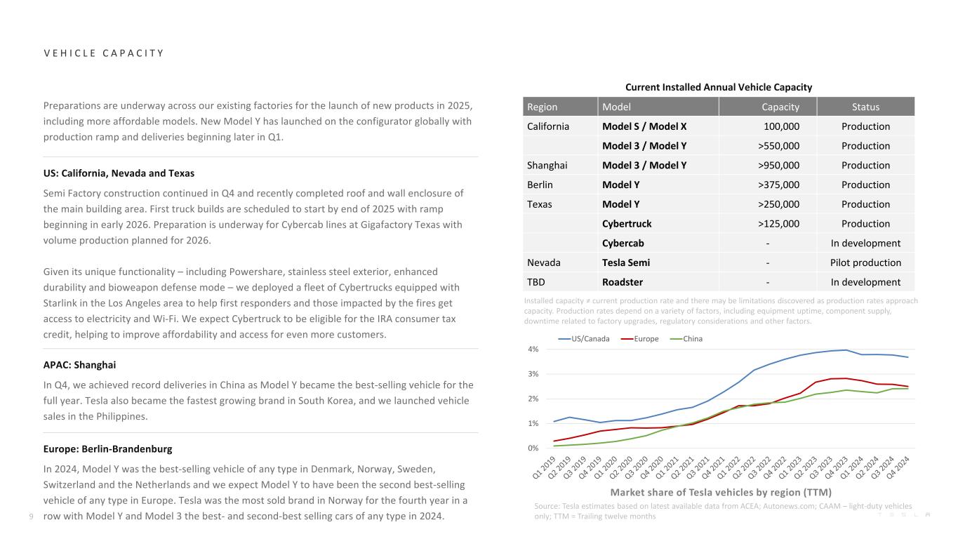 V E H I C L E C A P A C I T Y Current Installed Annual Vehicle Capacity Region Model Capacity Status California Model S / Model X 100,000 Production Model 3 / Model Y >550,000 Production Shanghai Model 3 / Model Y >950,000 Production Berlin Model Y >375,000 Production Texas Model Y >250,000 Production Cybertruck >125,000 Production Cybercab - In development Nevada Tesla Semi - Pilot production TBD Roadster - In development Installed capacity ≠ current production rate and there may be limitations discovered as production rates approach capacity. Production rates depend on a variety of factors, including equipment uptime, component supply, downtime related to factory upgrades, regulatory considerations and other factors. Market share of Tesla vehicles by region (TTM) Source: Tesla estimates based on latest available data from ACEA; Autonews.com; CAAM – light-duty vehicles only; TTM = Trailing twelve months Preparations are underway across our existing factories for the launch of new products in 2025, including more affordable models. New Model Y has launched on the configurator globally with production ramp and deliveries beginning later in Q1. US: California, Nevada and Texas Semi Factory construction continued in Q4 and recently completed roof and wall enclosure of the main building area. First truck builds are scheduled to start by end of 2025 with ramp beginning in early 2026. Preparation is underway for Cybercab lines at Gigafactory Texas with volume production planned for 2026. Given its unique functionality – including Powershare, stainless steel exterior, enhanced durability and bioweapon defense mode – we deployed a fleet of Cybertrucks equipped with Starlink in the Los Angeles area to help first responders and those impacted by the fires get access to electricity and Wi-Fi. We expect Cybertruck to be eligible for the IRA consumer tax credit, helping to improve affordability and access for even more customers. APAC: Shanghai In Q4, we achieved record deliveries in China as Model Y became the best-selling vehicle for the full year. Tesla also became the fastest growing brand in South Korea, and we launched vehicle sales in the Philippines. Europe: Berlin-Brandenburg In 2024, Model Y was the best-selling vehicle of any type in Denmark, Norway, Sweden, Switzerland and the Netherlands and we expect Model Y to have been the second best-selling vehicle of any type in Europe. Tesla was the most sold brand in Norway for the fourth year in a row with Model Y and Model 3 the best- and second-best selling cars of any type in 2024.9 0% 1% 2% 3% 4% US/Canada Europe China