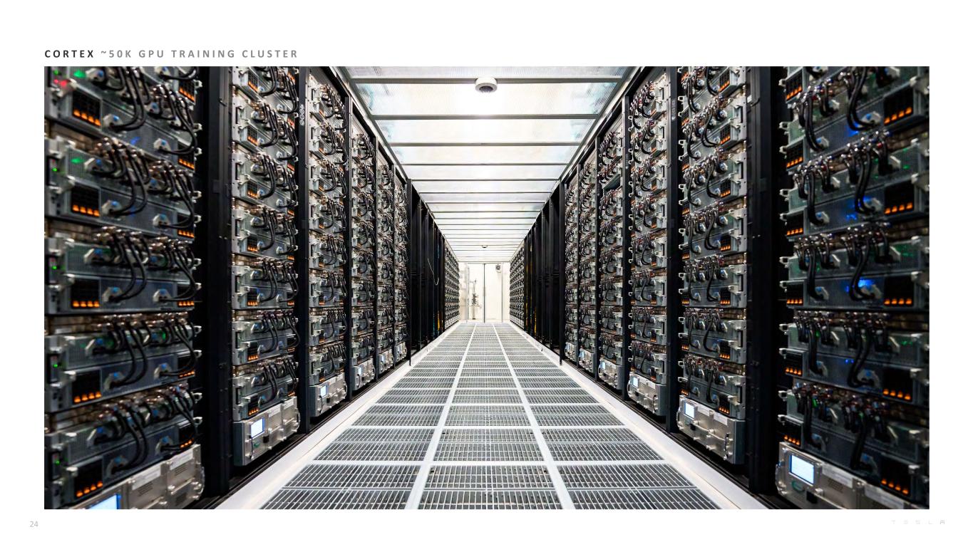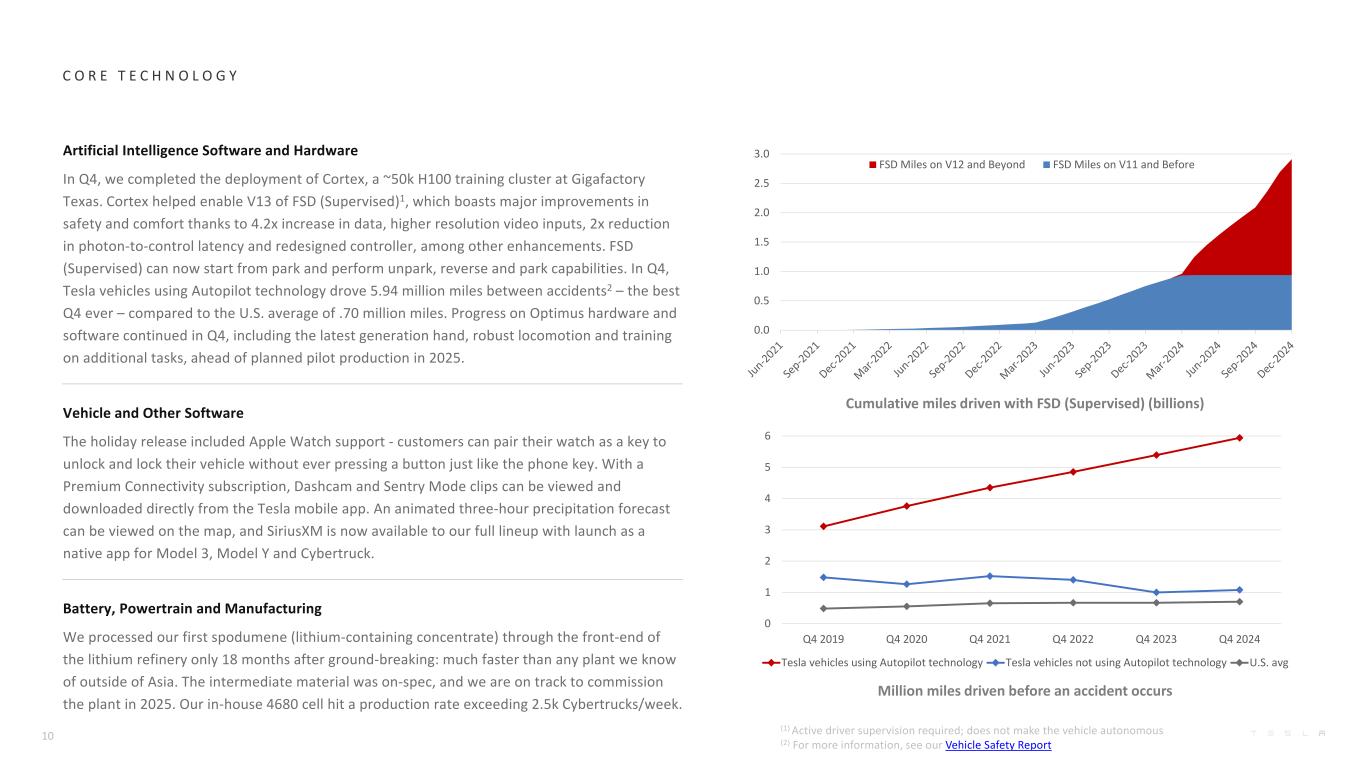 Million miles driven before an accident occurs C O R E T E C H N O L O G Y Cumulative miles driven with FSD (Supervised) (billions) Artificial Intelligence Software and Hardware In Q4, we completed the deployment of Cortex, a ~50k H100 training cluster at Gigafactory Texas. Cortex helped enable V13 of FSD (Supervised)1, which boasts major improvements in safety and comfort thanks to 4.2x increase in data, higher resolution video inputs, 2x reduction in photon-to-control latency and redesigned controller, among other enhancements. FSD (Supervised) can now start from park and perform unpark, reverse and park capabilities. In Q4, Tesla vehicles using Autopilot technology drove 5.94 million miles between accidents2 – the best Q4 ever – compared to the U.S. average of .70 million miles. Progress on Optimus hardware and software continued in Q4, including the latest generation hand, robust locomotion and training on additional tasks, ahead of planned pilot production in 2025. Vehicle and Other Software The holiday release included Apple Watch support - customers can pair their watch as a key to unlock and lock their vehicle without ever pressing a button just like the phone key. With a Premium Connectivity subscription, Dashcam and Sentry Mode clips can be viewed and downloaded directly from the Tesla mobile app. An animated three-hour precipitation forecast can be viewed on the map, and SiriusXM is now available to our full lineup with launch as a native app for Model 3, Model Y and Cybertruck. Battery, Powertrain and Manufacturing We processed our first spodumene (lithium-containing concentrate) through the front-end of the lithium refinery only 18 months after ground-breaking: much faster than any plant we know of outside of Asia. The intermediate material was on-spec, and we are on track to commission the plant in 2025. Our in-house 4680 cell hit a production rate exceeding 2.5k Cybertrucks/week. 10 (1) Active driver supervision required; does not make the vehicle autonomous (2) For more information, see our Vehicle Safety Report 0.0 0.5 1.0 1.5 2.0 2.5 3.0 FSD Miles on V12 and Beyond FSD Miles on V11 and Before 0 1 2 3 4 5 6 Q4 2019 Q4 2020 Q4 2021 Q4 2022 Q4 2023 Q4 2024 Tesla vehicles using Autopilot technology Tesla vehicles not using Autopilot technology U.S. avg