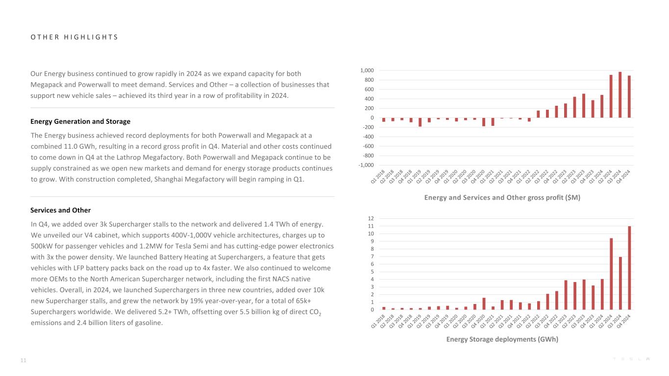 O T H E R H I G H L I G H T S Energy Storage deployments (GWh) Energy and Services and Other gross profit ($M) Our Energy business continued to grow rapidly in 2024 as we expand capacity for both Megapack and Powerwall to meet demand. Services and Other – a collection of businesses that support new vehicle sales – achieved its third year in a row of profitability in 2024. Energy Generation and Storage The Energy business achieved record deployments for both Powerwall and Megapack at a combined 11.0 GWh, resulting in a record gross profit in Q4. Material and other costs continued to come down in Q4 at the Lathrop Megafactory. Both Powerwall and Megapack continue to be supply constrained as we open new markets and demand for energy storage products continues to grow. With construction completed, Shanghai Megafactory will begin ramping in Q1. Services and Other In Q4, we added over 3k Supercharger stalls to the network and delivered 1.4 TWh of energy. We unveiled our V4 cabinet, which supports 400V-1,000V vehicle architectures, charges up to 500kW for passenger vehicles and 1.2MW for Tesla Semi and has cutting-edge power electronics with 3x the power density. We launched Battery Heating at Superchargers, a feature that gets vehicles with LFP battery packs back on the road up to 4x faster. We also continued to welcome more OEMs to the North American Supercharger network, including the first NACS native vehicles. Overall, in 2024, we launched Superchargers in three new countries, added over 10k new Supercharger stalls, and grew the network by 19% year-over-year, for a total of 65k+ Superchargers worldwide. We delivered 5.2+ TWh, offsetting over 5.5 billion kg of direct CO2 emissions and 2.4 billion liters of gasoline. 11 0 1 2 3 4 5 6 7 8 9 10 11 12 -1,000 -800 -600 -400 -200 0 200 400 600 800 1,000