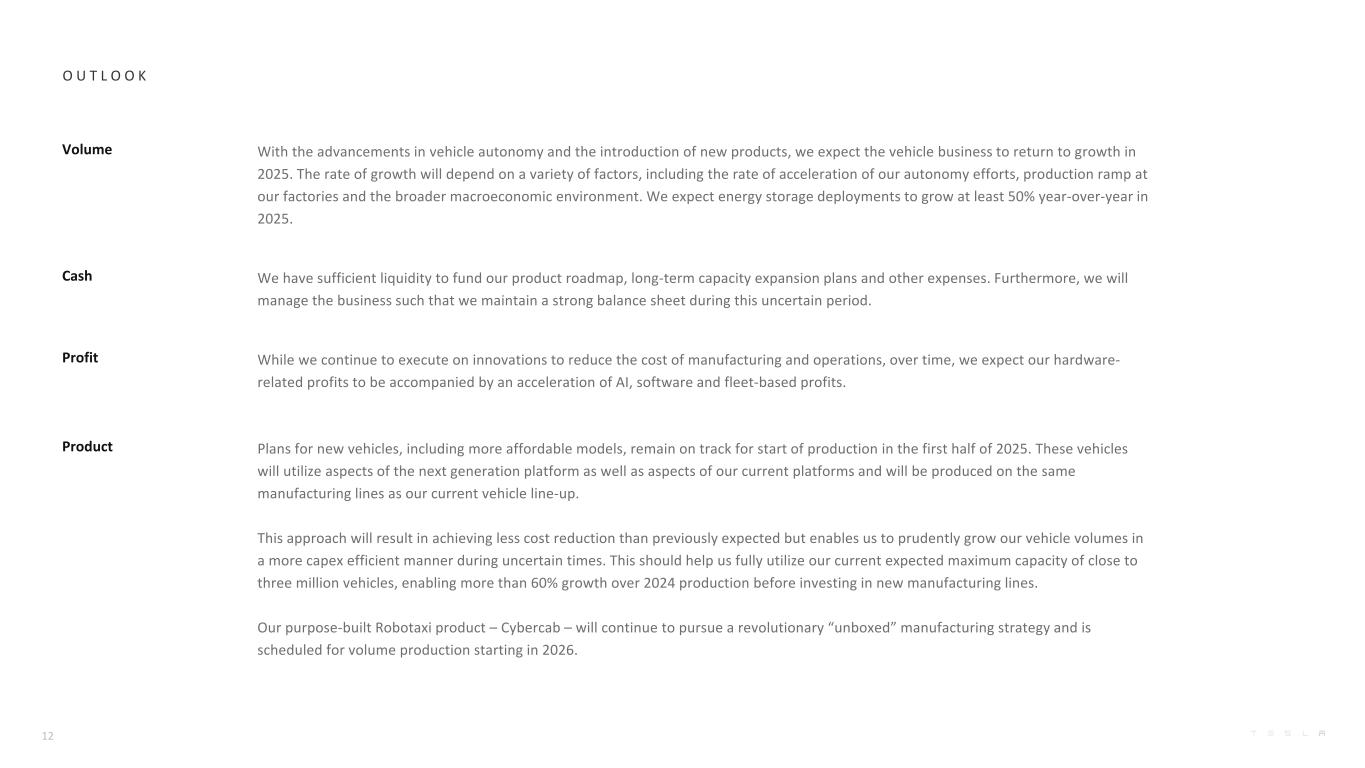 O U T L O O K Volume With the advancements in vehicle autonomy and the introduction of new products, we expect the vehicle business to return to growth in 2025. The rate of growth will depend on a variety of factors, including the rate of acceleration of our autonomy efforts, production ramp at our factories and the broader macroeconomic environment. We expect energy storage deployments to grow at least 50% year-over-year in 2025. Cash We have sufficient liquidity to fund our product roadmap, long-term capacity expansion plans and other expenses. Furthermore, we will manage the business such that we maintain a strong balance sheet during this uncertain period. Profit While we continue to execute on innovations to reduce the cost of manufacturing and operations, over time, we expect our hardware- related profits to be accompanied by an acceleration of AI, software and fleet-based profits. Product Plans for new vehicles, including more affordable models, remain on track for start of production in the first half of 2025. These vehicles will utilize aspects of the next generation platform as well as aspects of our current platforms and will be produced on the same manufacturing lines as our current vehicle line-up. This approach will result in achieving less cost reduction than previously expected but enables us to prudently grow our vehicle volumes in a more capex efficient manner during uncertain times. This should help us fully utilize our current expected maximum capacity of close to three million vehicles, enabling more than 60% growth over 2024 production before investing in new manufacturing lines. Our purpose-built Robotaxi product – Cybercab – will continue to pursue a revolutionary “unboxed” manufacturing strategy and is scheduled for volume production starting in 2026. 12