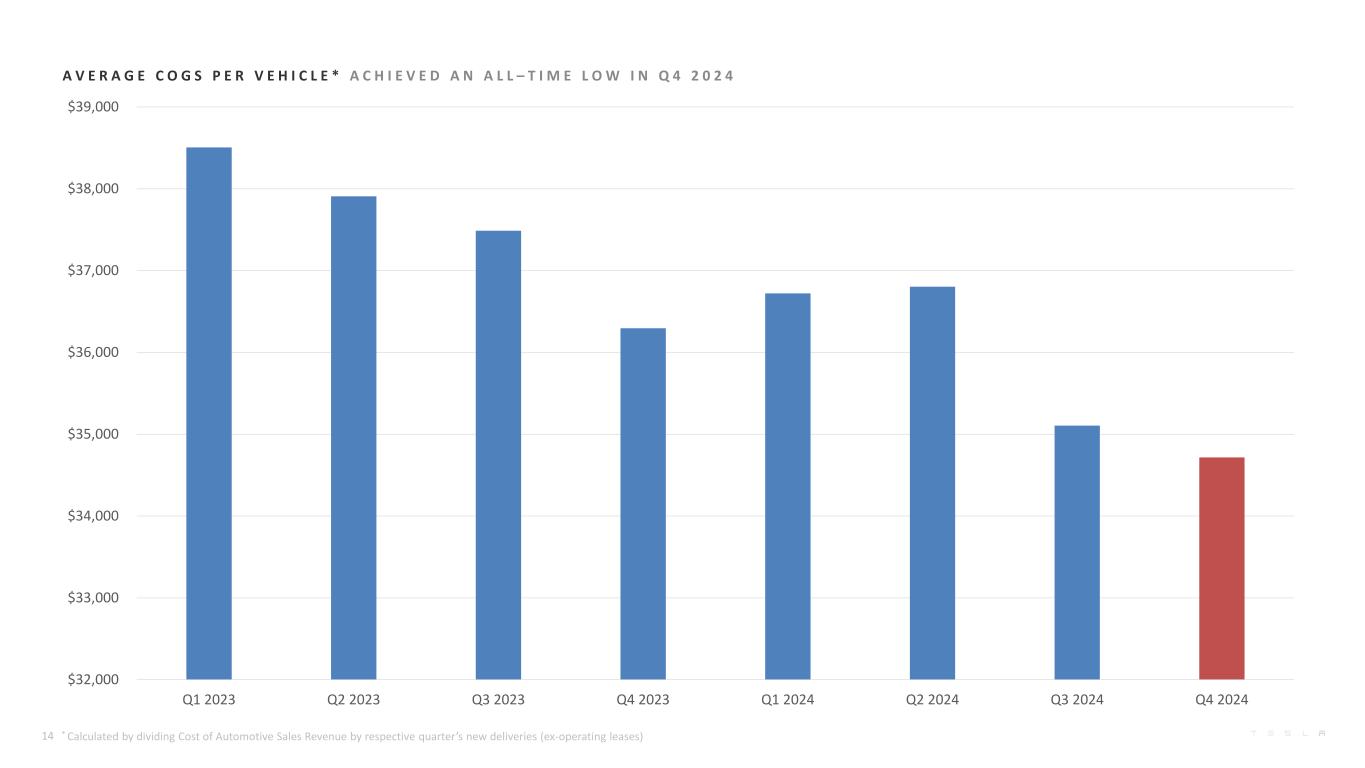 S U M M A R YH I G H L I G H T S (1) Excludes SBC (stock-based compensation), net of tax; (2) Free cash flow = operating cash flow less capex; (3) Includes cash, cash equivalents and investments; (4) Active driver supervision required; does not make the vehicle autonomous; (5) Calculated by dividing Cost of Automotive Sales Revenue by respective quarter’s new deliveries (ex-operating leases) Profitability $7.1B GAAP operating income in 2024; $1.6B in Q4 $7.1B GAAP net income in 2024; $2.3B in Q4 incl. $0.6B mark-to-market gain on digital assets $8.4B non-GAAP net income1 in 2024; $2.6B in Q4 Q4 was a record quarter for both vehicle deliveries and energy storage deployments. We expect Model Y to once again be the best-selling vehicle, of any kind, globally for the full year 2024, and we have made it even better, with the New Model Y now launched in all markets. In 2024, we made significant investments in infrastructure that will spur the next wave of growth for the company, including vehicle manufacturing capabilities for new models, AI training compute and energy storage manufacturing capacity. Affordability remains top of mind for customers, and we continue to review every aspect of our cost of goods sold (COGS) per vehicle5 to help alleviate this concern. In Q4, COGS per vehicle reached its lowest level ever at <$35,000, driven largely by raw material cost improvement, helping us to partially offset our investment in compelling financing and lease options. The Energy business achieved another record in Q4 with its highest-ever gross profit generation. Construction of Megafactory Shanghai was completed in December and will begin ramping this quarter. Powerwall deployments achieved another record quarter as we continue to ramp Powerwall 3 production and launch in additional markets. 2025 will be a seminal year in Tesla’s history as FSD (Supervised) continues to rapidly improve with the aim of ultimately exceeding human levels of safety. This will eventually unlock an unsupervised FSD option for our customers and the Robotaxi business, which we expect to begin launching later this year in parts of the U.S. We also continue to work on launching FSD (Supervised) in Europe and China in 2025. Cash Operating cash flow of $14.9B in 2024; $4.8B in Q4 Free cash flow2 of $3.6B in 2024; $2.0B in Q4 $7.5B increase in our cash and investments3 in 2024 to $36.6B Operations Increased AI training compute by over 400% in 2024 Over three billion miles driven cumulatively on FSD (Supervised)4 as of January Completed construction of Megafactory Shanghai 3