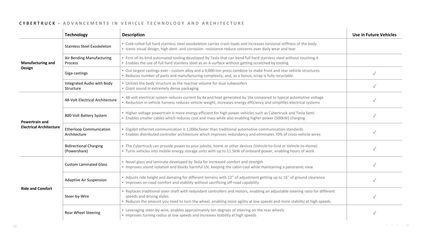 C Y B E R T R U C K - A D V A N C E M E N T S I N V E H I C L E T E C H N O L O G Y A N D A R C H I T E C T U R E 15 Technology Description Use in Future Vehicles Manufacturing and Design Stainless Steel Exoskeleton • Cold-rolled full hard stainless steel exoskeleton carries crash loads and increases torsional stiffness of the body • Iconic visual design; high dent- and corrosion- resistance reduce concerns over daily wear and tear Air Bending Manufacturing Process • First-of-its-kind automated tooling developed by Tesla that can bend full hard stainless steel without touching it • Enables the use of full hard stainless steel as an A-surface without getting scratched by tooling Giga-castings • Our largest castings ever - custom alloy and a 9,000-ton press combine to make front and rear vehicle structures • Reduces number of parts and manufacturing complexity, and, as a bonus, scrap is fully recyclable ✓ Integrated Audio with Body Structure • Utilizes the body structure as the reactive volume for dual subwoofers • Giant sound in extremely dense packaging ✓ Powertrain and Electrical Architecture 48-Volt Electrical Architecture • 48-volt electrical system reduces current by 4x and heat generated by 16x compared to typical automotive voltage • Reduction in vehicle harness reduces vehicle weight, increases energy efficiency and simplifies electrical systems ✓ 800-Volt Battery System • Higher voltage powertrain is more energy efficient for high power vehicles such as Cybertruck and Tesla Semi • Enables smaller cables which reduces cost and mass while also enabling higher power (500kW) charging ✓ Etherloop Communication Architecture • Gigabit ethernet communication is 1,000x faster than traditional automotive communication standards • Enables distributed controller architecture which improves redundancy and eliminates 70% of cross-vehicle wires ✓ Bidirectional Charging (Powershare) • The Cybertruck can provide power to your jobsite, home or other devices (Vehicle-to-Grid or Vehicle-to-Home) • Turns vehicles into mobile energy storage units with up to 11.5kW of onboard power, enabling hours of work ✓ Ride and Comfort Custom Laminated Glass • Novel glass and laminate developed by Tesla for increased comfort and strength • Improves sound isolation and blocks harmful UV, keeping the cabin cool while maintaining a panoramic view ✓ Adaptive Air Suspension • Adjusts ride height and damping for different terrains with 12” of adjustment getting up to 16” of ground clearance • Improves on-road comfort and stability without sacrificing off-road capability ✓ Steer-by-Wire • Replaces traditional steer shaft with redundant controllers and motors, enabling an adjustable steering ratio for different speeds and driving styles • Reduces the amount you need to turn the wheel, enabling more agility at low speeds and more stability at high speeds ✓ Rear Wheel Steering • Leveraging steer-by-wire, enables approximately ten degrees of steering on the rear wheels • Improves turning radius at low speeds and increases stability at high speeds ✓