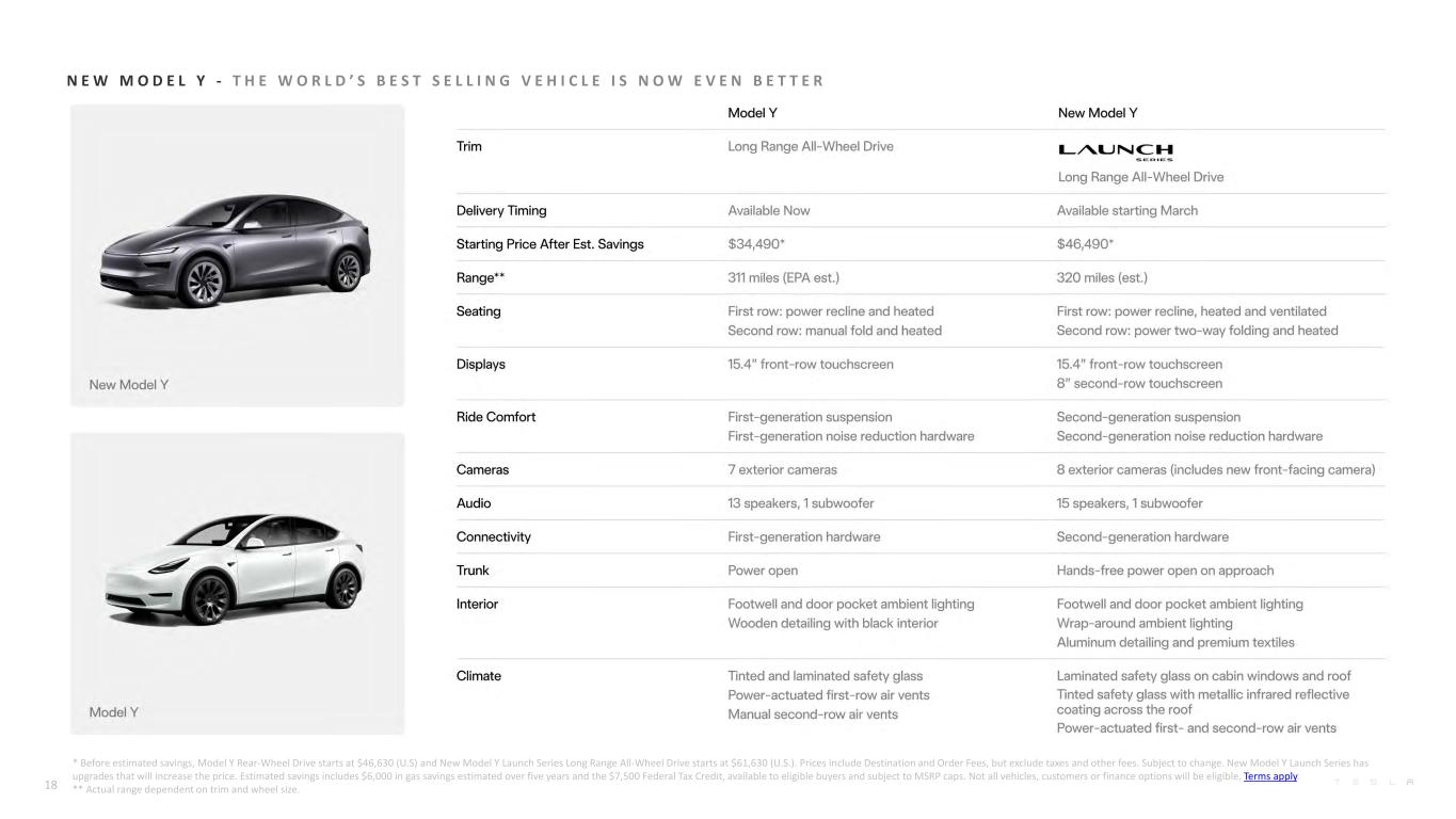 N E W M O D E L Y - T H E W O R L D ’ S B E S T S E L L I N G V E H I C L E I S N O W E V E N B E T T E R 18 * Before estimated savings, Model Y Rear-Wheel Drive starts at $46,630 (U.S) and New Model Y Launch Series Long Range All-Wheel Drive starts at $61,630 (U.S.). Prices include Destination and Order Fees, but exclude taxes and other fees. Subject to change. New Model Y Launch Series has upgrades that will increase the price. Estimated savings includes $6,000 in gas savings estimated over five years and the $7,500 Federal Tax Credit, available to eligible buyers and subject to MSRP caps. Not all vehicles, customers or finance options will be eligible. Terms apply. ** Actual range dependent on trim and wheel size.