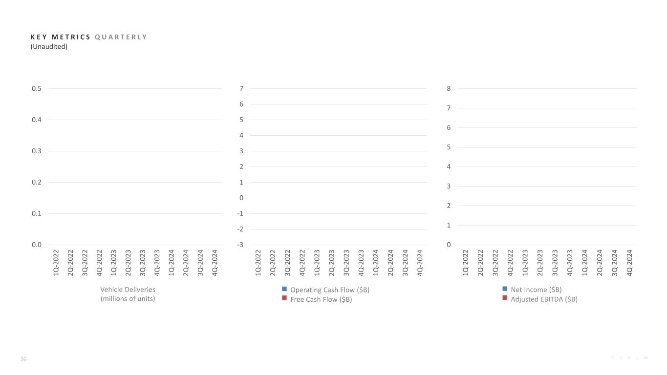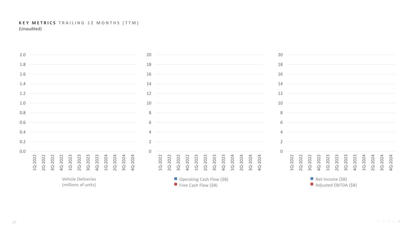 Vehicle Deliveries (millions of units) K E Y M E T R I C S Q U A R T E R L Y (Unaudited) Operating Cash Flow ($B) Free Cash Flow ($B) Net Income ($B) Adjusted EBITDA ($B) 26 0.0 0.1 0.2 0.3 0.4 0.5 1Q -2 02 2 2Q -2 02 2 3Q -2 02 2 4Q -2 02 2 1Q -2 02 3 2Q -2 02 3 3Q -2 02 3 4Q -2 02 3 1Q -2 02 4 2Q -2 02 4 3Q -2 02 4 4Q -2 02 4 -3 -2 -1 0 1 2 3 4 5 6 7 1Q -2 02 2 2Q -2 02 2 3Q -2 02 2 4Q -2 02 2 1Q -2 02 3 2Q -2 02 3 3Q -2 02 3 4Q -2 02 3 1Q -2 02 4 2Q -2 02 4 3Q -2 02 4 4Q -2 02 4 0 1 2 3 4 5 6 7 8 1Q -2 02 2 2Q -2 02 2 3Q -2 02 2 4Q -2 02 2 1Q -2 02 3 2Q -2 02 3 3Q -2 02 3 4Q -2 02 3 1Q -2 02 4 2Q -2 02 4 3Q -2 02 4 4Q -2 02 4